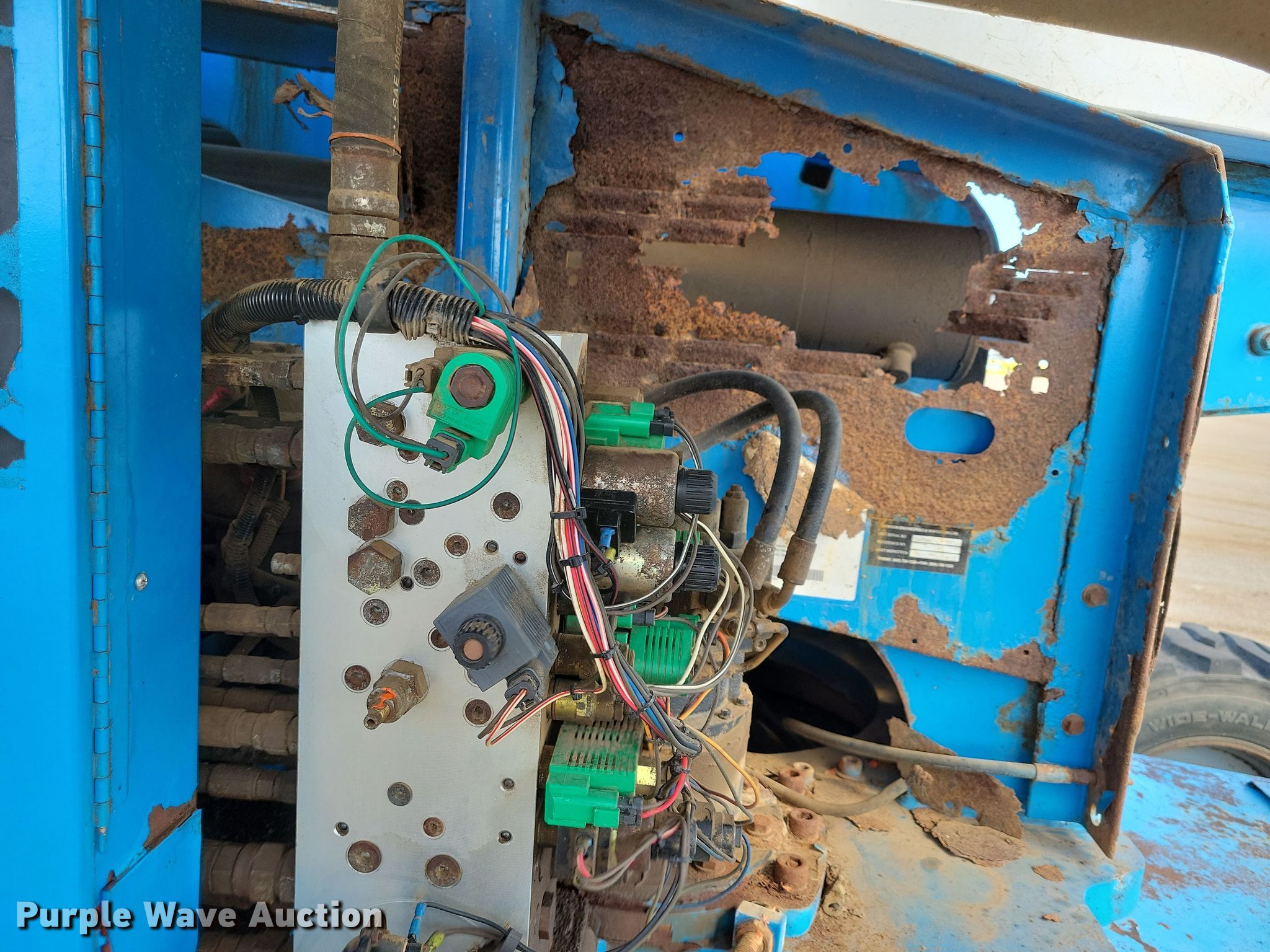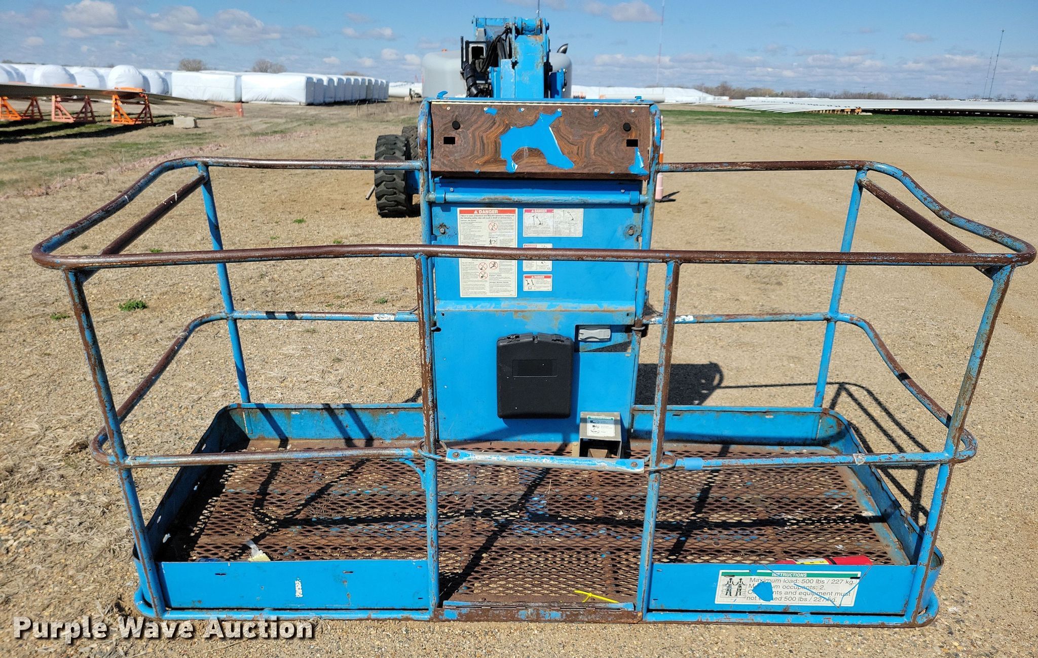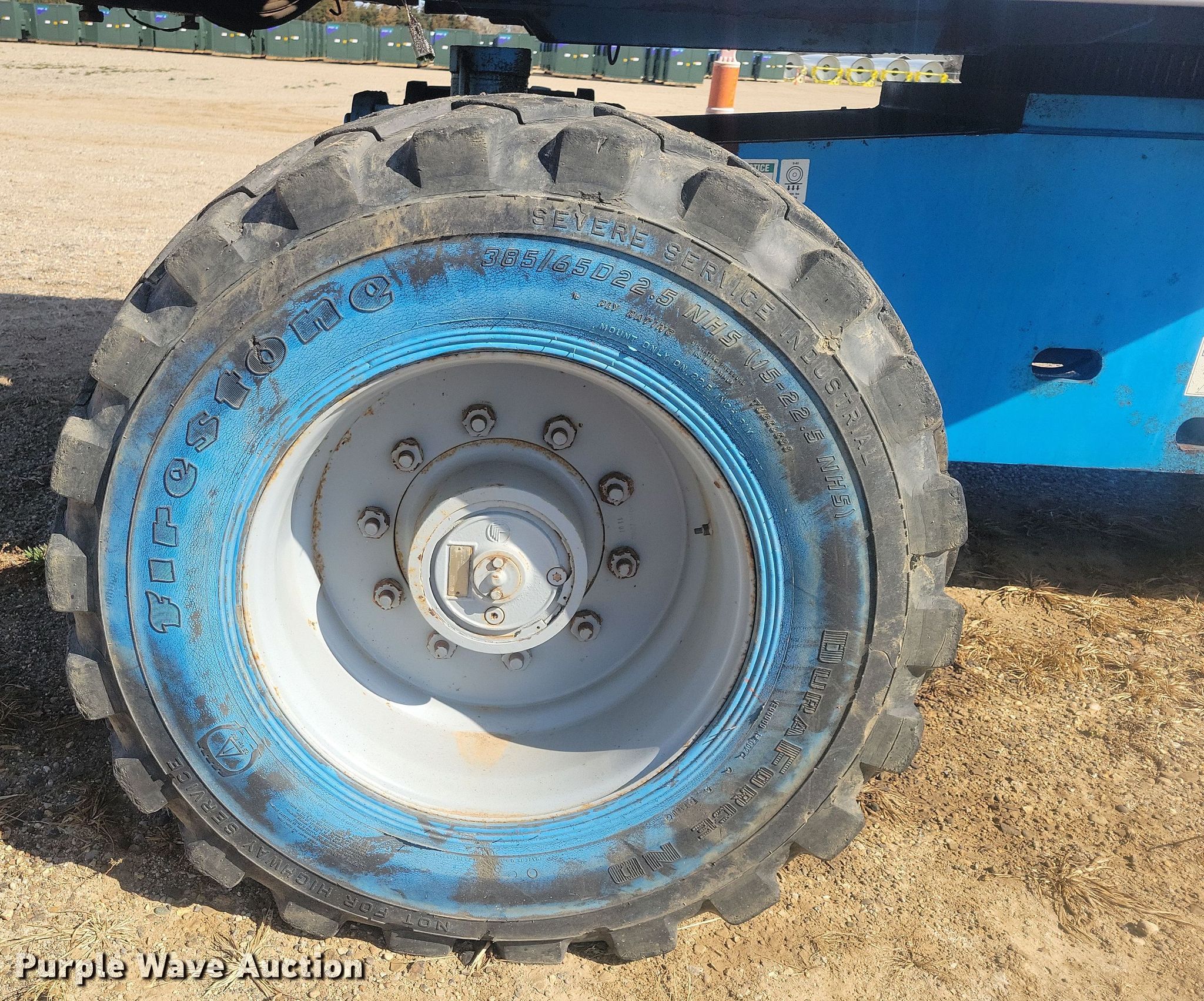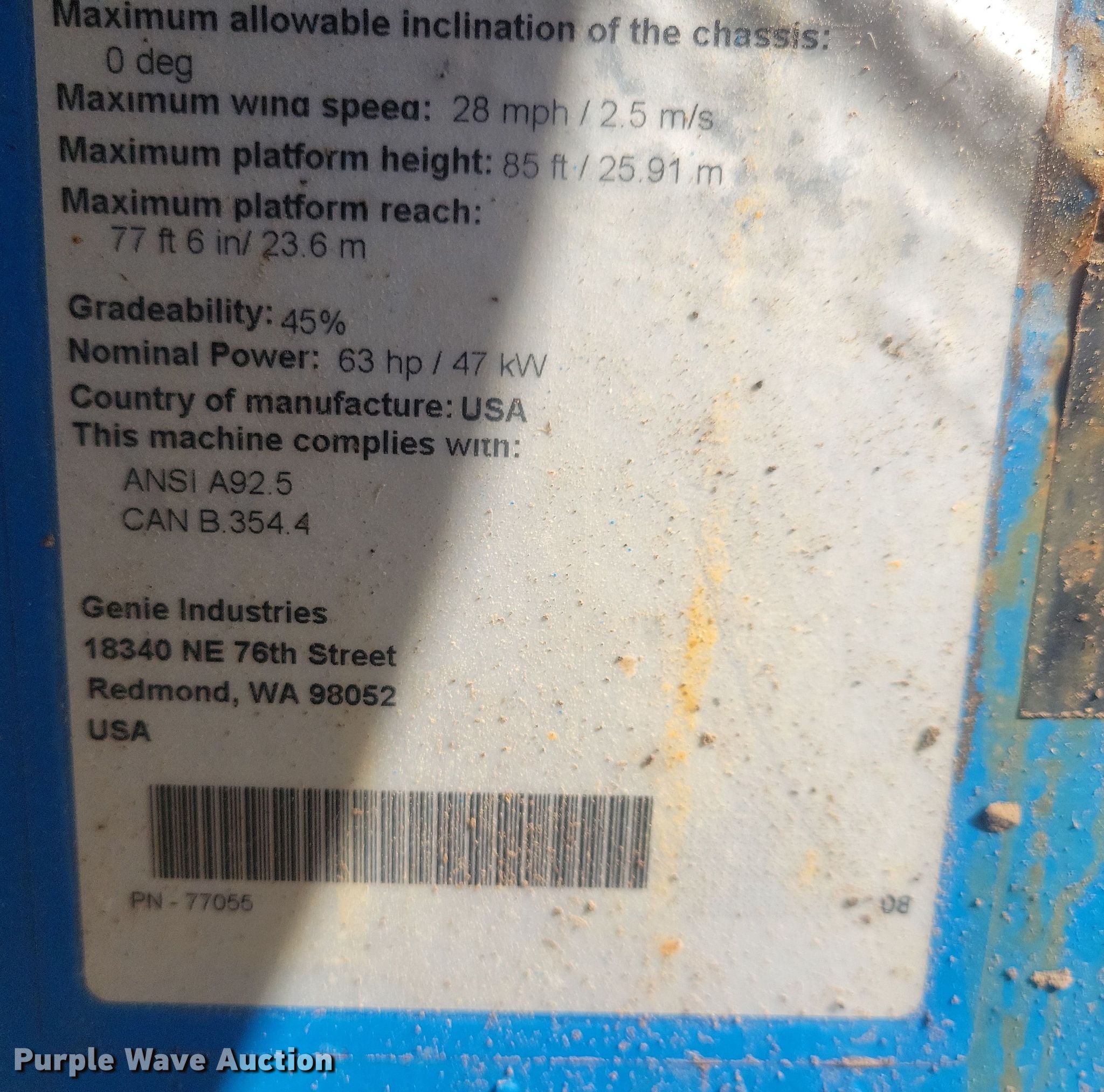 2008 Genie S-85 boom lift. Hours: 4,534 on meter, Serial: S8008-6744. Engine Engine Perkins 804C-33, Serial: S8008-6744, Displacement: 3.3L, Cylinders: 4, Fuel type: Diesel, HP: 63. Chassis Four wheel drive. Features Rough terrain, Boom type: Telescopic, Maximum lift capacity: 500 lbs, Maximum reach length: 77' 6", Maximum lift height: 85', Hydraulic leveling, Platform: 92" L x 33" W, AC power outlet, Controls: Platform, Ground. Tires Tire size: 385/65-22.5. Notes Engine issues Head gasket needs replaced, Oil in exhaust, Non-operational unit. Takkion. O'Neill, NE 68763