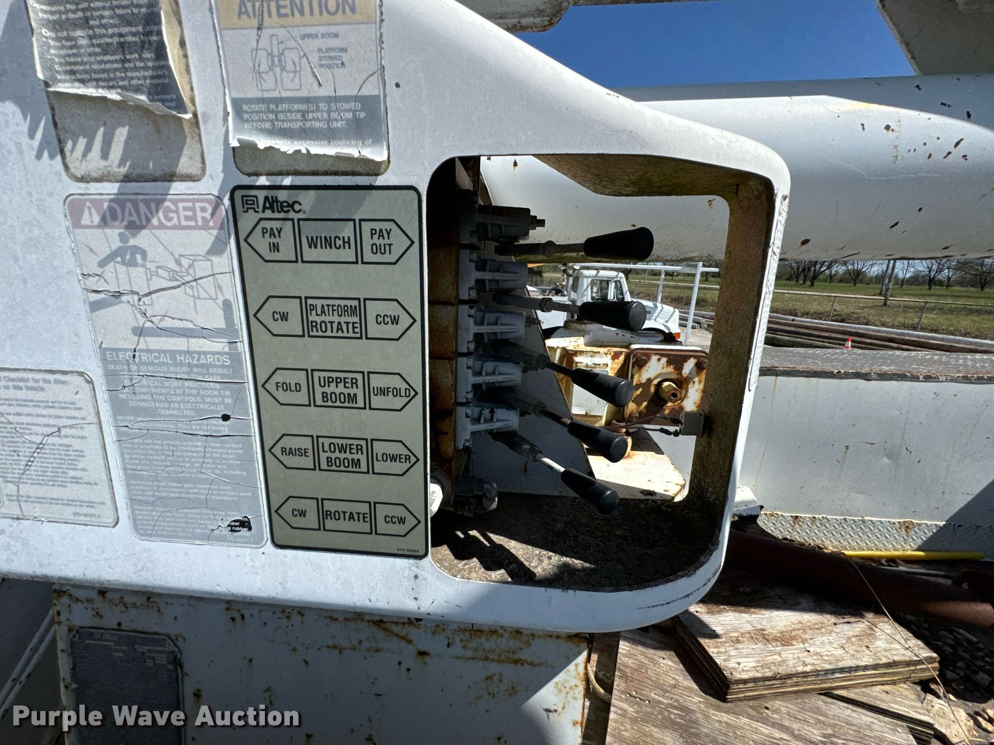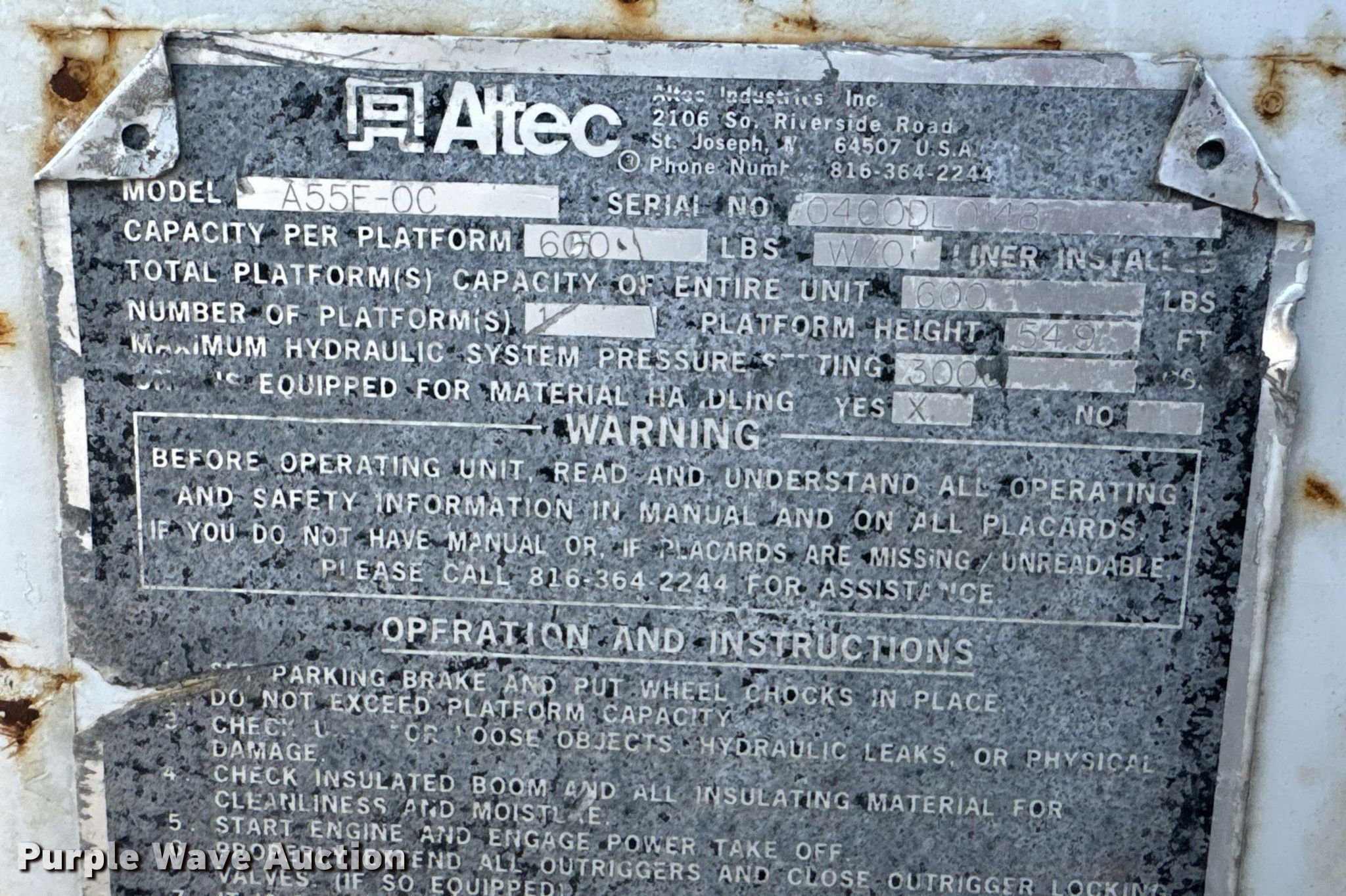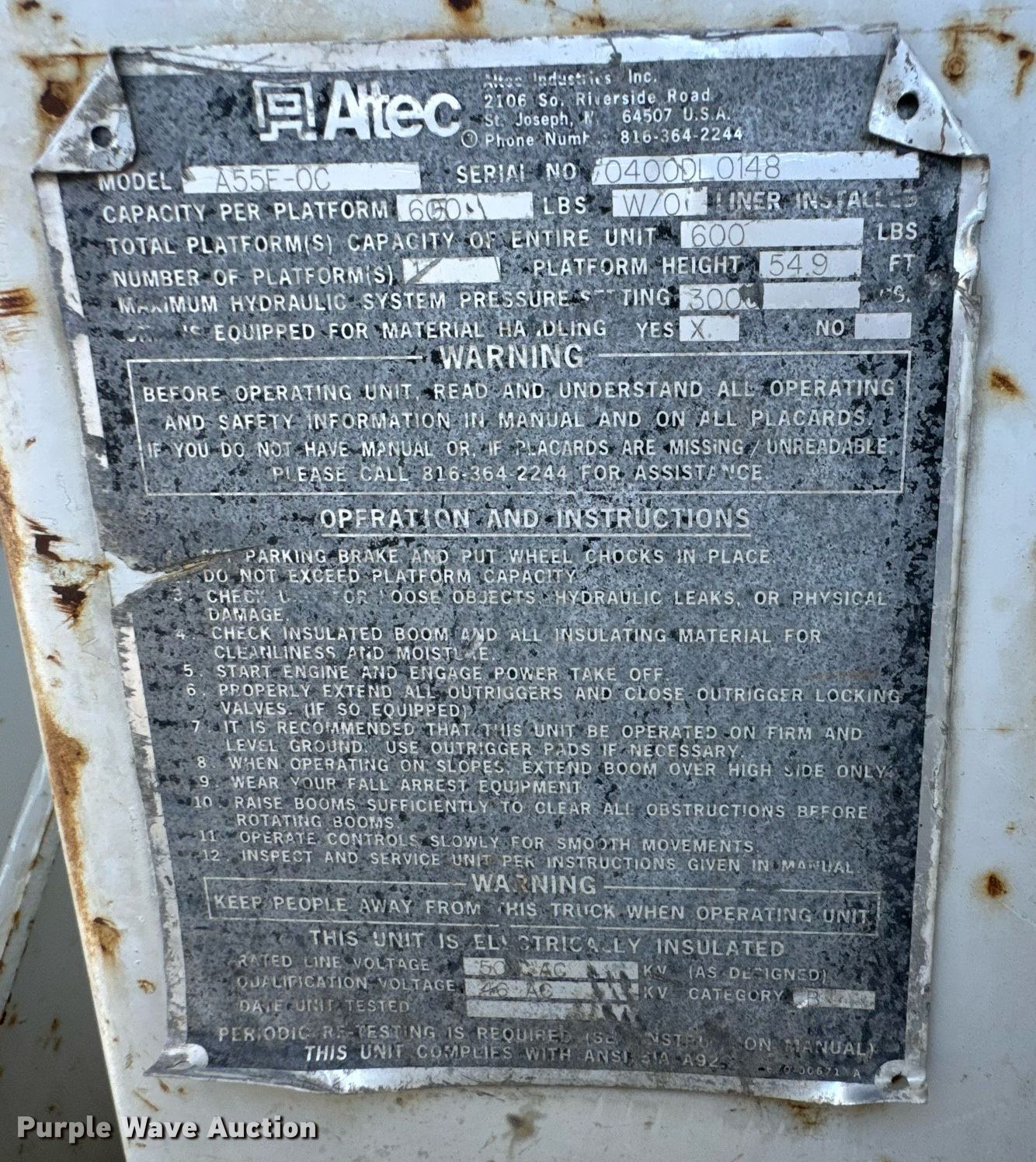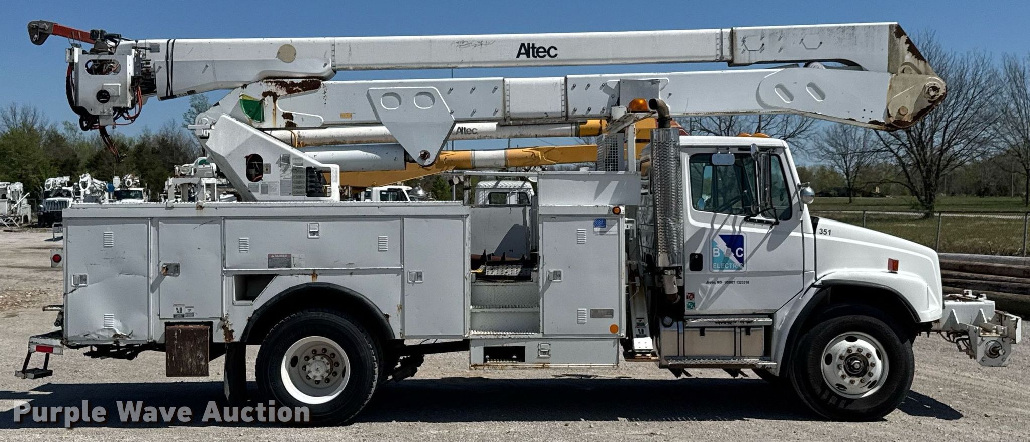 2001 Freightliner F80 bucket truck. Miles: 43,105 on odometer Actual mileage unknown, VIN: 1FV6JJBB11HH14452. Engine Caterpillar, Displacement: 7.2L, Cylinders: 6, Fuel type: Diesel. Transmission Eaton Fuller, Manual, Speed: 7. Chassis Axles: Single, Suspension: Spring, Brakes: Air, PTO. Interior AC, Heat, Heated mirrors, Cruise control, Auxiliary controls. Features Bed Altec, 17' L x 94" W, Boom Altec A55E-0C, Serial: 0400DL0148, Mast height: 55', Maximum lift capacity: 600 lbs, Boom type: Articulating, Insulated, Boom controls Ground, Platform/ basket.. Tires Front: 315/80R22.5, Rear: 11R22.5. Notes Contents not included, Bucket missing. Missouri title. Mileage has not been verified. Exempt will be written in the odometer disclosure on the title. Title distribution may be delayed up to 14 days from verification of funds. BBC Electrical Services. Joplin, MO 64804