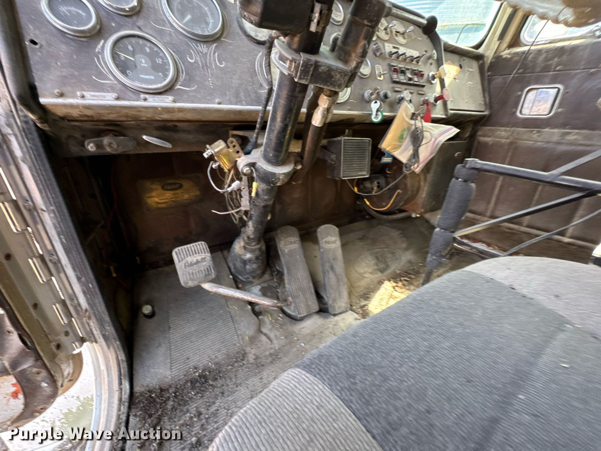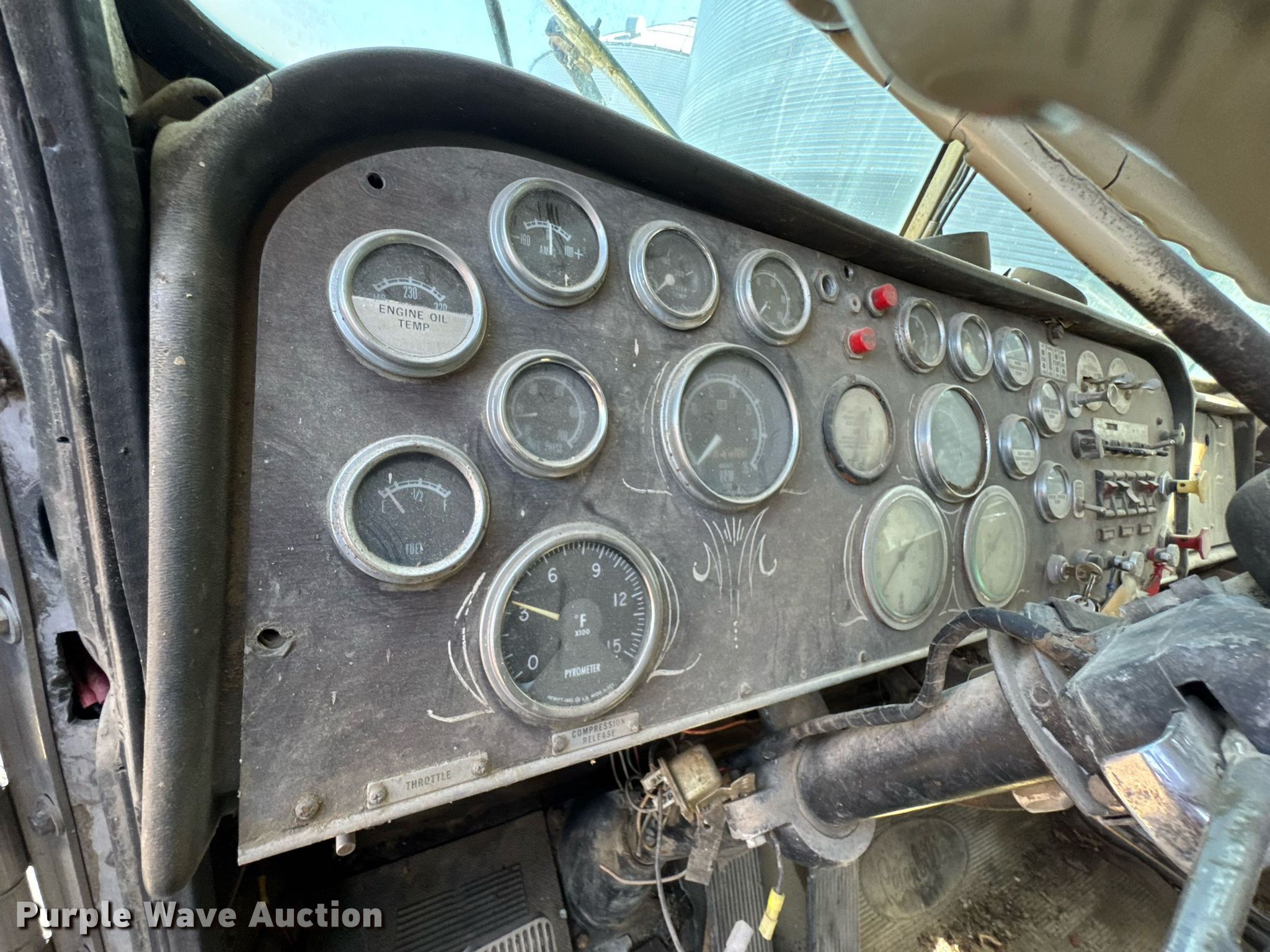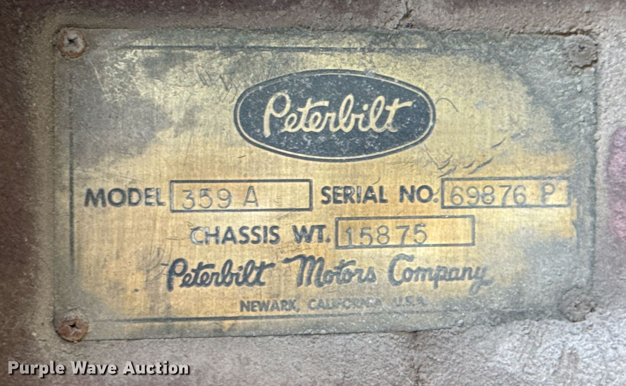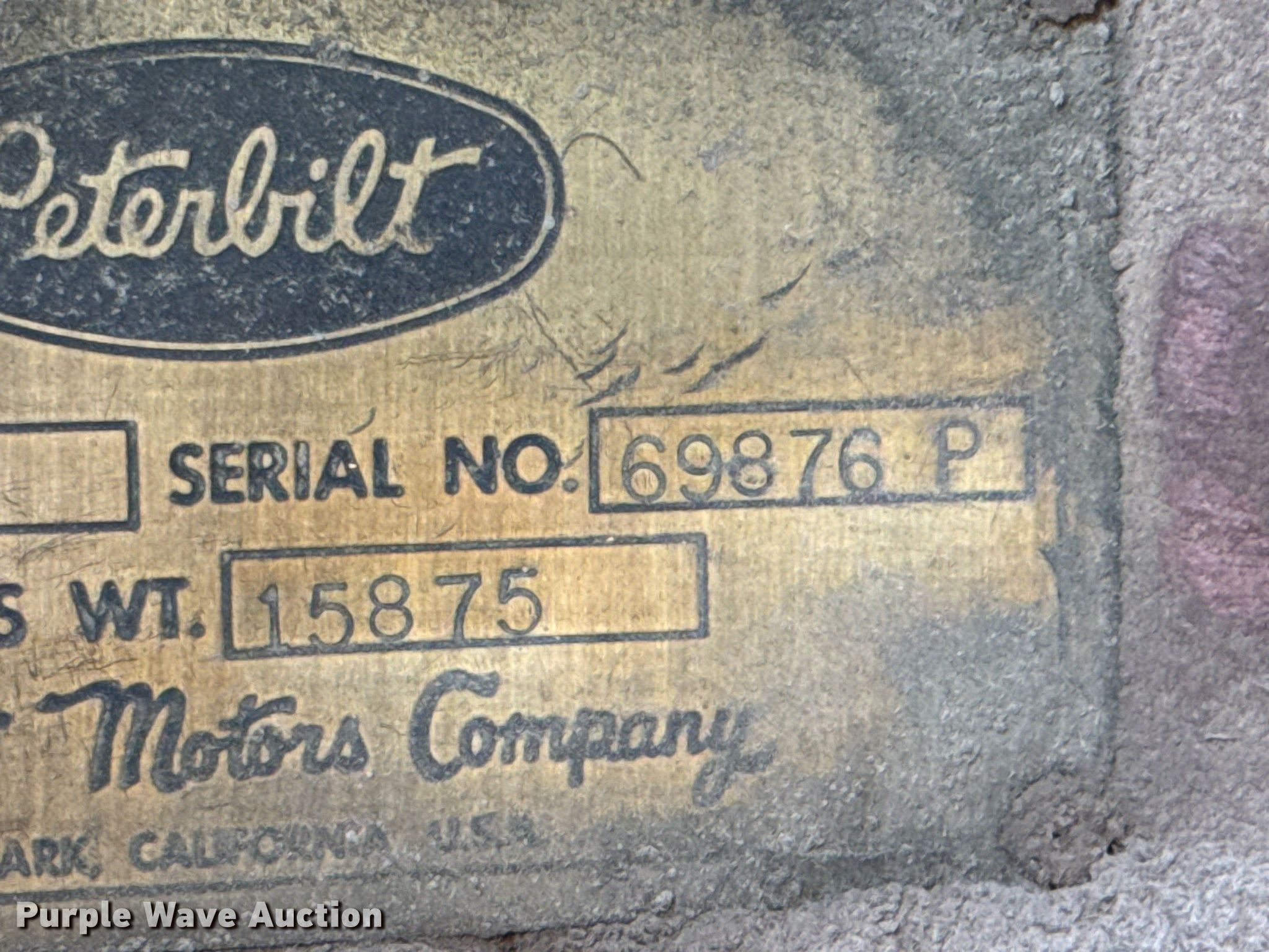 1975 Peterbilt 359A dump truck. Miles: 54,849 on odometer, Miles: 647, 936 on second odometer Actual mileage unknown, VIN: 69876P. Engine Caterpillar 3406, Cylinders: 6, Fuel type: Diesel, Engine brake. Transmission Manual, Speed: 9. Chassis Axles: Tandem, Differential lock: Inter-axle, Suspension: Spring over walking beam, Brakes: Air, PTO. Interior Heat. Features Dump bed 15' 6" L x 100" W, Side height: 42", Bed type: Steel, Barrel, Ram: Single, End gate: Air operated. Tires Front: 315/80R22.5, Rear: 11R22.5. Notes Unknown operating condition. Kansas antique title. Mileage has not been verified. Exempt will be written in the odometer disclosure on the title. Title distribution may be delayed up to 30 days from verification of funds. Chanute, KS 66720