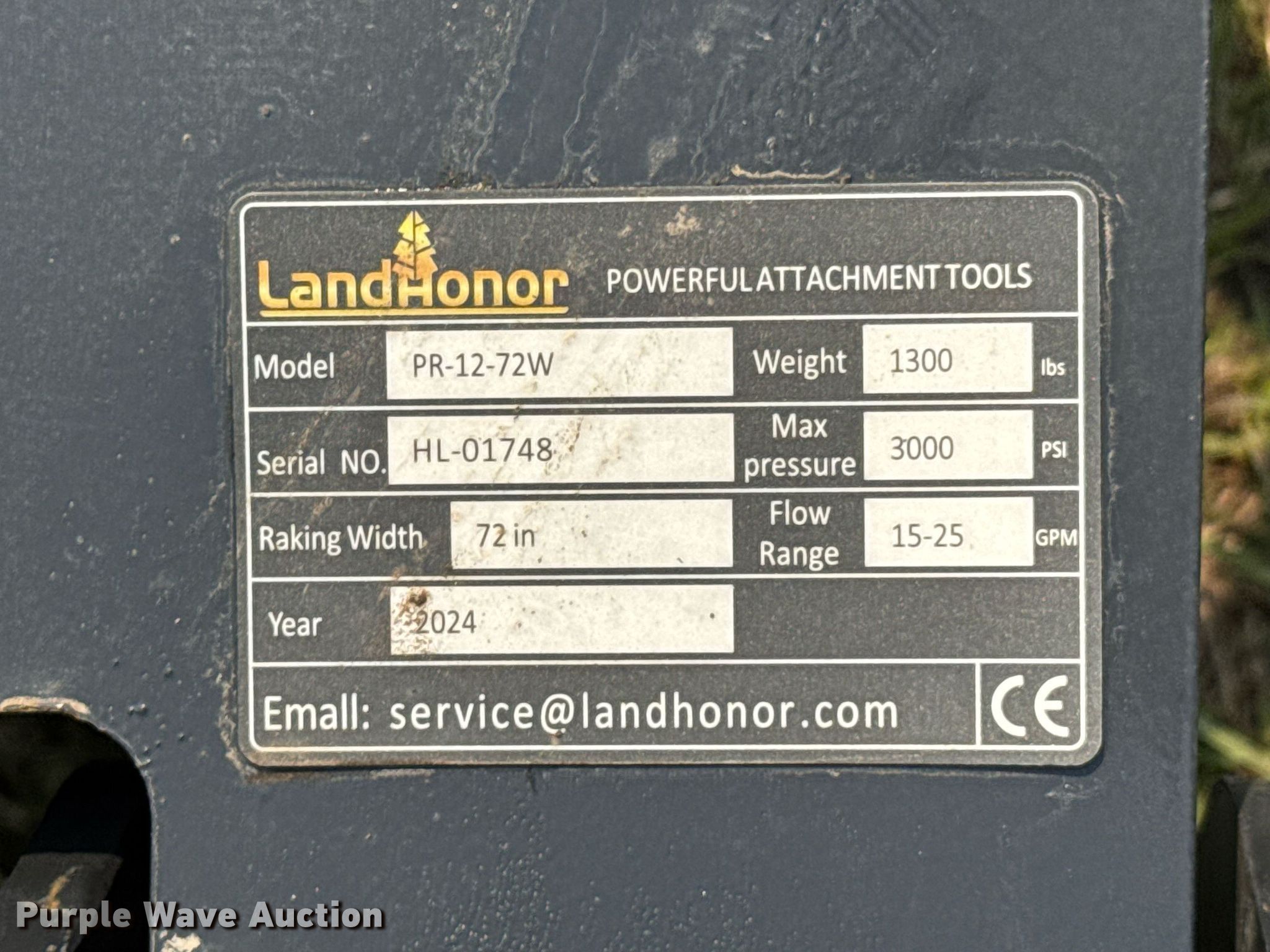 Take a look at this used 2024 LandHonor PR-12-72W skid steer power rake being sold on May 8th, 2025 in the SOLD! May 08 Construction Equipment Auction made by LandHonor. Take a look at all of the item information below or take a look at similar auctions for Skid Steer Loaders.