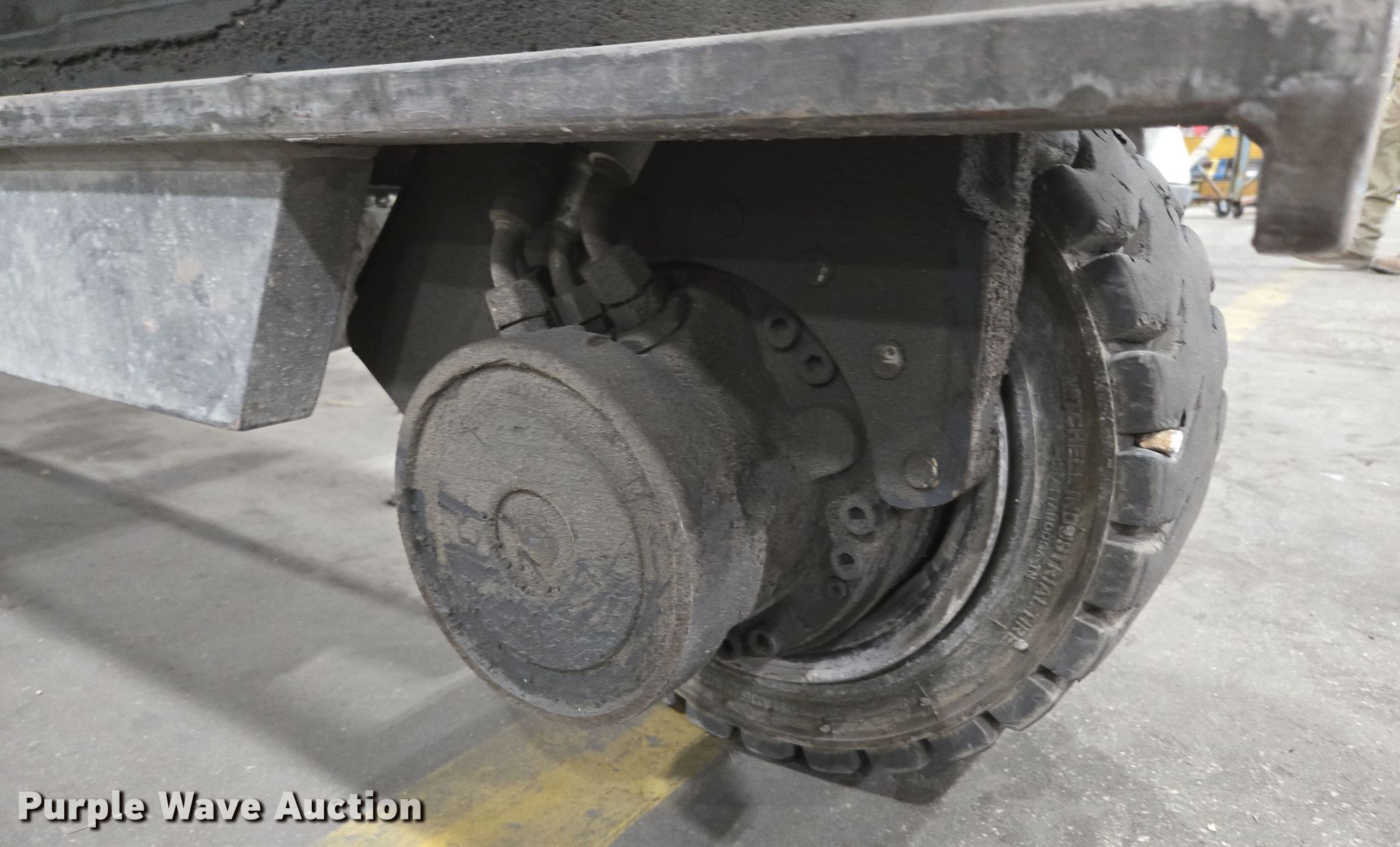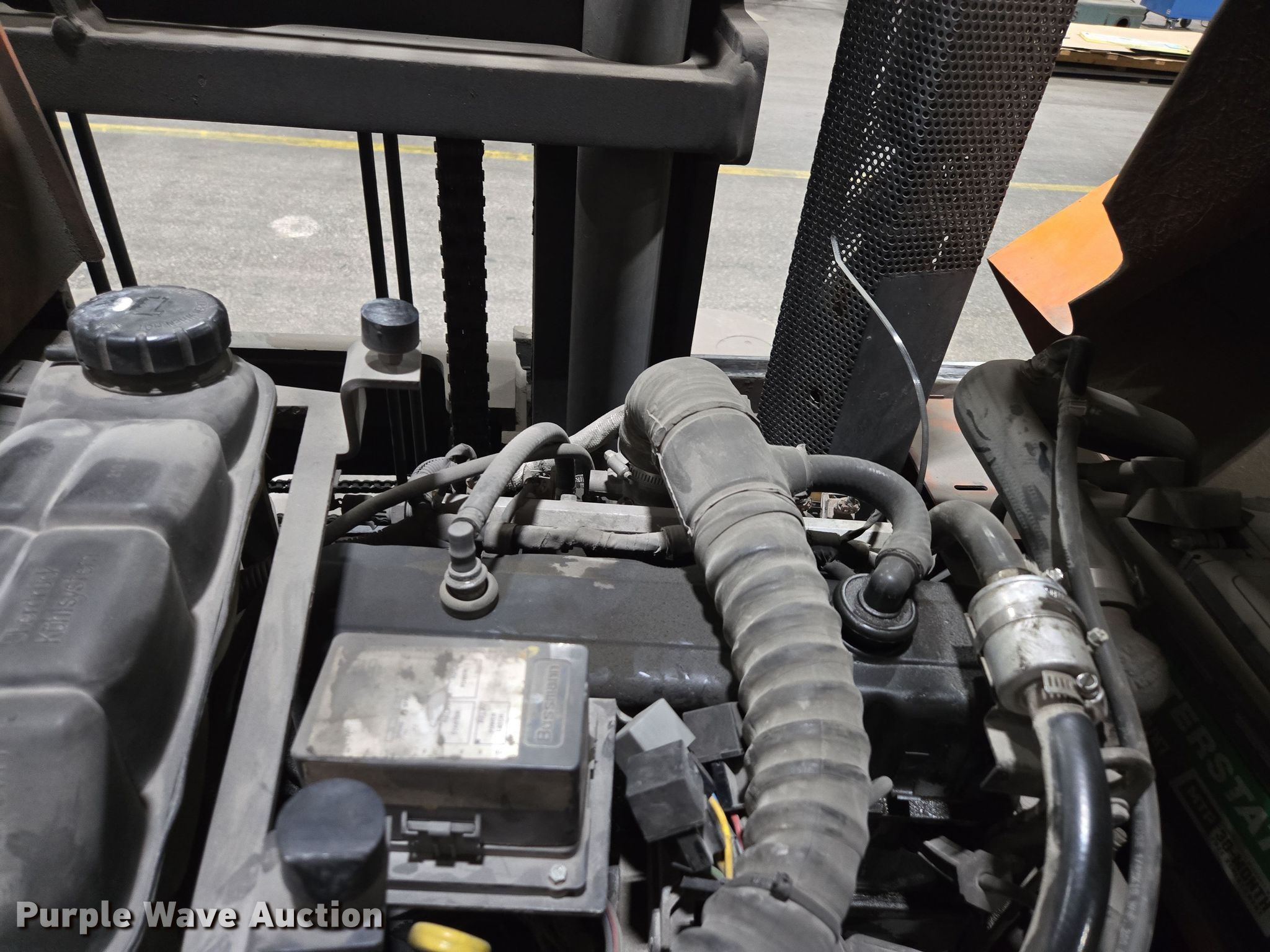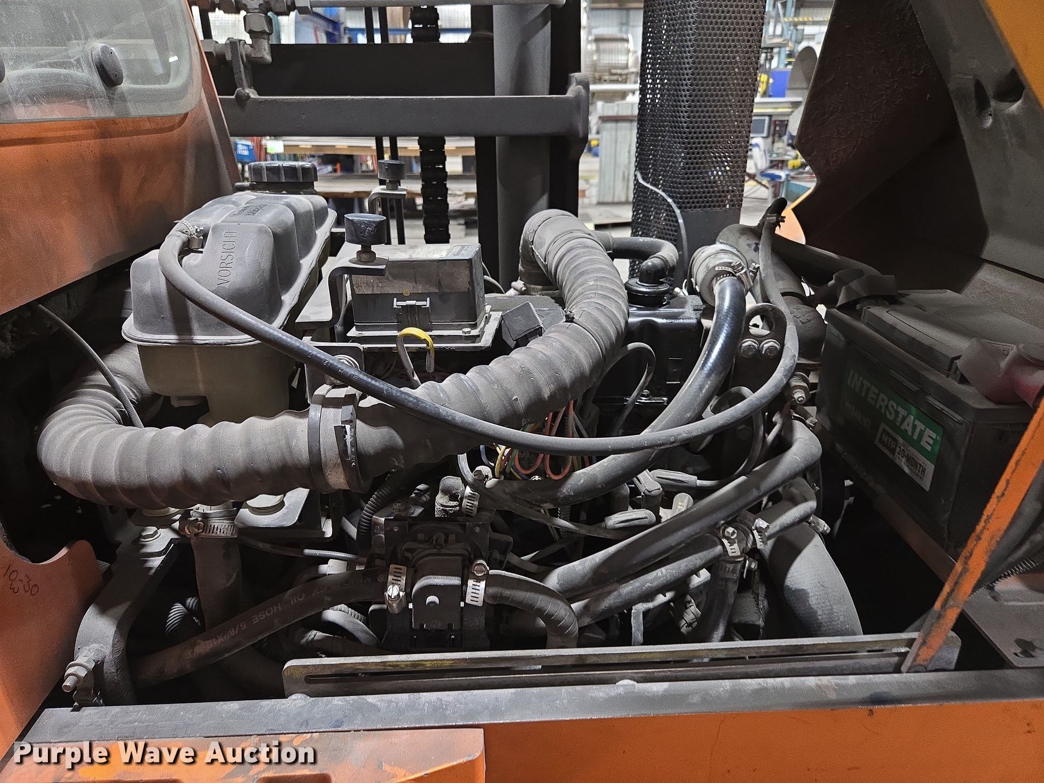 2013 Hubtex 3050-EL/T forklift. Hours: 7,359 on meter, Serial: 63.835, Unit #: 8181. Engine GM, Cylinders: 4, Fuel type: LPG LP bottle: Not included. Transmission Hydrostatic. Operators station Enclosed cab. Features Mast stages: 2, Side shift, Mast tilt, Fork length: 60". Tires Front: 200/50-10, Rear: 2.50-15, Solid. Notes Warning indicator: Battery, Possible electrical issue, Catalytic converter issues, plugged, Hydraulic fluid leak, Back glass missing. Paul Mueller Company. Springfield, MO 65802