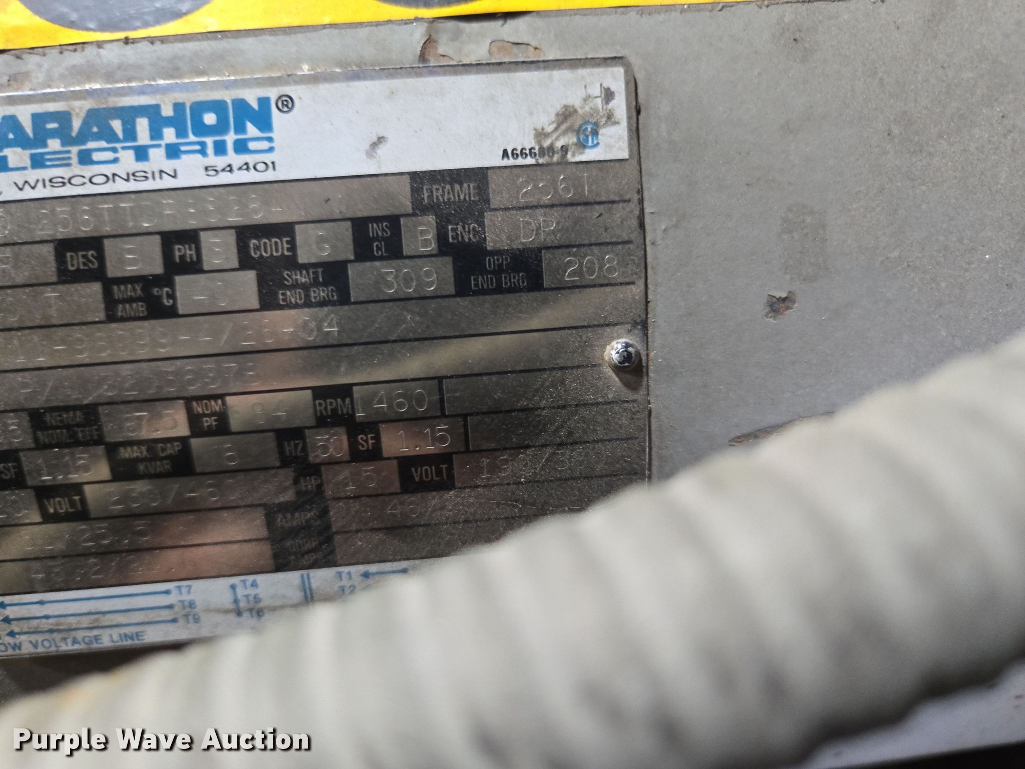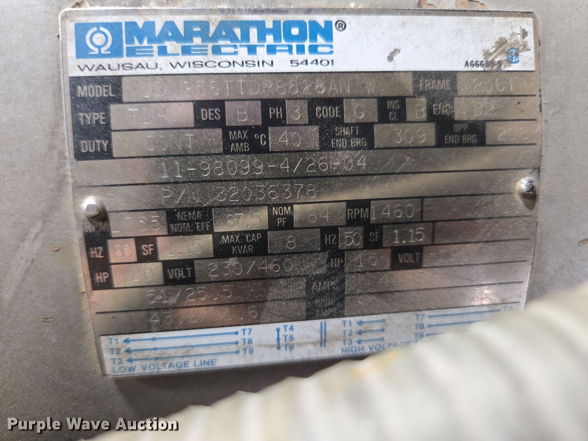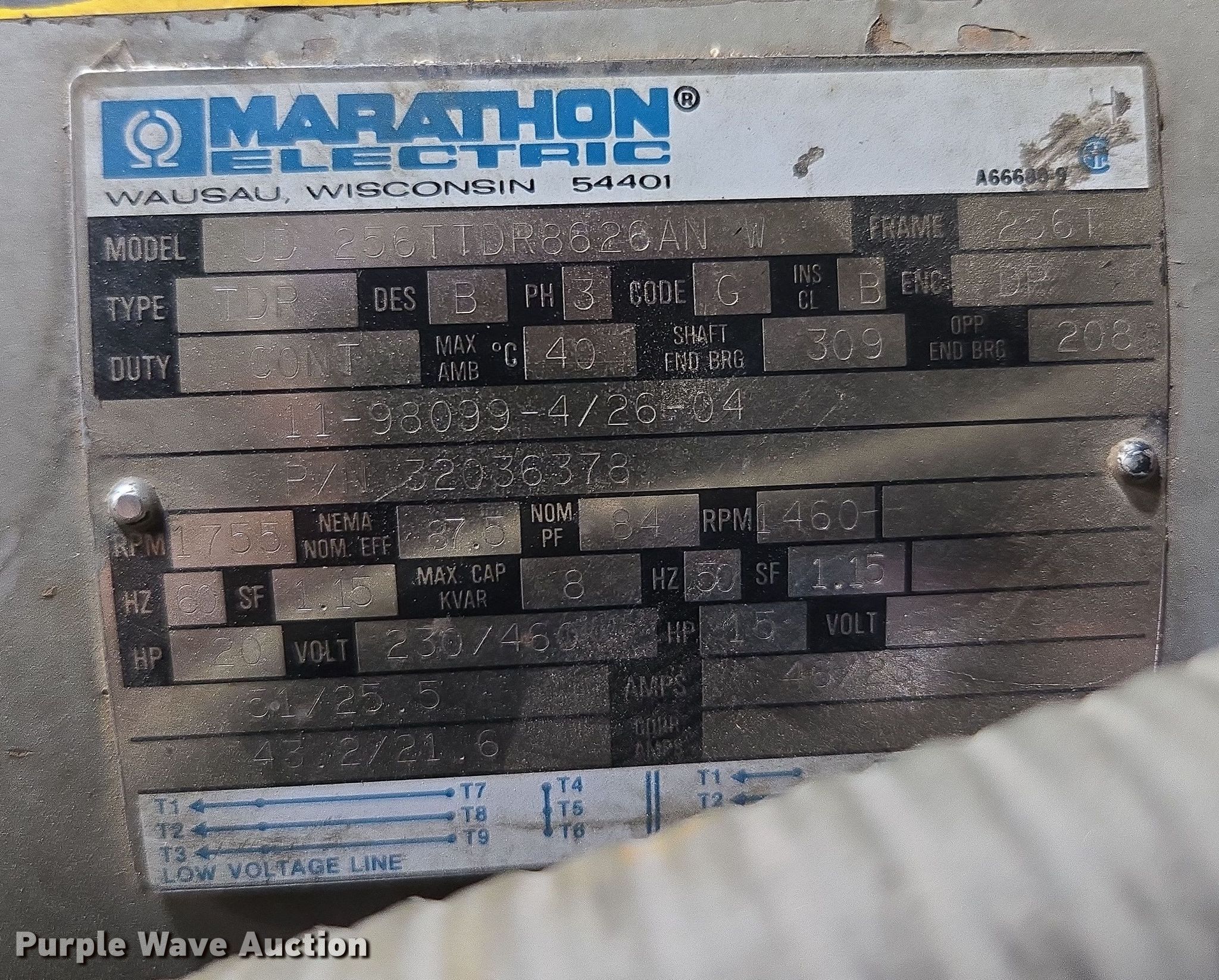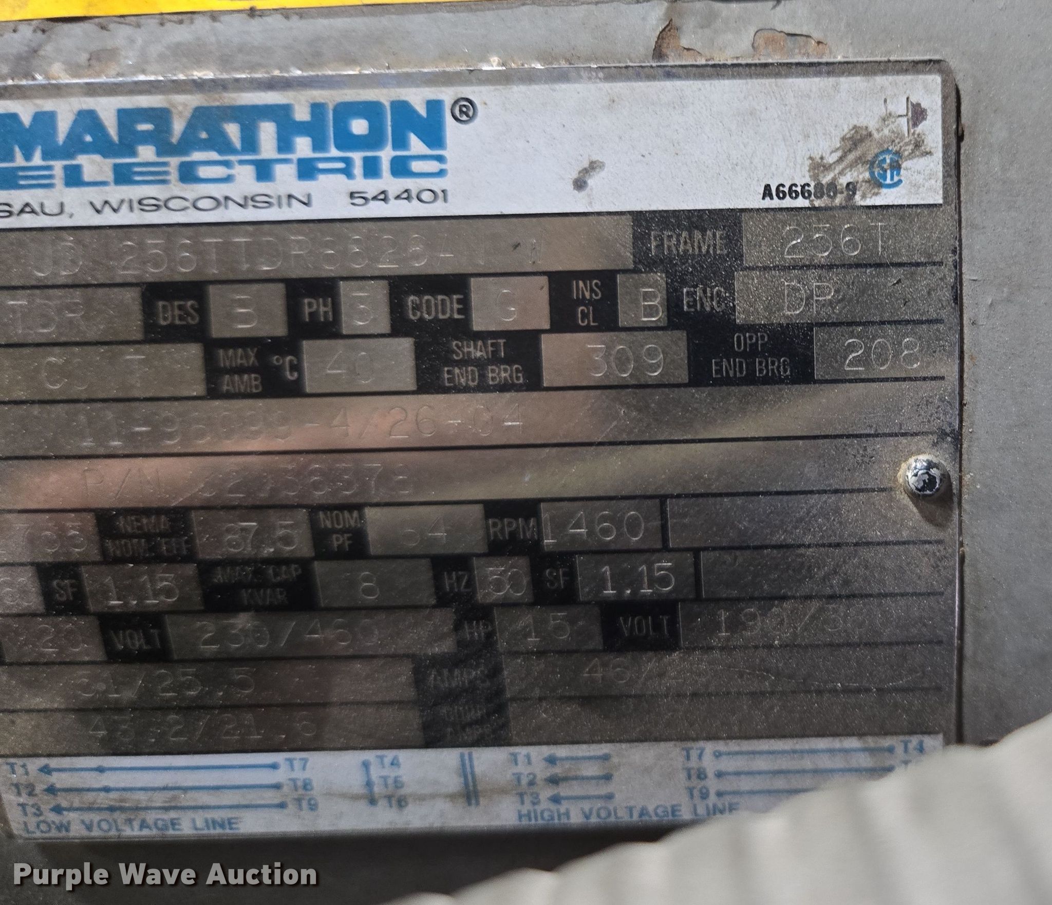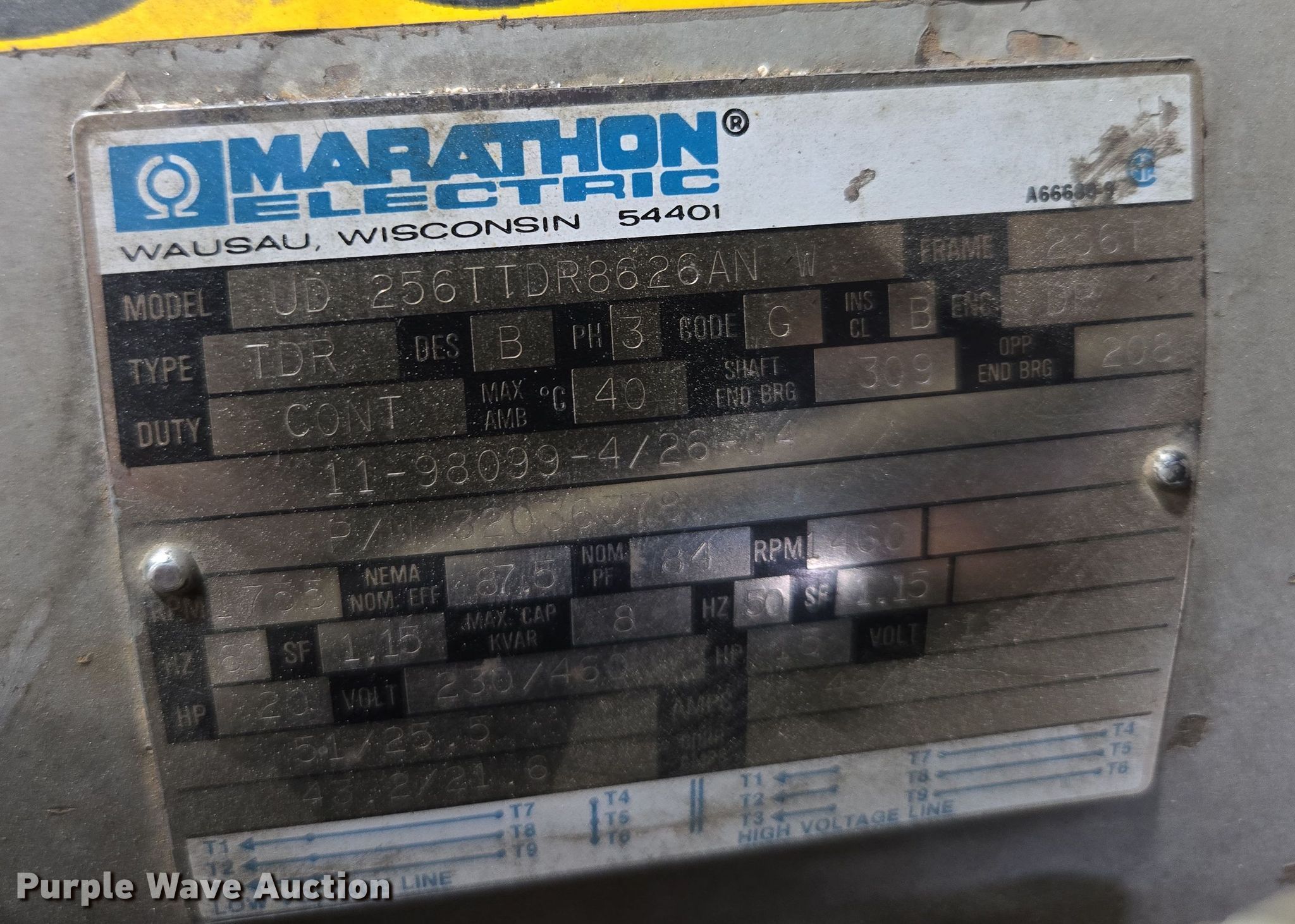 Ingersoll Rand T30 air compressor. Serial: 30T 643564, Unit #: 5565. Electric Motor Marathon Electric UD 256TTDR8828AN W, HP: 15, Volts: 230/460, Phase: Three. Features Air compressor Ingersoll Rand 20F. Paul Mueller Company. Springfield, MO 65802