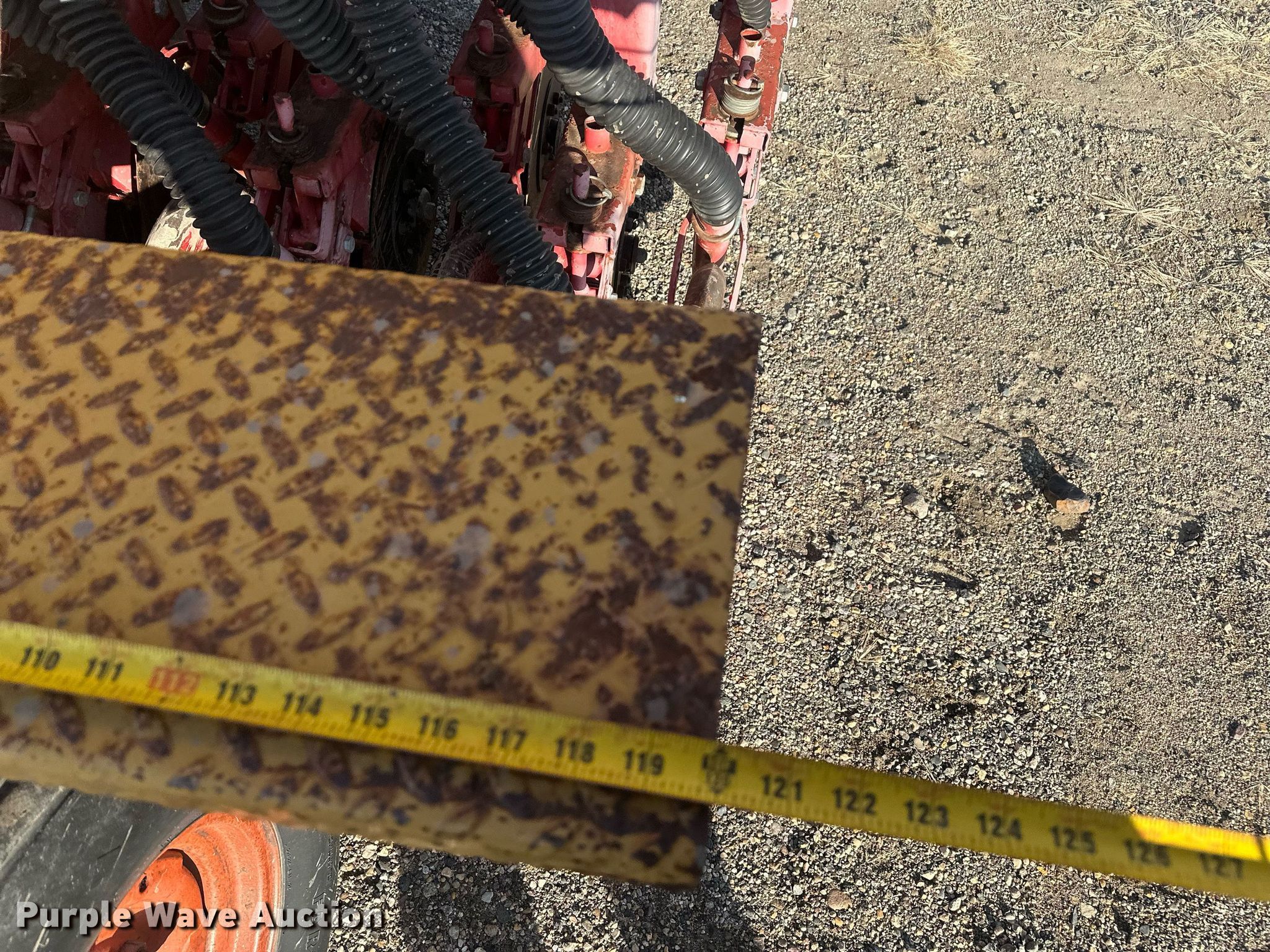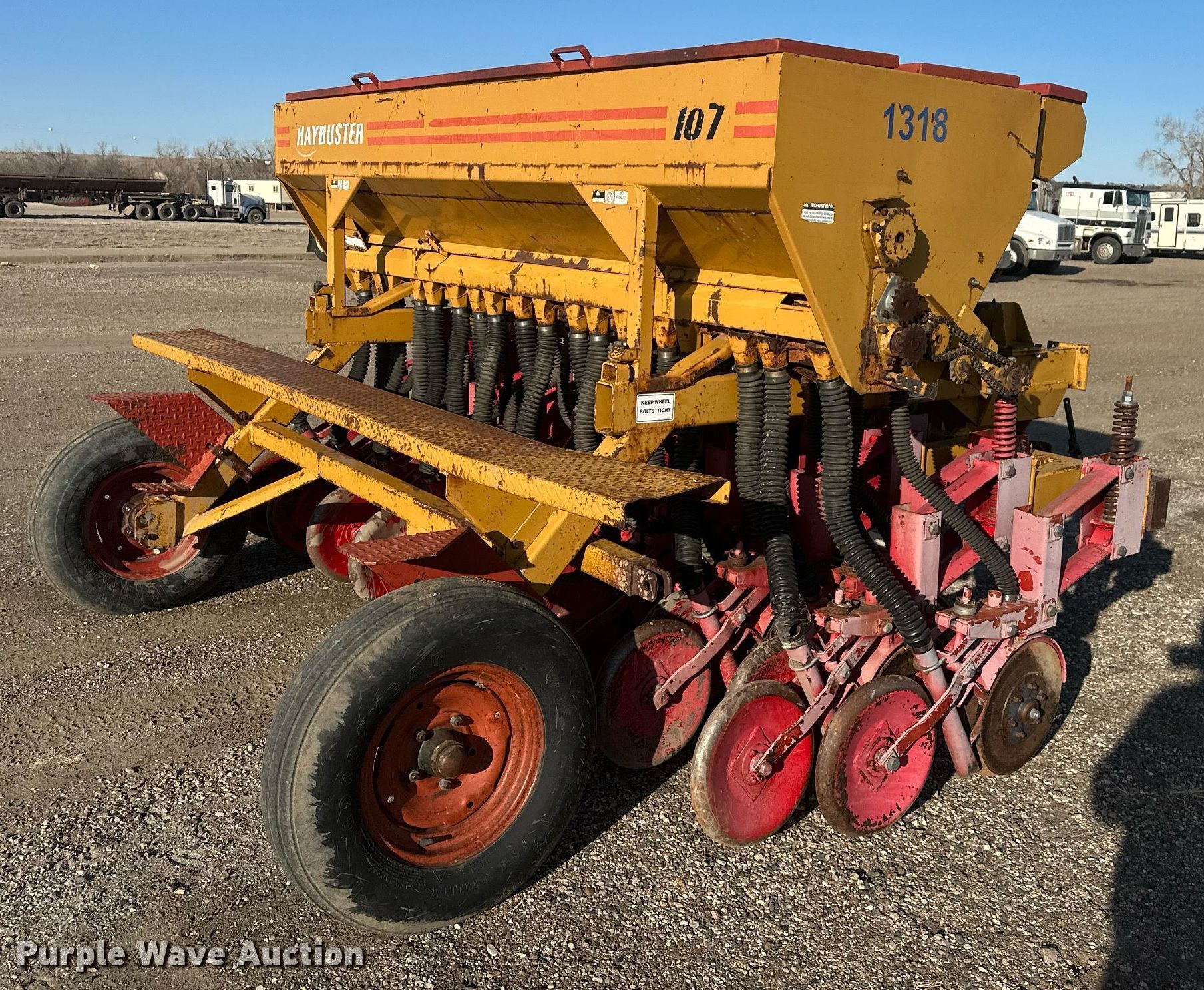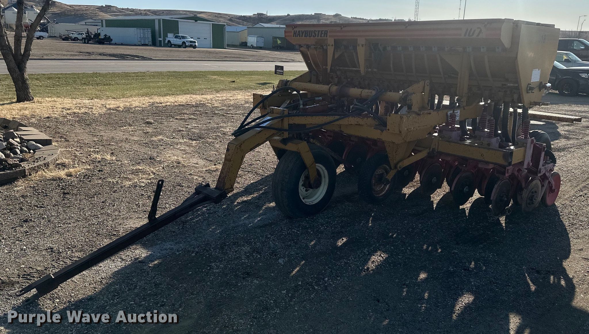 Haybuster 107 grain drill. Width: 10', Row units: 18, Row spacing: 4". Features Seed delivery Bulk fill system, Row units Down pressure: Spring, Disk openers: Single. Tires Transport tire size: 7.60-15 Quantity: 3, Drive/ outside tire size: 7.60 Quantity: 1. Morris Inc.. Fort Pierre, SD 57532