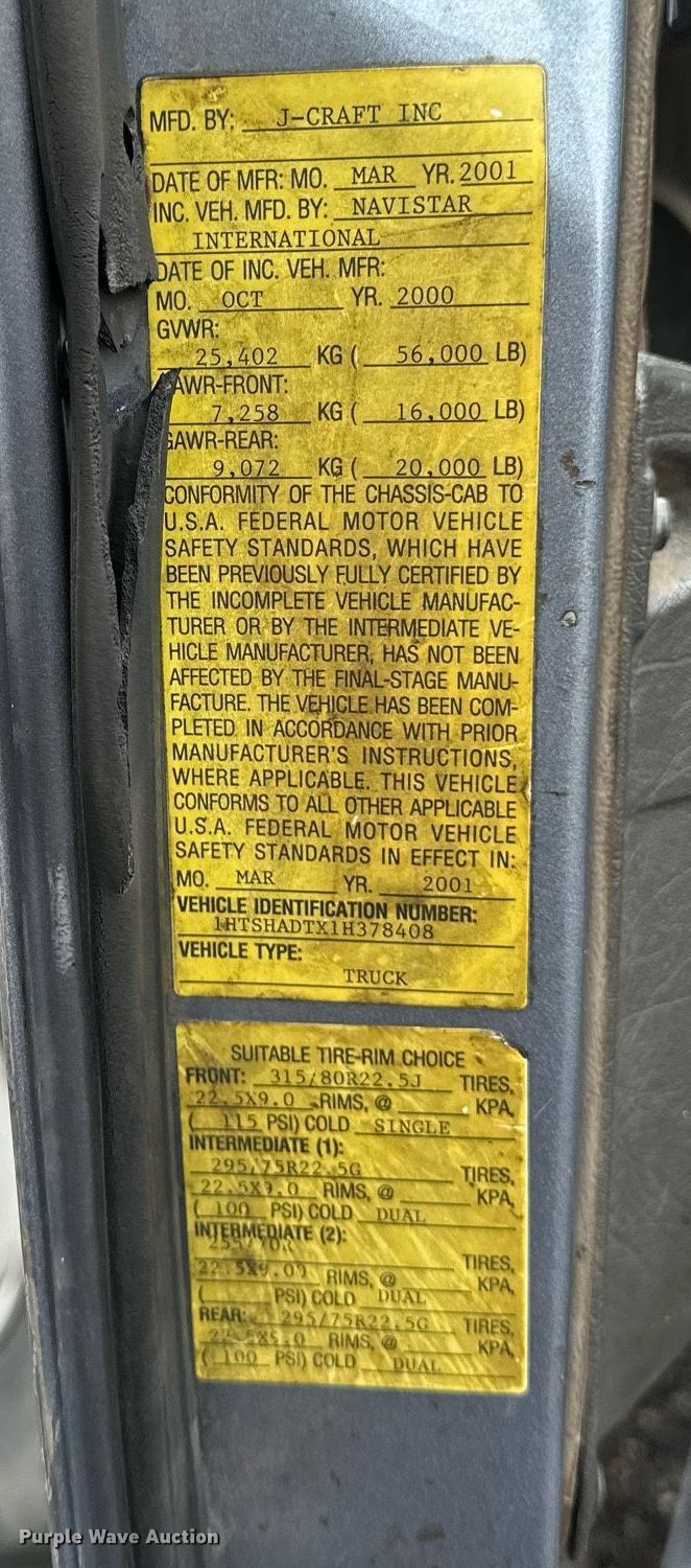2001 International F-4900 dump truck. Miles: 265,196 on odometer, Hours: 14,956 on meter, VIN: 1HTSHADTX1H378408. Engine International CL300, Displacement: 8.7L, Cylinders: 6, Fuel type: Diesel. Transmission Allison, Automatic. Chassis Axles: Triple, Pusher axle Steerable, Differential lock: Inter-axle, Suspension: Spring over walking beam, Brakes: Air, PTO, GVWR: 56,000 lbs FAWR: 16,000 lbs, RAWR: 20,000 lbs. Interior AC, Heat, Heated mirrors, Cruise control. Features Dump bed Jcraft, 16' L x 8' 1" W, Side height: 48", Bed type: Steel, Roll tarp, Ram: Single, End gate: Air operated. Tires Front: 315/80R22.5, Rear: 11R22.5, Lift axle: 255/70R22.5. Notes Non-operational engine Unit must be towed or hauled, Engine issues, oil leak. Minnesota title. Seller is a Minnesota licensed motor vehicle dealer. The buyer may be required to pay sales tax and/or registration fees to the dealer prior to taking possession. Title will be assigned and distributed by the dealer. Please contact the seller for distribution questions. Litchfield, MN 55355