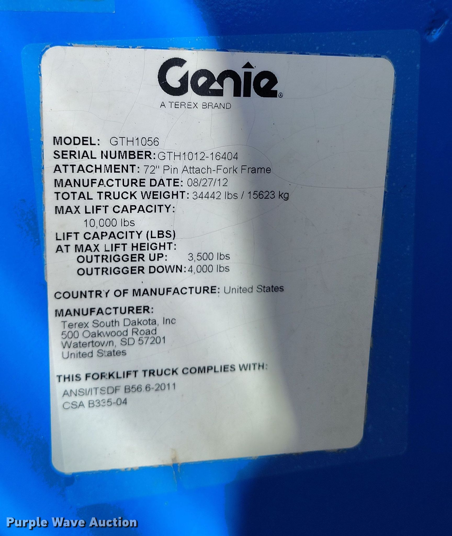 Purple Wave is selling a used Telehandler in Colorado. This item is a 2012 Genie GTH1056 telehandler with the following: Hours: 8,650 on meter, Serial: GTH1012-16404