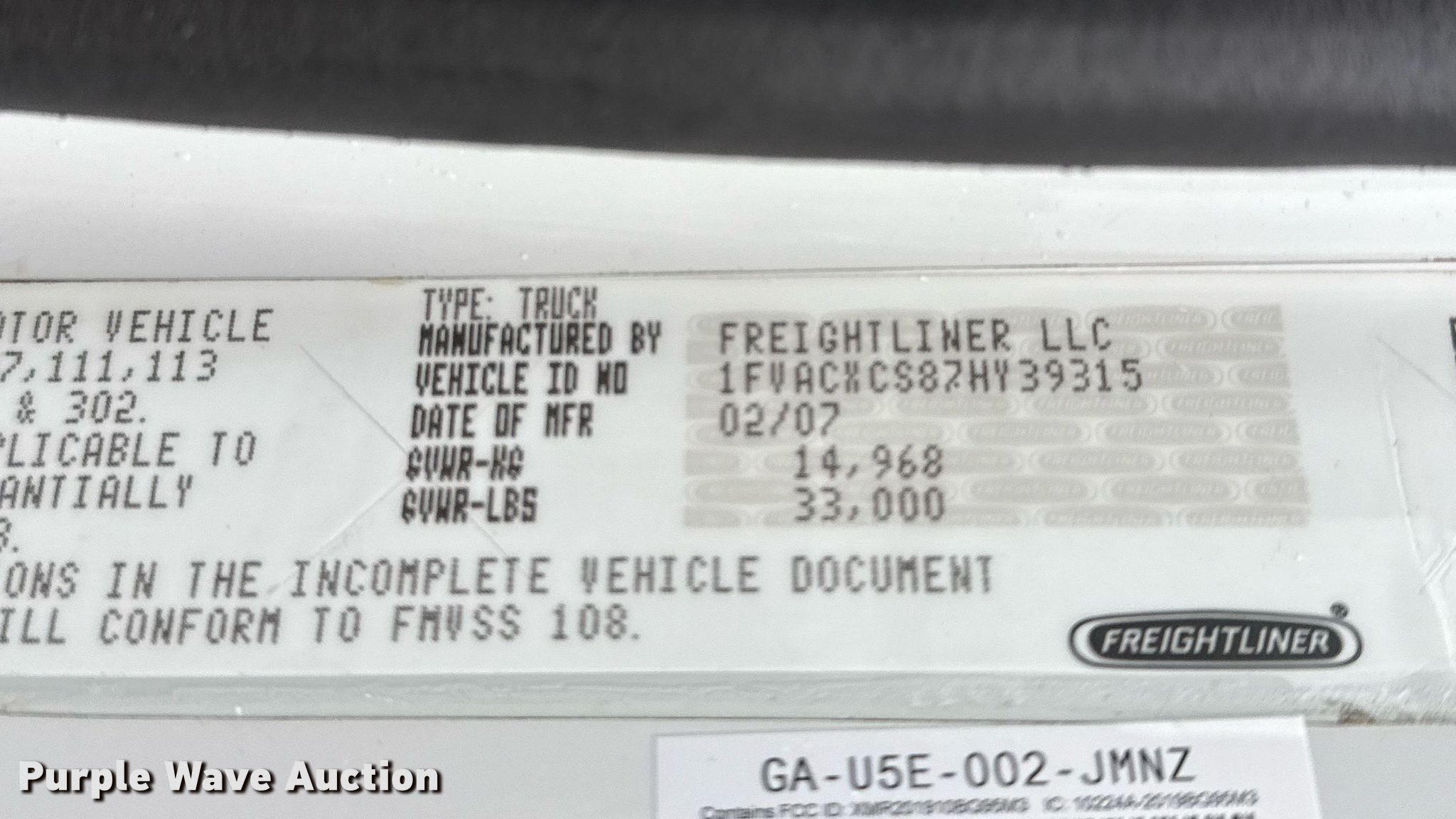 2007 Freightliner Business Class M2 utility / service truck. Engine miles: 267,636 on odometer, Engine hours: 17,542 on meter, VIN: 1FVACXCS87HY39315. Engine Mercedes Benz, Displacement: 6.4L, Cylinders: 6, Fuel type: Diesel. Transmission Eaton Fuller, Manual, Speed: 10. Chassis Hi-rail system, Axles: Single, Suspension: Spring, Brakes: Air, PTO, GVWR: 33,000 lbs FAWR: 12,000 lbs, RAWR: 21,000 lbs. Interior AC, Heat, Heated mirrors, Cruise control. Features Bed 16' 10" L x 96" W, Crane Palfinger PSC6000, Boom Telescopic, Boom controls Ground, Remote control.. Tires Size: 11R22.5. Oklahoma title. Seller is an Oklahoma licensed motor vehicle dealer. Title will be assigned and distributed by the dealer. Please contact the seller for distribution questions. Title distribution may be delayed up to 30 days from verification of funds. 15107 North 137th East Avenue. Collinsville, OK 74021