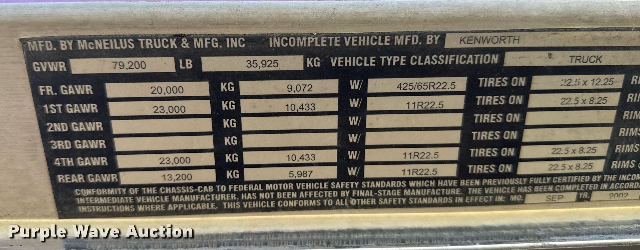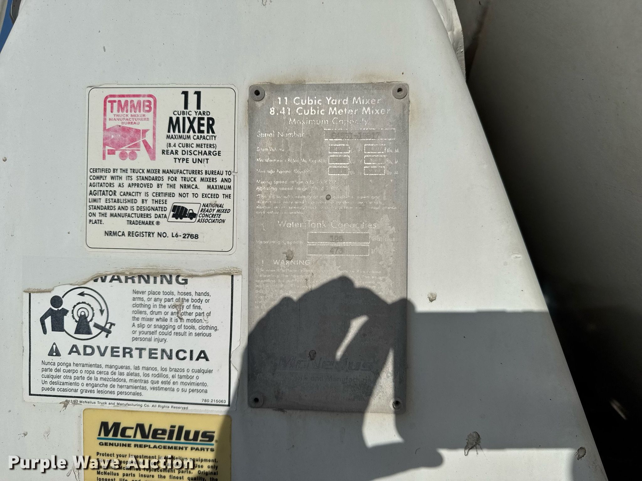 2003 Kenworth W900 ready mix truck. Miles: 197,861 on odometer, Hours: 346 on meter, VIN: 1NKWLTEX03R389049. Engine Caterpillar C-10, Serial: 3CS23917, Displacement: 10.3L, Cylinders: 6, Fuel type: Diesel. Transmission Eaton Fuller, Manual, Speed: 11. Chassis Axles: Triple, Tag axle Steerable, Gear ratio: 4.89, Differential lock: Full, Suspension: Spring over walking beam, Brakes: Air, PTO. Interior AC, Heat, Heated mirrors, Cruise control. Features Mixer McNeilus, Serial: 64531-19817, Capacity: 11 cu.yd., Discharge: Rear, In-cab controls, Rear drum controls, Water tank capacity: 125 gallons, Chute Extensions: 3, Chute type: Steel.. Tires Front: 425/65R22.5, Rear: 11R22.5, Lift axle: 11R22.5. Kansas title. Title distribution may be delayed up to 14 days from verification of funds. Midwest Concrete Materials, Inc.. Manhattan, KS 66502
