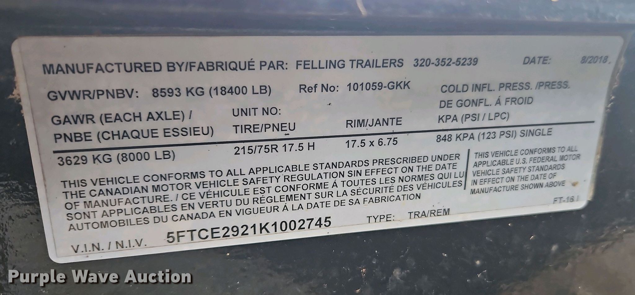 Purple Wave is selling a used Equip. Trailer in Kansas. This item is a 2019 Felling FT-16I equipment trailer with the following: VIN: 5FTCE2921K1002745