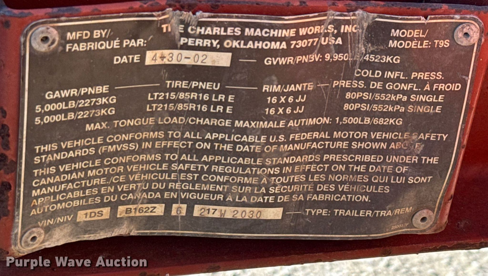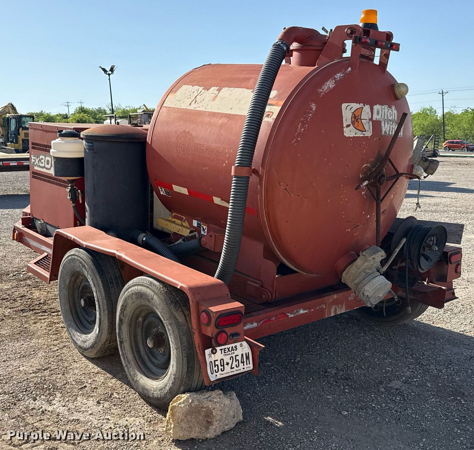 2002 Ditch Witch FX30S vacuum excavator. Hours: 1,733 on meter, VIN: 1DSB162Z6217W2030, Serial: 2W0586. Engine Kubota D1105, Displacement: 1.1L, Cylinders: 3, Fuel type: Diesel. Features Spoils tank Capacity: 500 gallons, Water tank Capacity: 80 gallons, Water pump, Vacuum pump Eurus Blower ZZ4LDSL, Inlet valve size: 3", Outlet valve size: 3". Trailer 2002 Ditch Witch T9S, 17' L x 96" W, Ball hitch size: 2 5/16", Suspension: Torsion, Brakes: Electric, Axles: Tandem, Tire size: ST235/85R16, GVWR: 9,950 lbs, GAWR: 5,000 lbs. Notes Non-operational engine , Non-operational unit. Texas title. Title distribution may be delayed up to 14 days from verification of funds. BorePro Utility Construction LLC. Buda, TX 78610
