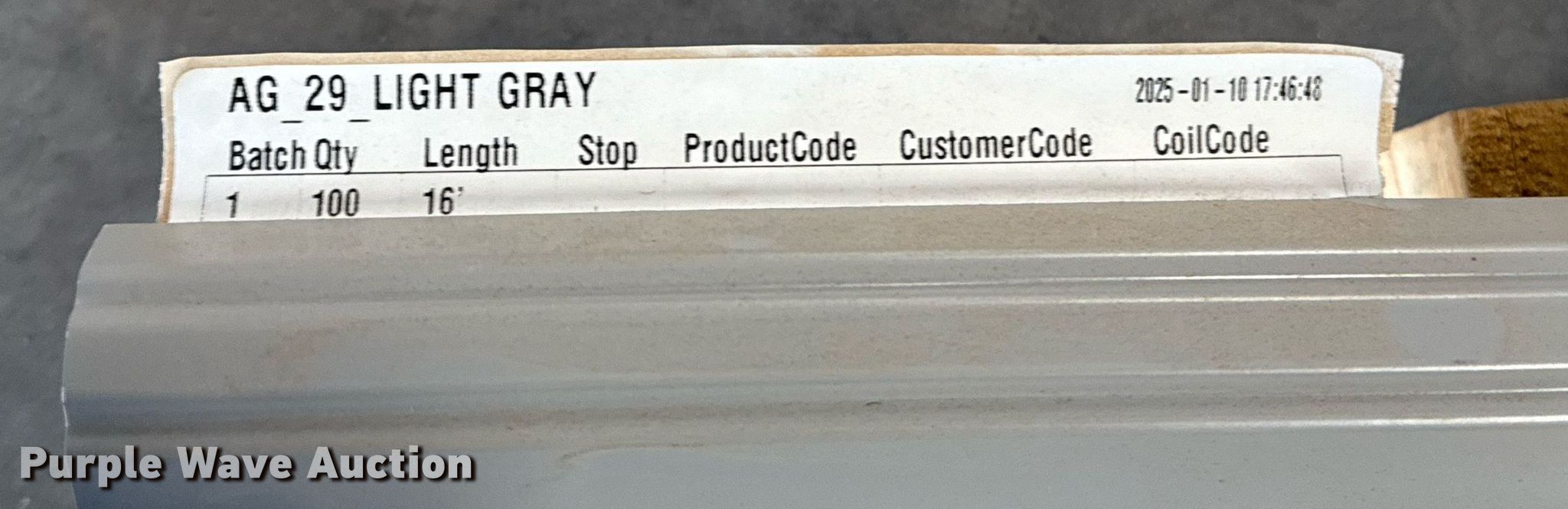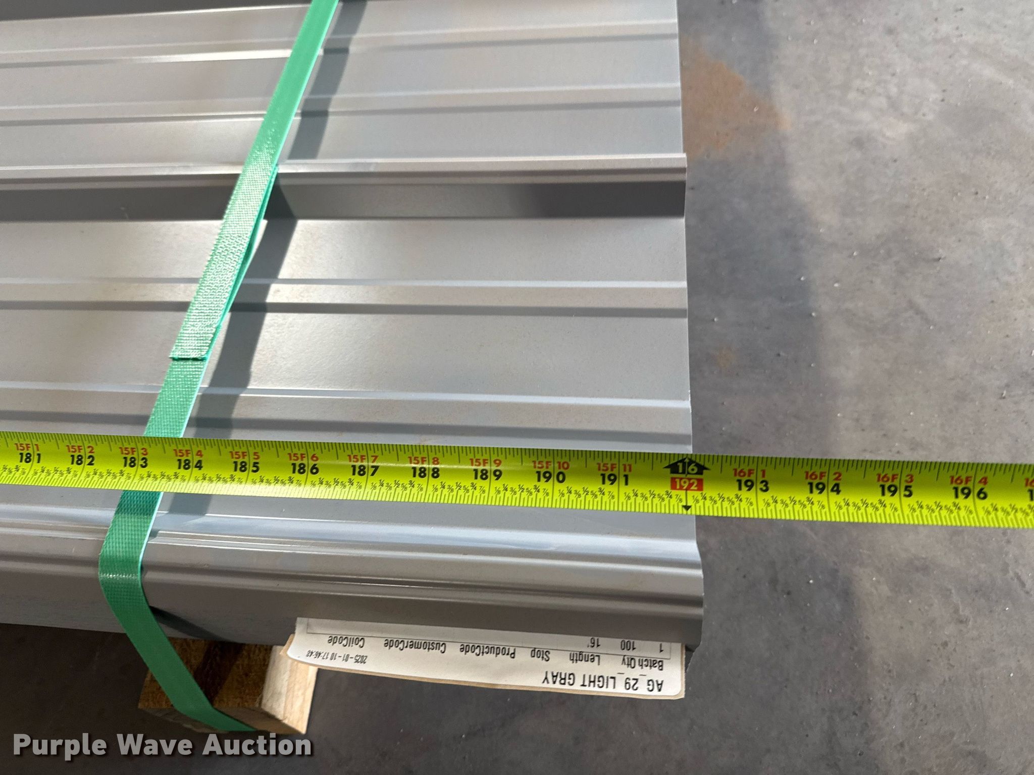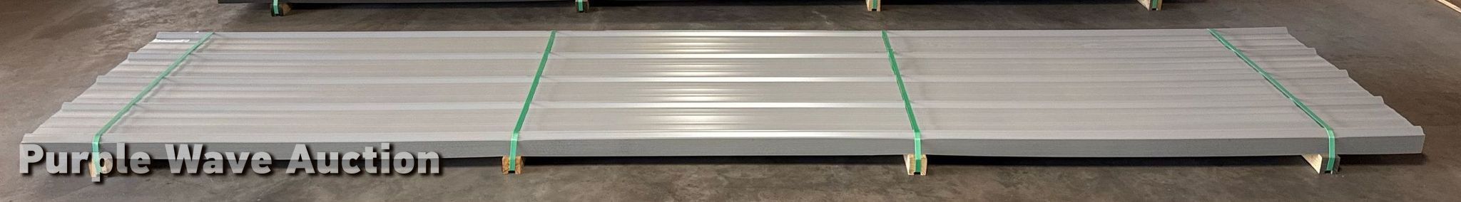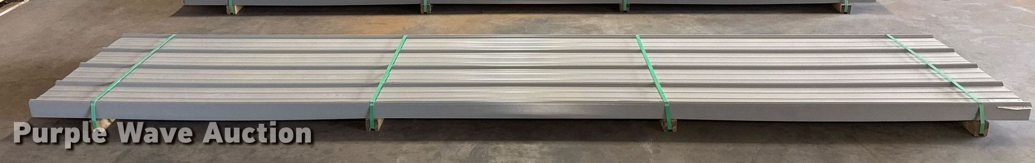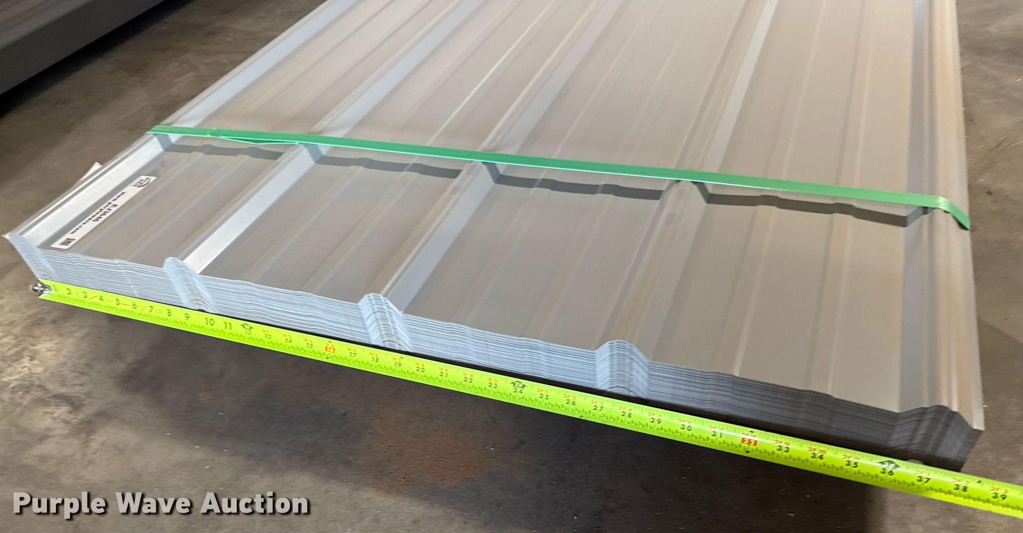 Purple Wave is selling a used Building Materials in Texas. This item is a (100) sheets of Doerksen Metal Components metal siding/roofing with the following: 16' L x 36" W overlap coverage, AG panel, 29 gauge, Color: Light gray, Possible blemishes