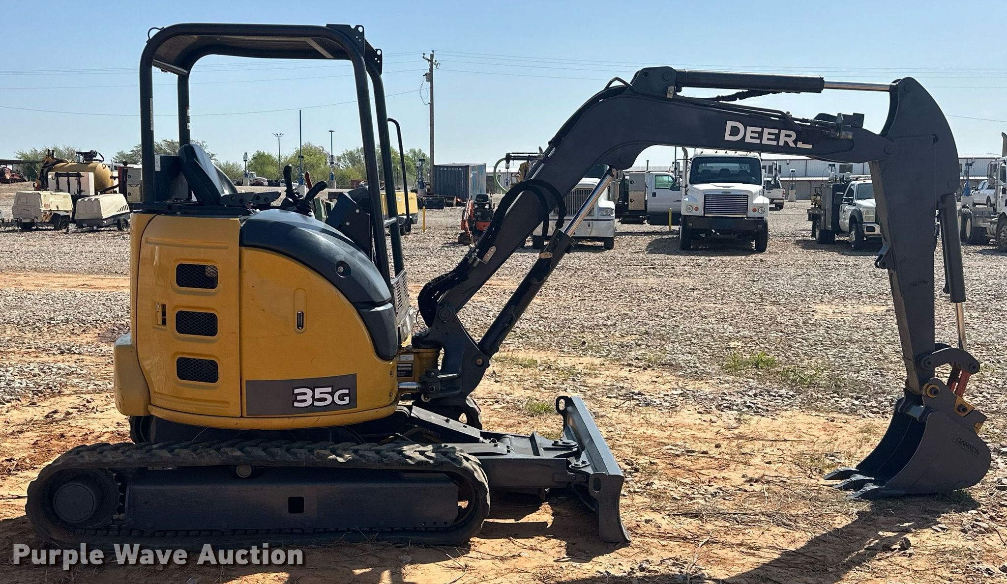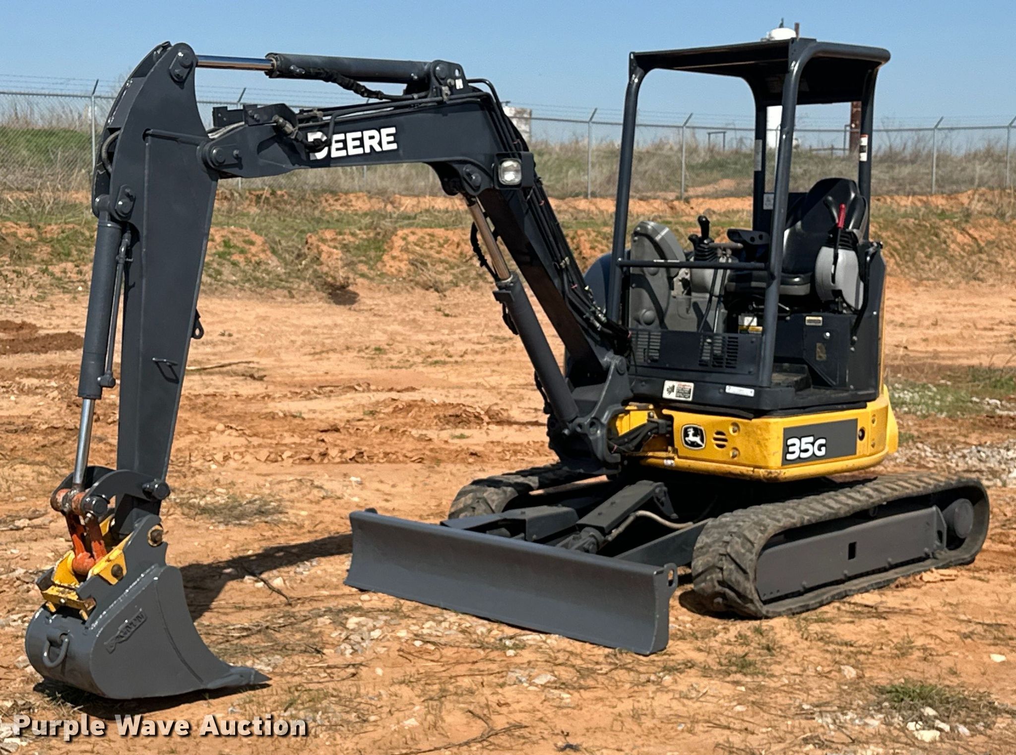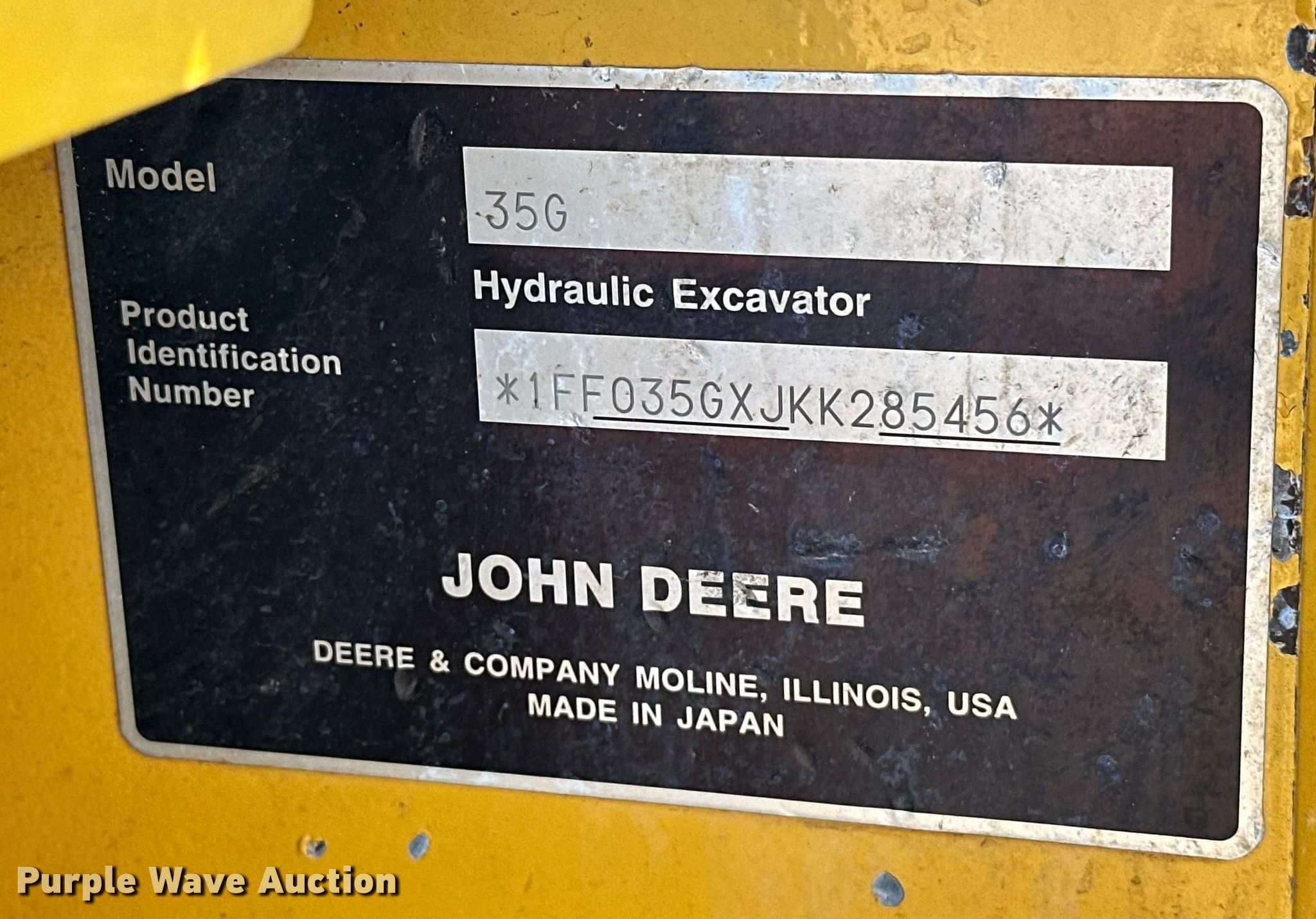 Purple Wave is selling a used Mini Excavator in Oklahoma. This item is a 2019 John Deere 35G mini excavator with the following: Hours: 7,081 on meter, Serial: 1FF035GXJKK285456