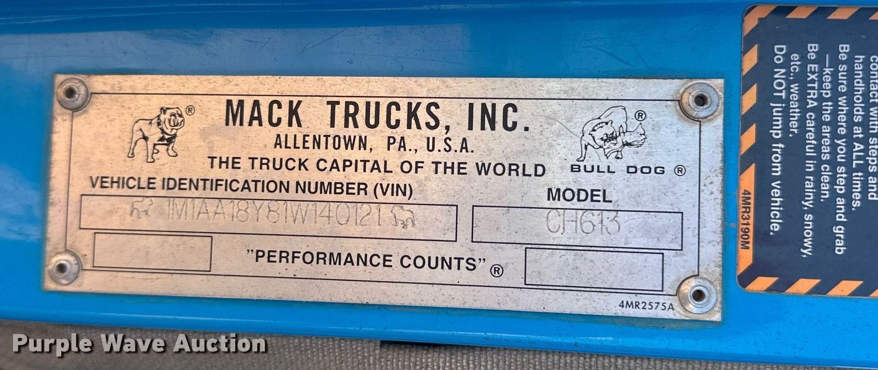 Take a look at this used 2001 Mack CH613 dump truck being sold on May 8th, 2025 in the SOLD! May 08 Construction Equipment Auction made by Mack. Take a look at all of the item information below or take a look at similar auctions for Construction Trucks.