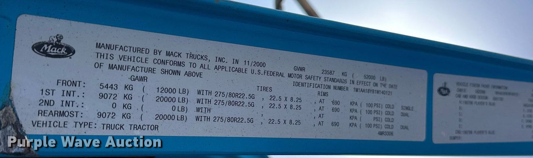 Purple Wave is selling a used Construction Dump Truck in Oklahoma. This item is a 2001 Mack CH613 dump truck with the following: Miles: 896,784 on odometer, Hours: 34,036 on meter, VIN: 1M1AA18Y81W140121