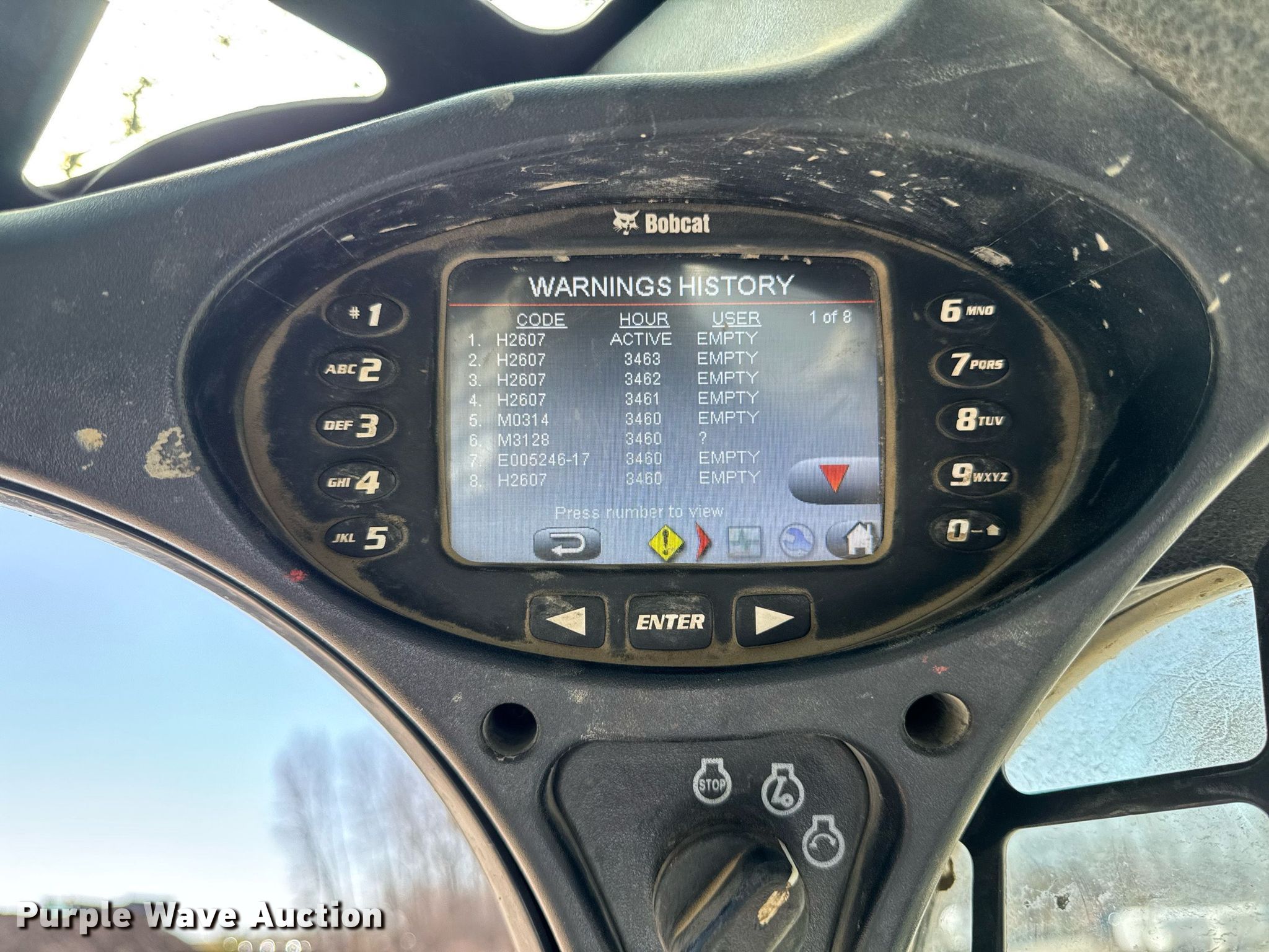 2019 Bobcat T770 tracked skid steer loader. Hours: 3,463 on meter, Serial: AT6318289. Engine Cylinders: 4, Fuel type: Diesel. Transmission Hydrostatic, Two speed travel. Operators station Enclosed cab, AC, Heat, Bucket control: Hand, Pattern changer. Features Auxiliary hydraulics, Auxiliary electrical outlet, Quick coupler: Hydraulic, Bucket Caterpillar, Width: 86", Cutting edge: Bolt-on. Tracks Brand: Arisun, Width: 17". Notes Electrical issues , Warning indicator: Error code H2607. Absolute Group Company. Granger, IA 50109