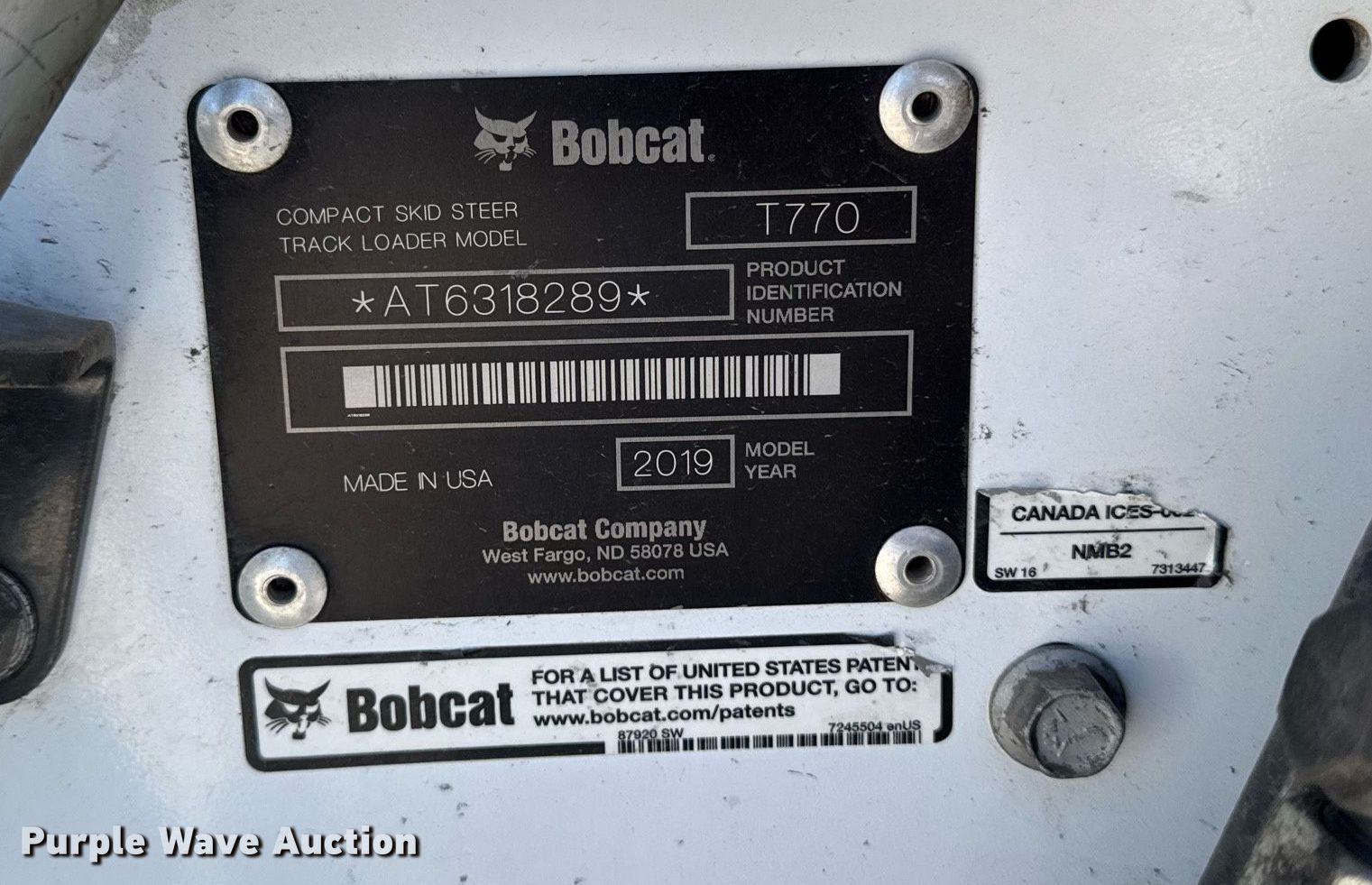Purple Wave is selling a used Tracked Skid Steer Loader in Iowa. This item is a 2019 Bobcat T770 tracked skid steer loader with the following: Hours: 3,463 on meter, Serial: AT6318289