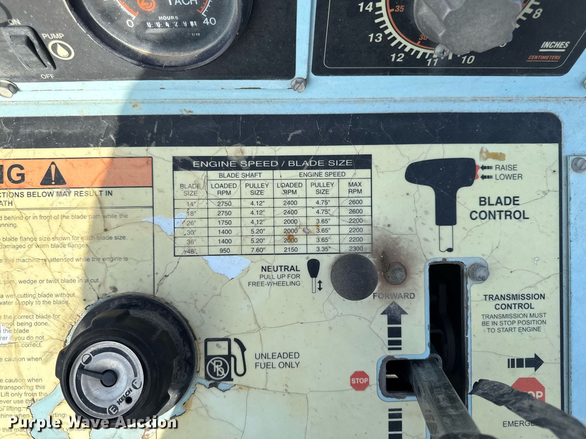 Target Pro 65 III concrete saw. Hours: 429 on meter, Serial: 333797. Engine Wisconsin V465D1, Serial: 10531, Cylinders: 4, Fuel type: Gas. Transmission Hydrostatic, 1F - 1R. Features Electric height adjustment. Notes Throttle cable issues. Absolute Group Company. Granger, IA 50109