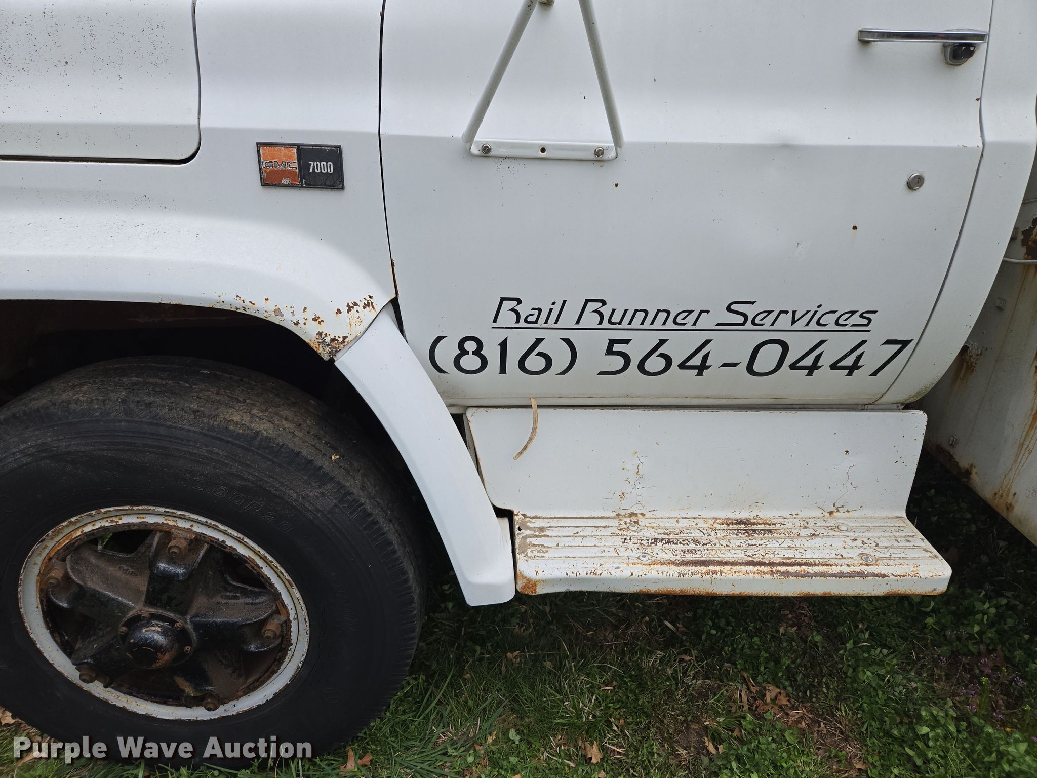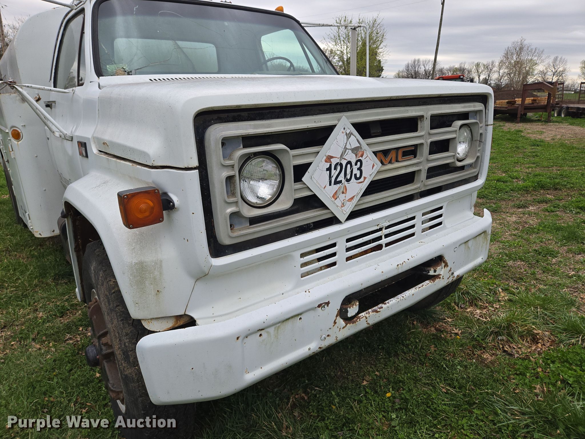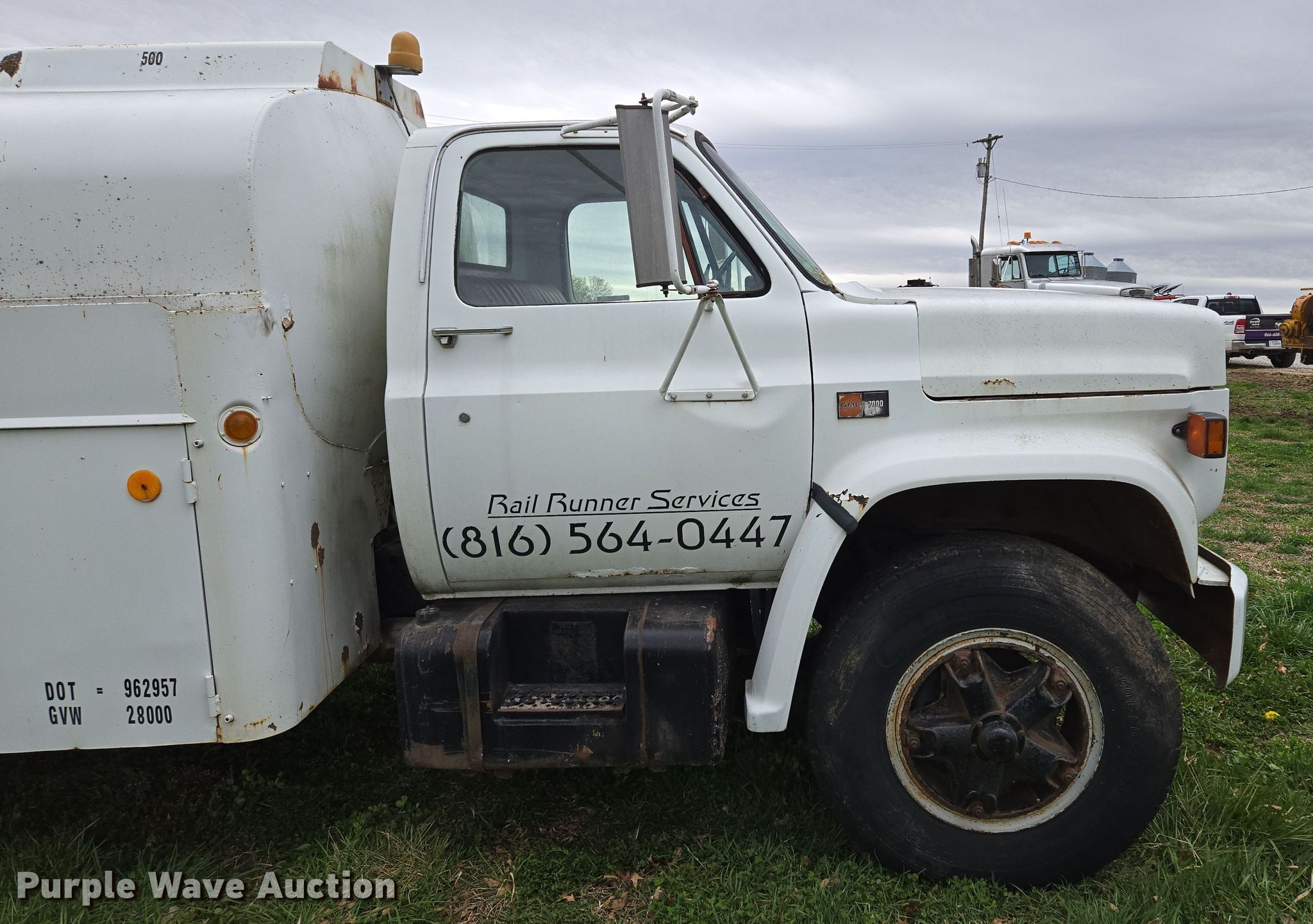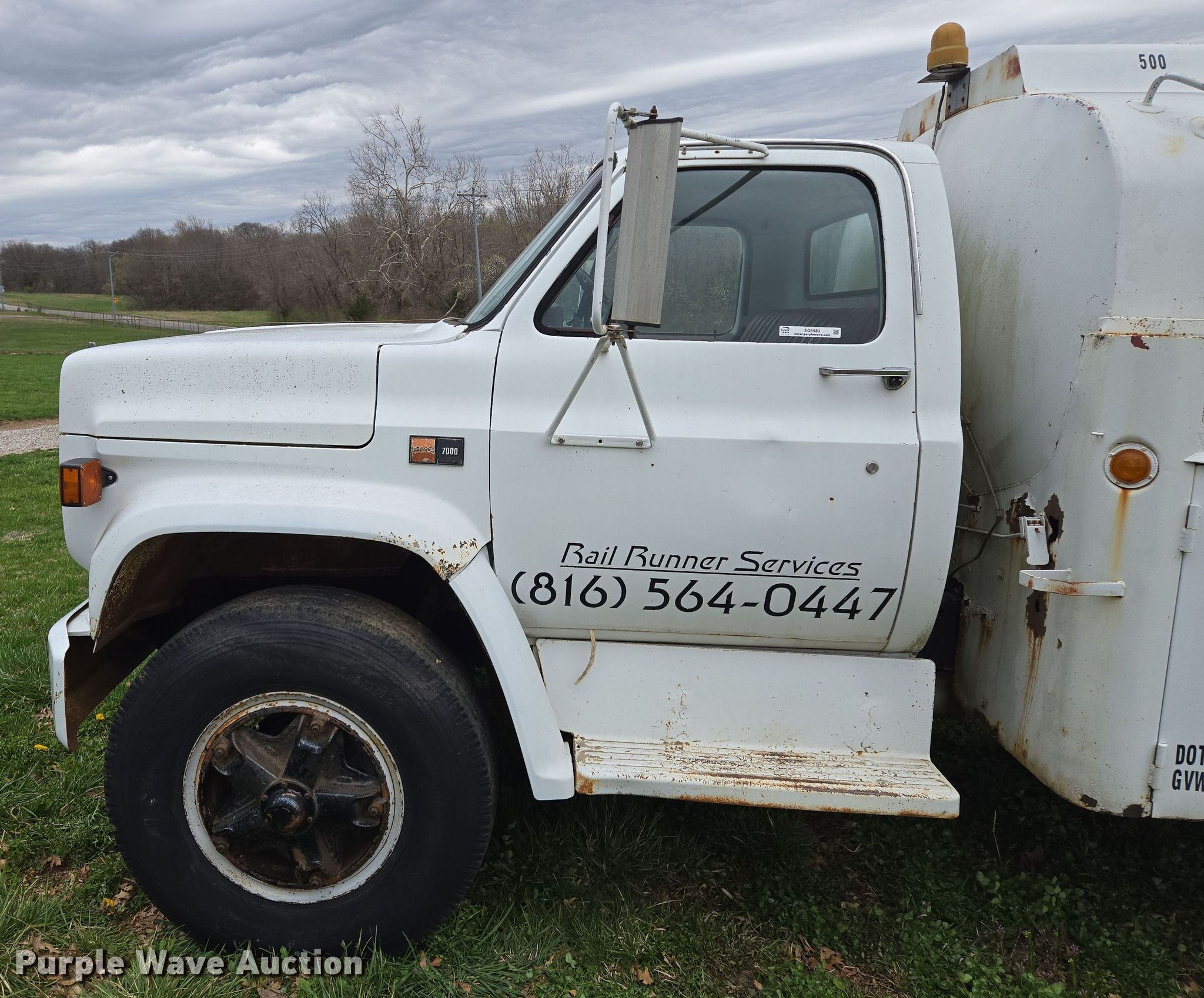 1983 GMC 7000 fuel truck. Miles: 7,362 on odometer, VIN: 1GDL7D1B0DV518985. Engine GM, Displacement: 427 C.I.D., Cylinders: 8, Fuel type: Gas. Transmission Manual, Speed: 5. Chassis Axles: Single, Suspension: Spring, Brakes: Hydraulic, GVWR: 28,000 lbs. Interior Heat. Features Bed / tank Progress Industries, Capacity: 2,000 gallons, 16' 8" L x 96" W, Compartments: 5, Hose reels: 2, Nozzles, Metered pumps: 2 Make: Red Seal.. Tires Size: 10.00R20. Notes Rust damage, Dash warning indicator: Brake, Windshield chipped or cracked. Missouri title. Title distribution may be delayed up to 14 days from verification of funds. Excelsior Springs, MO 64024
