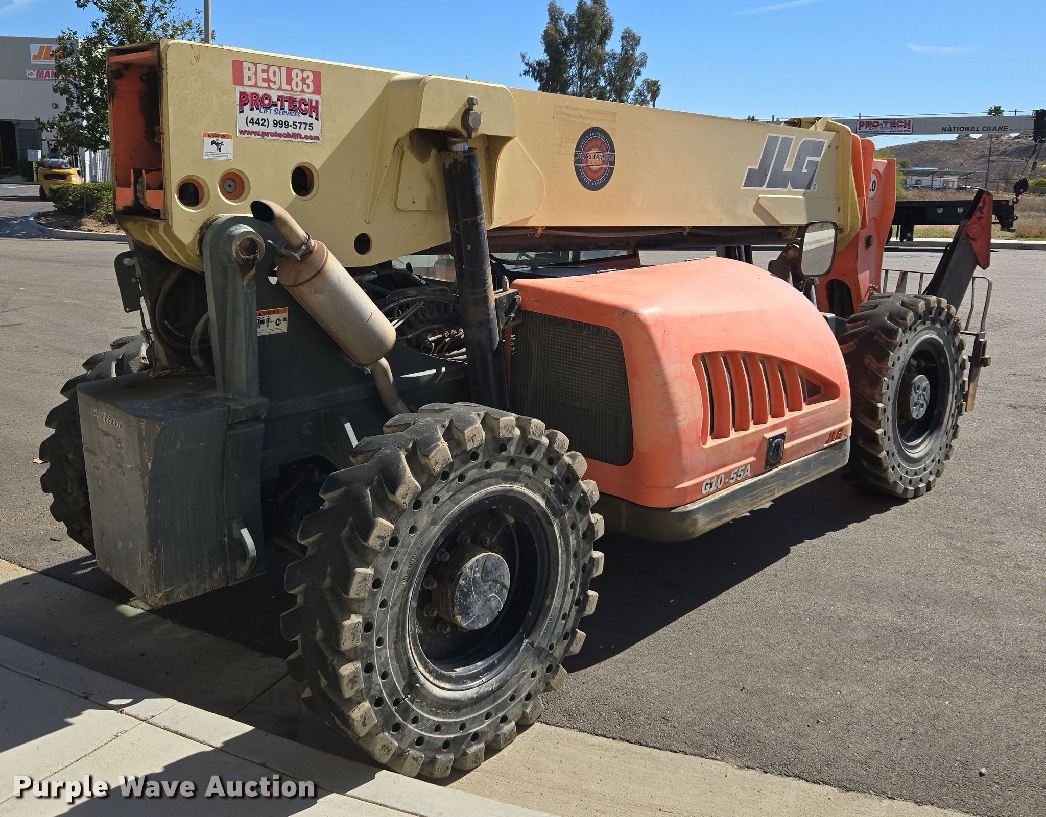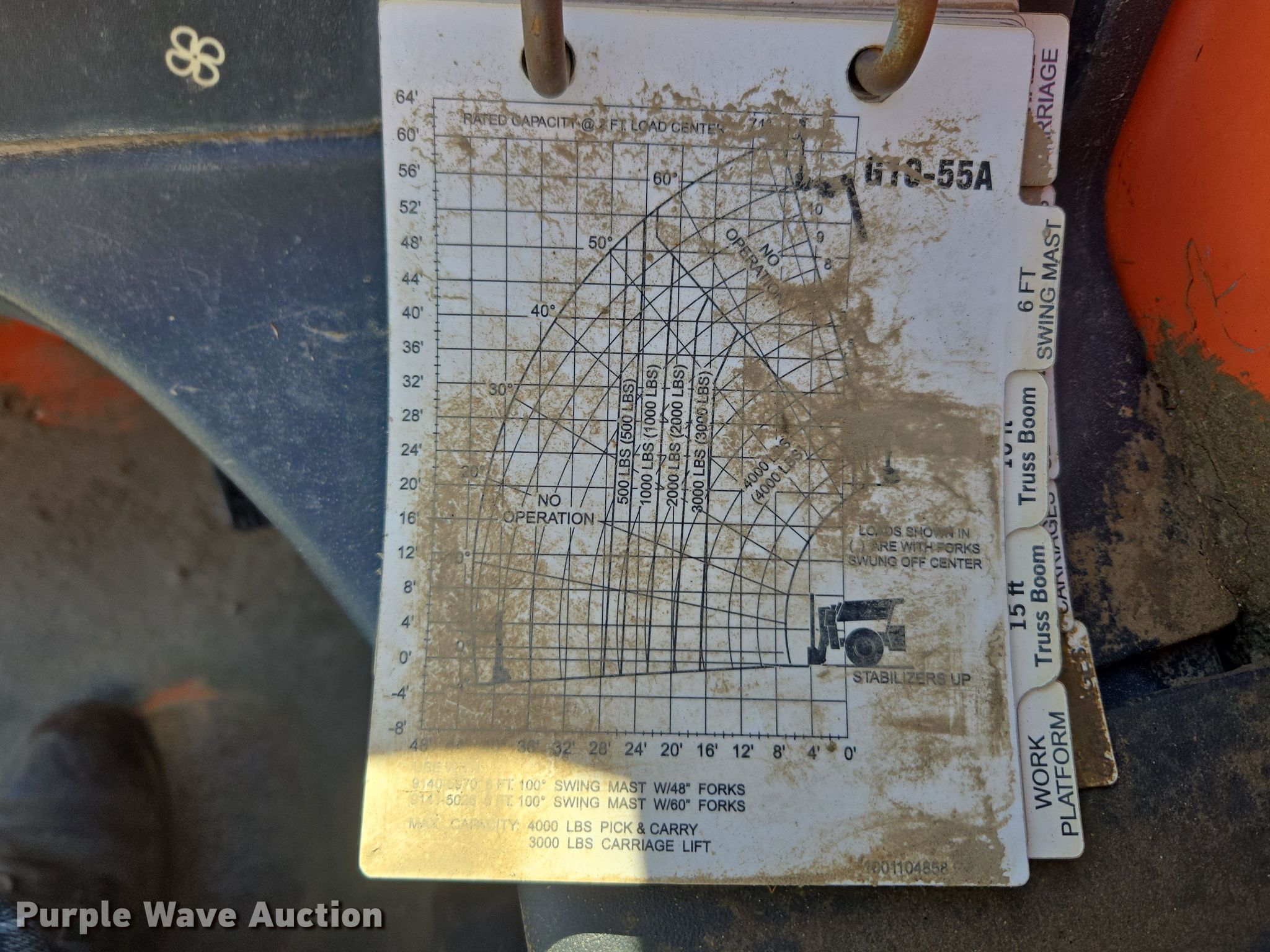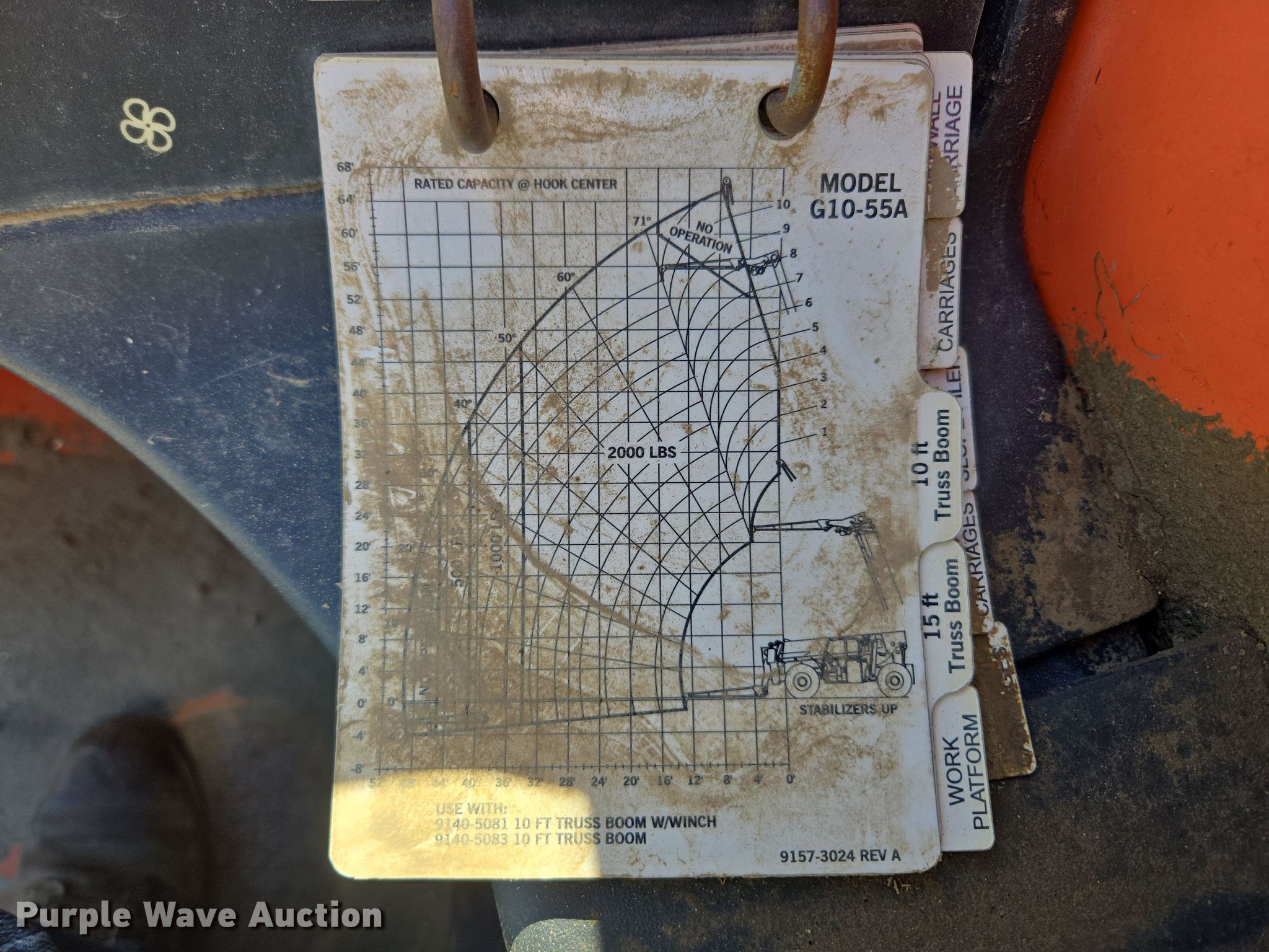 2005 JLG G10-55A telehandler. Hours: 7,094 on meter, Serial: 0160011710. Engine John Deere, Serial: PE4045H457791, Displacement: 4.5L, Cylinders: 4, Fuel type: Diesel. Transmission Powershift, 4F - 4R, Four wheel drive. Operators station Canopy, Steering: Crab, Four wheel. Features Maximum lift capacity: 6,000 lbs, Maximum lift height: 56', Boom stages: 4, Fork length: 58", Auxiliary hydraulics, Hydraulic outriggers, Hydraulic leveling, Truss boom. Tires Size: 14.00-24, Solid. Pro-tech. Lake Elsinore, CA 92530