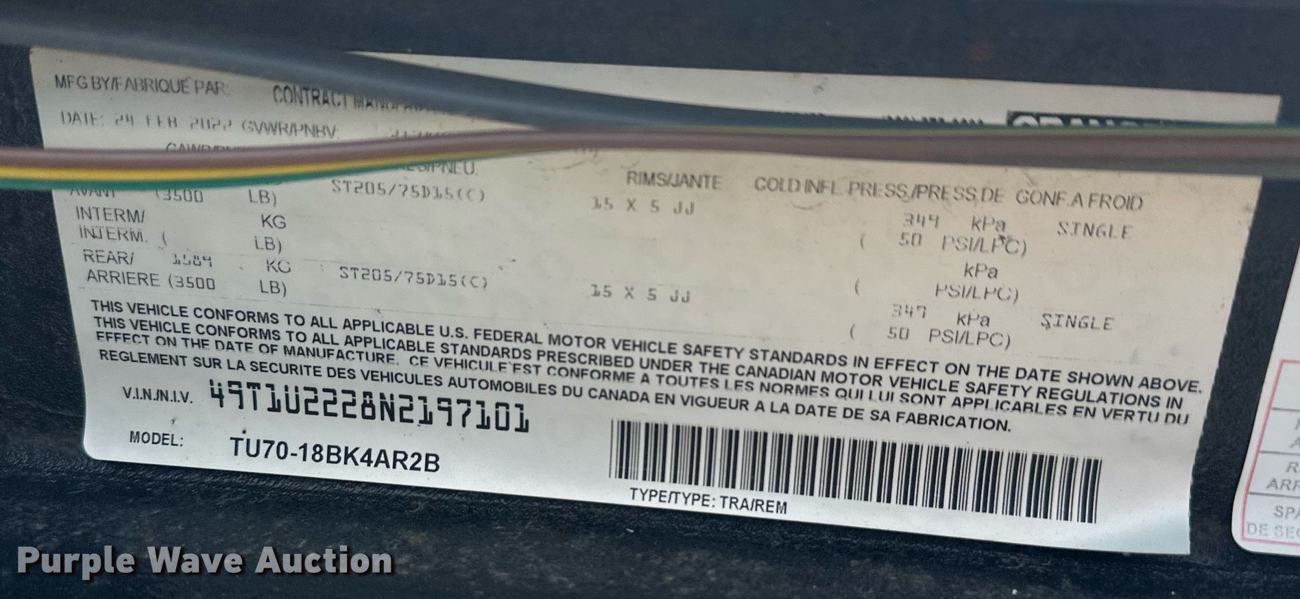 Purple Wave is selling a used Car or Utility Trailer in South Dakota. This item is a 2022 Contract Manufactruing TU70 utility trailer with the following: VIN: 49T1U2228N2197101