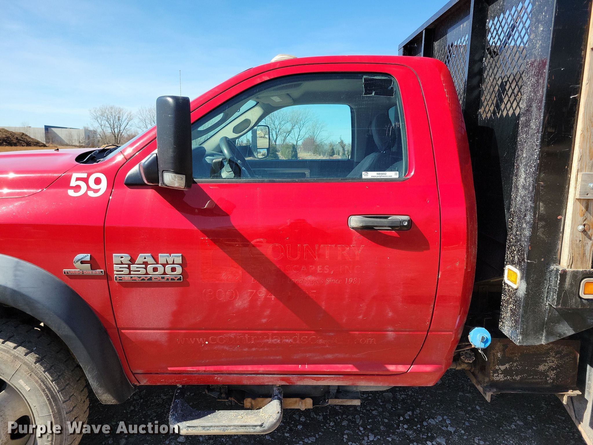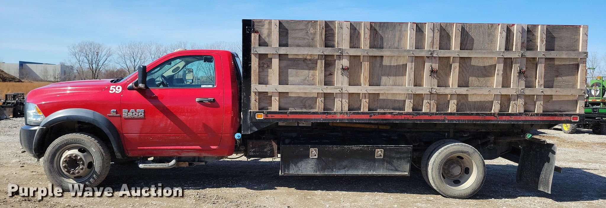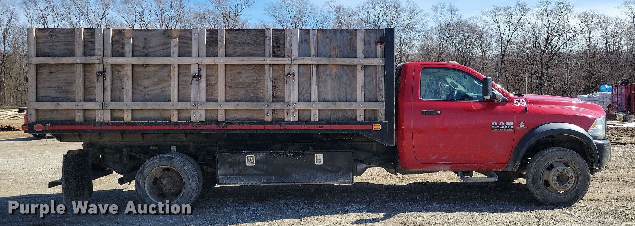 2015 Dodge Ram 5500 dump flatbed truck. Miles: 130,490 on odometer, Hours: 5,405 on meter, VIN: 3C7WRMDL1FG681370. Engine Cummins, Displacement: 6.7L, Cylinders: 6, Fuel type: Diesel. Transmission Automatic. Chassis Axles: Single, Suspension: Spring, Brakes: Hydraulic, PTO, GVWR: 19,500 lbs. Interior AC, Heat, Heated mirrors, Power windows, Power locks, Cruise control, Auxiliary controls, Brake controller. Features Dump flatbed Knapheide, 15' 3" L x 96" W, Ram: Single, Removable sides. Tires Size: 225/70R19.5. Notes Dash warning indicator: Check engine, Low coolant, Windshield chipped or cracked, PTO issues, cable needs replaced. Iowa title. Title distribution may be delayed up to 14 days from verification of funds. Country Landscapes, Inc.. Ames, IA 50010