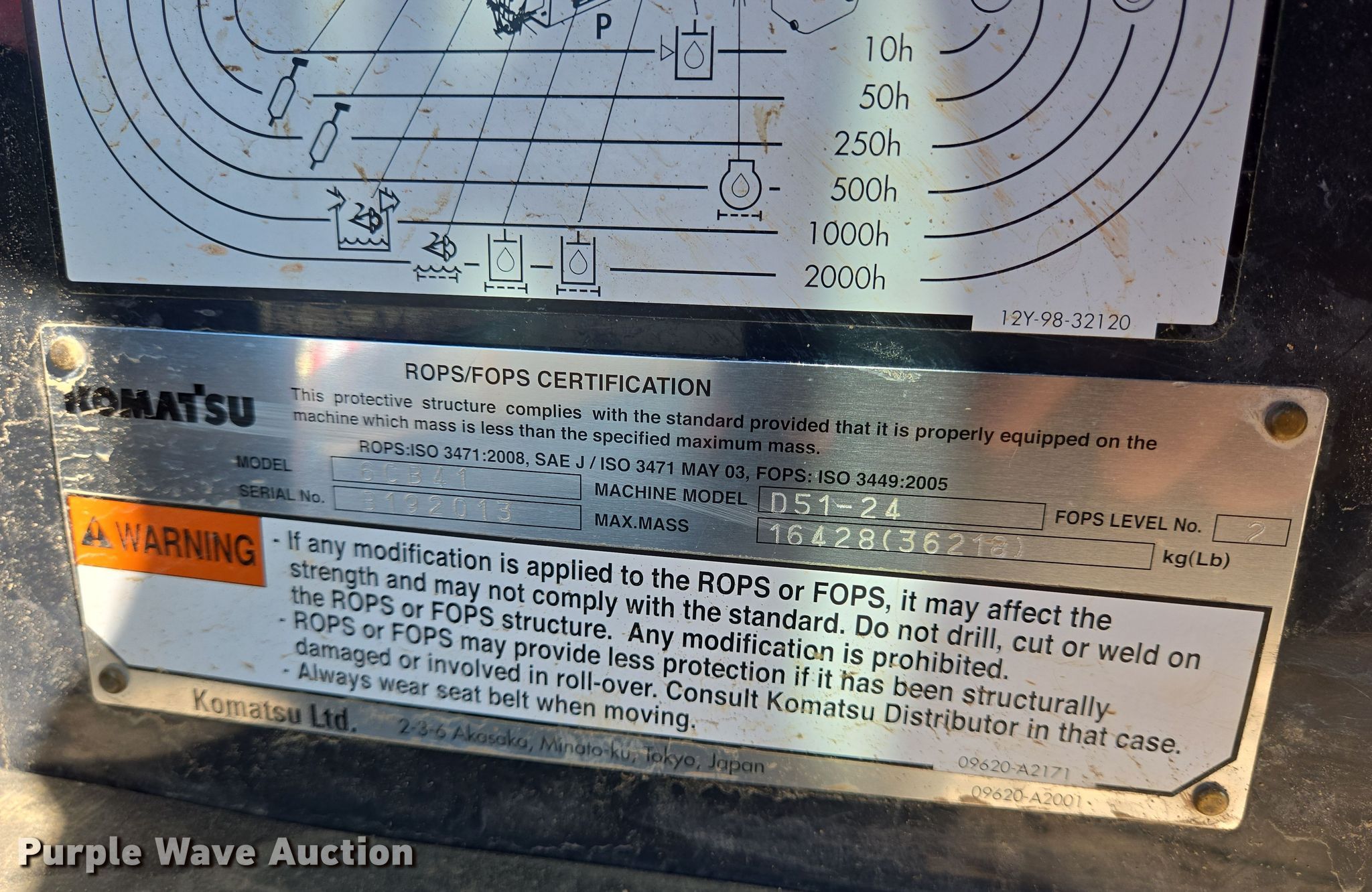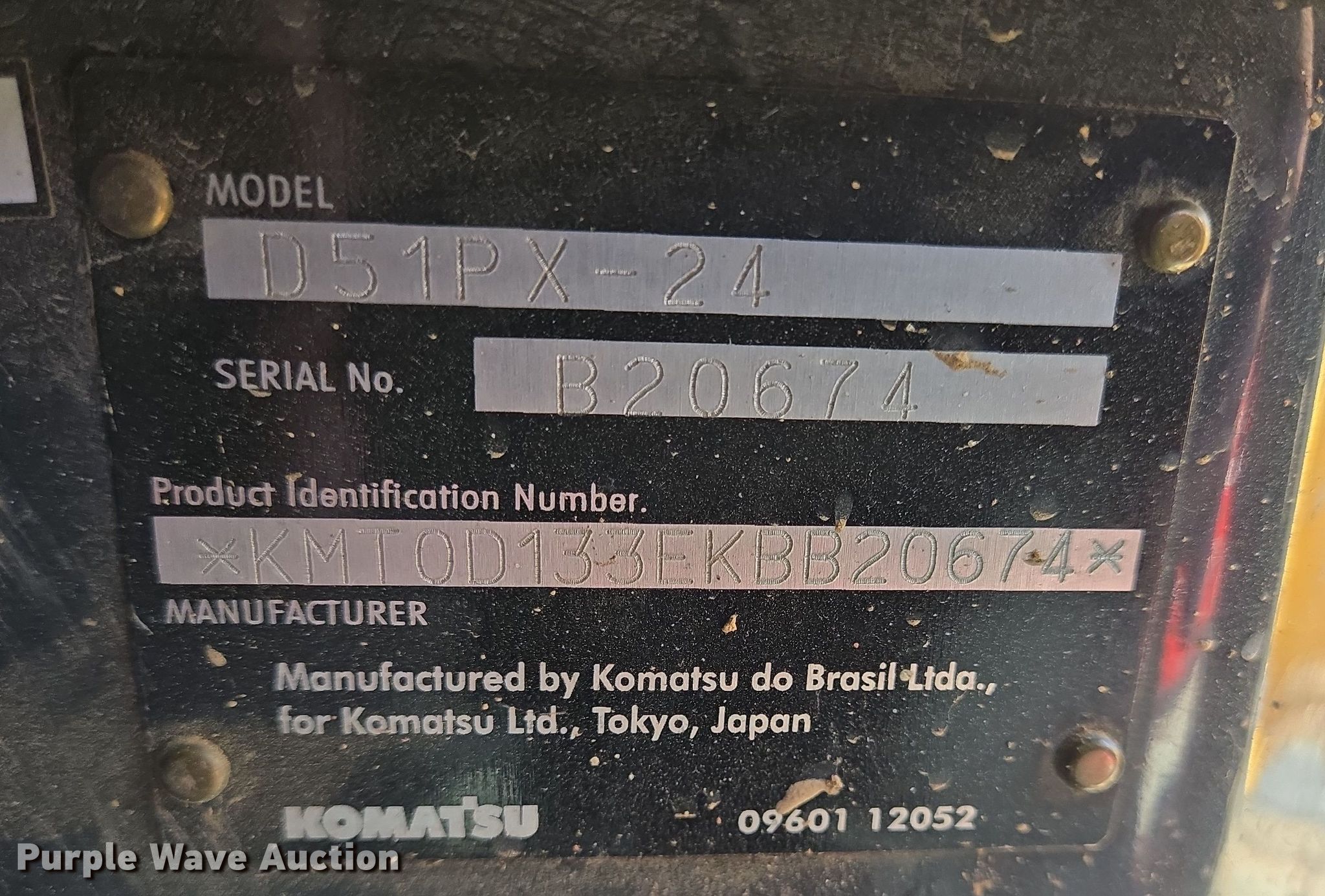 2019 Komatsu D51PX-24 dozer. Hours: 2,209 on meter, Serial: B20674, Unit #: 51204435. Engine Komatsu SAA4D107E-3, Serial: 22347224, Displacement: 4.5L, Cylinders: 4, Fuel type: Diesel, HP: 133, kW: 99. Transmission Hydrostatic. Operators station Enclosed cab, AC, Heat, Backup camera, Electronic Monitoring System panel, Steering: Joystick. Features Screen guards, Sweeps, Rear drawbar, Dozer blade Blade type: 6-way, Blade shape: Straight, Width: 132'. Tracks Width: 28", Grouser pads: Single, Bottom rollers: 6. Notes Possible hydrostatic transmission issues, will not move. Insurance salvage, stored at a secured facility. Please review REQUIRED REMOVAL INSTRUCTIONS. Insurance Salvage. 205 South Rankin Industrial Drive. Florence, MS 39073