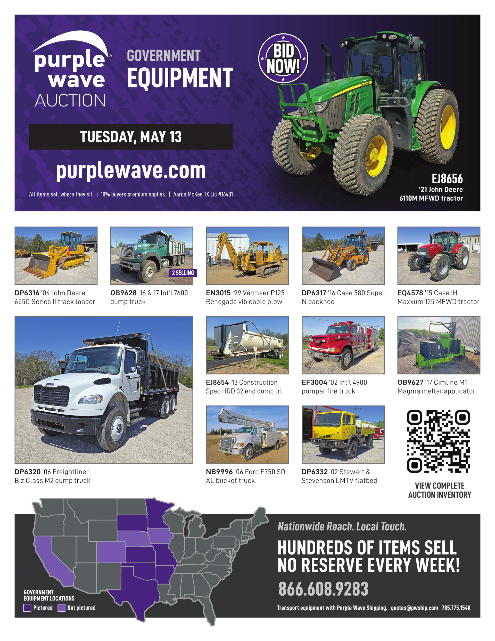 Purple Wave attempts to give its customers an industry leading experience by providing detailed equipment listings. Listings include written descriptions, photographs, location, and consignor information. Equipment descriptions are based on our direct observation and information provided by our selling customer. All information is intended to be as accurate as possible. However, we recommend customers inspect prior to bidding. Purple Wave listings are not intended to be substitutions for inspection. The details provided may differ on equipment based on information provided by the consignor. An error or omission in the listing will not change the results of the bid. It is the responsibility of the buyer to conduct any inspection and examination necessary to satisfy the buyer of all material facts before placing a bid. Purple Wave is not responsible for any statements about the item made by the Seller.