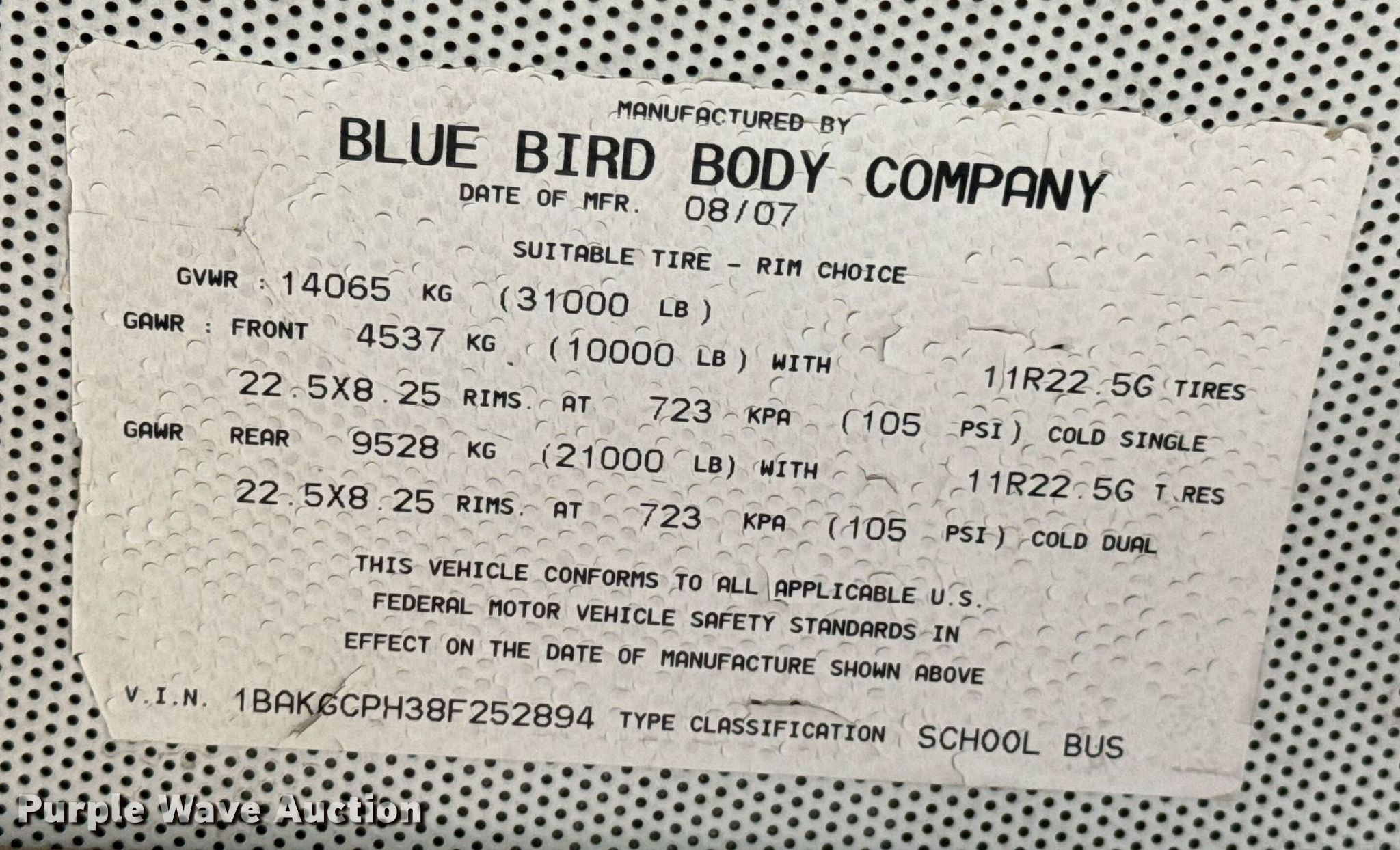Purple Wave is selling a used Bus in Oklahoma. This item is a 2008 Blue Bird Vision school bus with the following: Miles: 107,700 on odometer, VIN: 1BAKGCPH38F252894