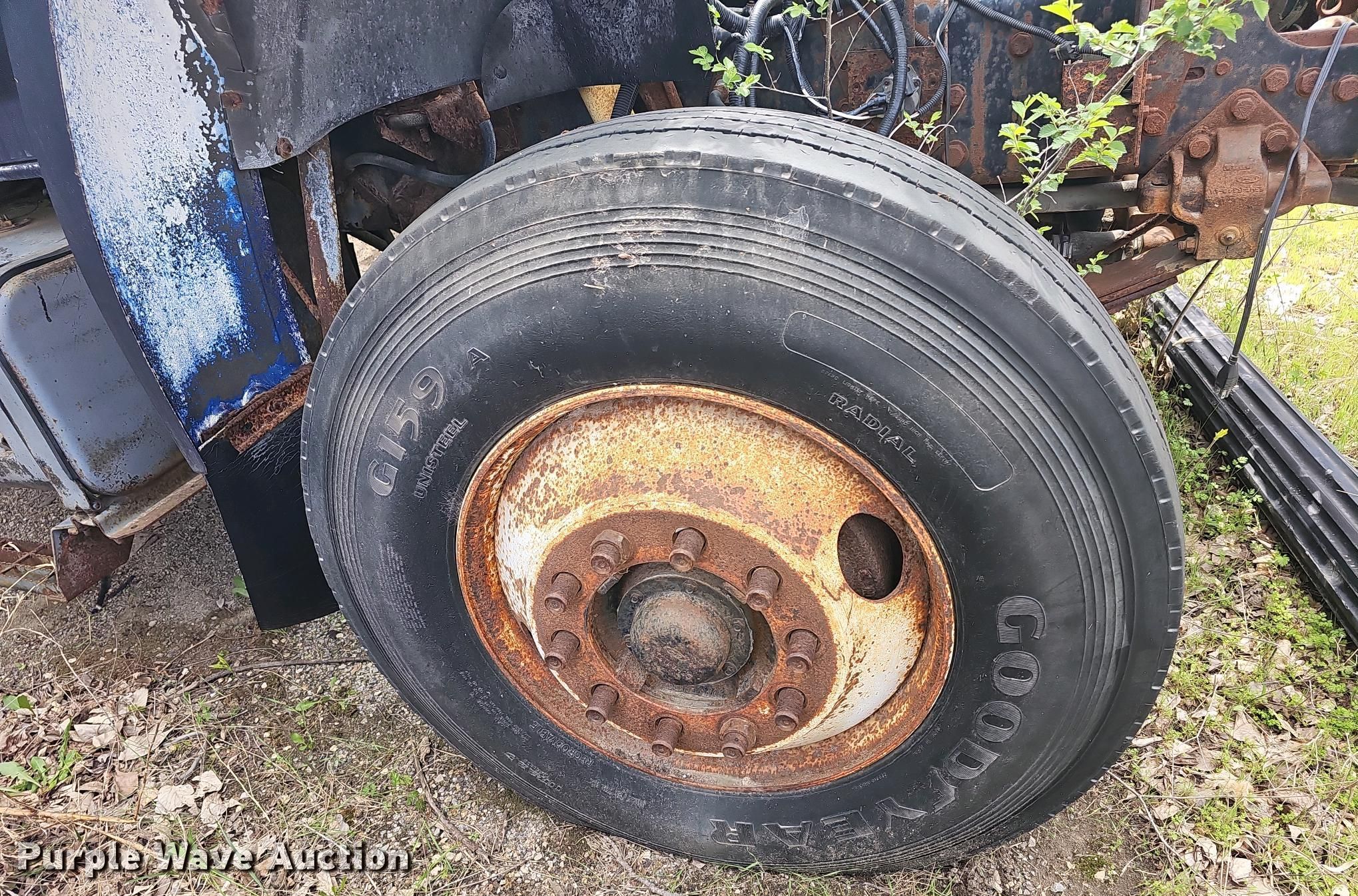 1994 Ford F700 dump truck. Miles: 49,032 on odometer, VIN: 1FDXK74C2RVA17383, Unit #: 685. Engine No engine. Transmission Automatic. Chassis Axles: Single, Suspension: Spring, Brakes: Air, Front mount PTO, GVWR: 33,000 lbs FAWR: 12,000 lbs, RAWR: 21,000 lbs, Wheelbase: 154". Features Dump bed 10' L x 8' W, Side height: 24", Bed type: Steel, Ram: Single. Tires Size: 11R22.5. Notes Parts only, Parts may be missing, Passenger door issues, will not open, Flat tires, Tires off bead, Dead battery, Non-operational unit Unit must be towed or hauled. Kansas title. Junction City, KS 66441