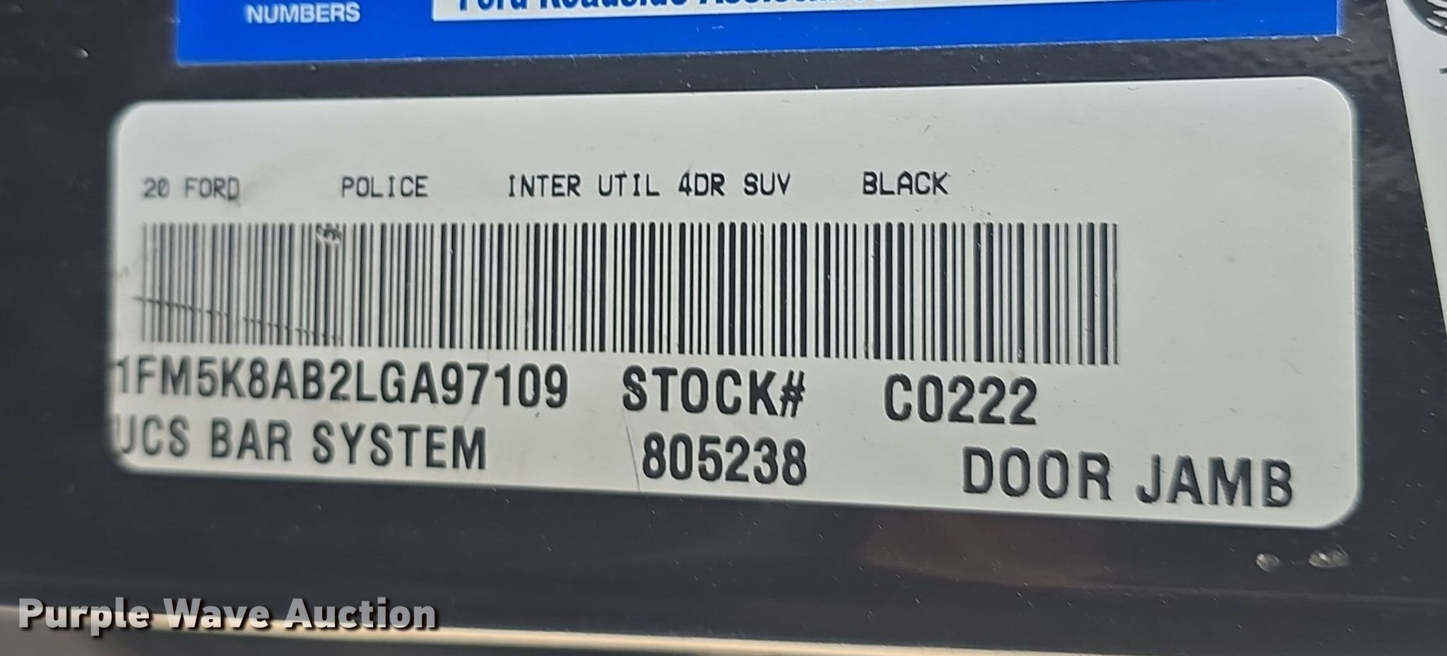 Purple Wave is selling a used Passenger Vehicle in Kansas. This item is a 2020 Ford Explorer Police Interceptor SUV with the following: Miles: 91,577 on odometer, VIN: 1FM5K8AB2LGA97109, Unit #: 02050443