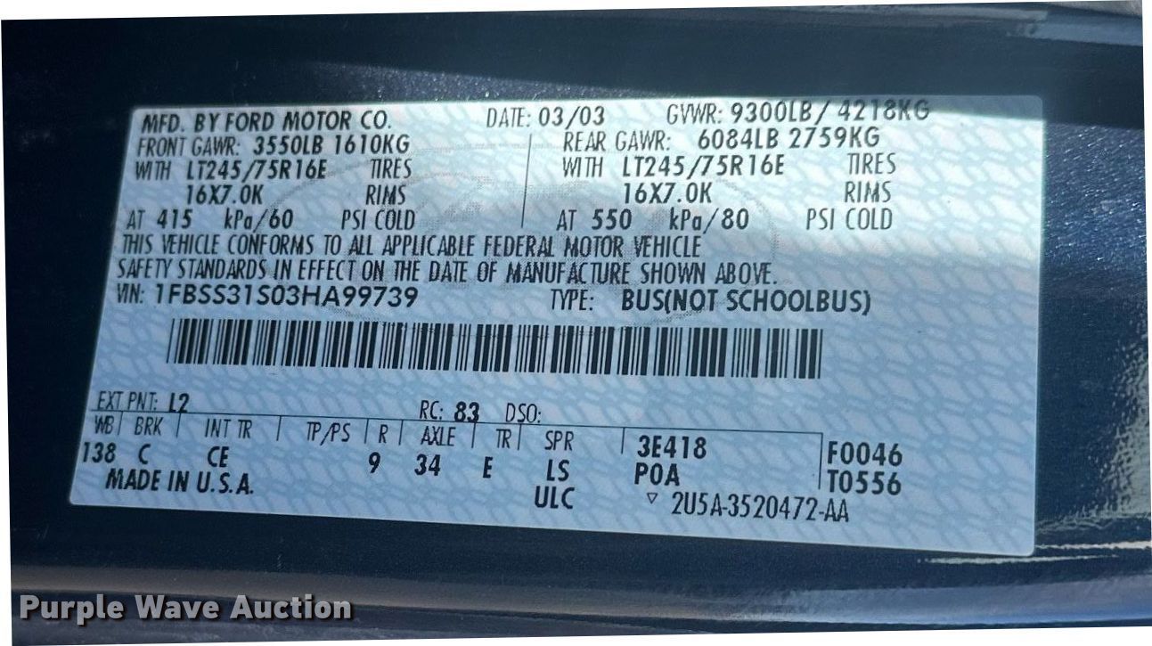 Purple Wave is selling a used Passenger Vehicle in South Dakota. This item is a 2003 Ford E350 van with the following: Miles: 95,899 on odometer, VIN: 1FBSS31S03HA99739