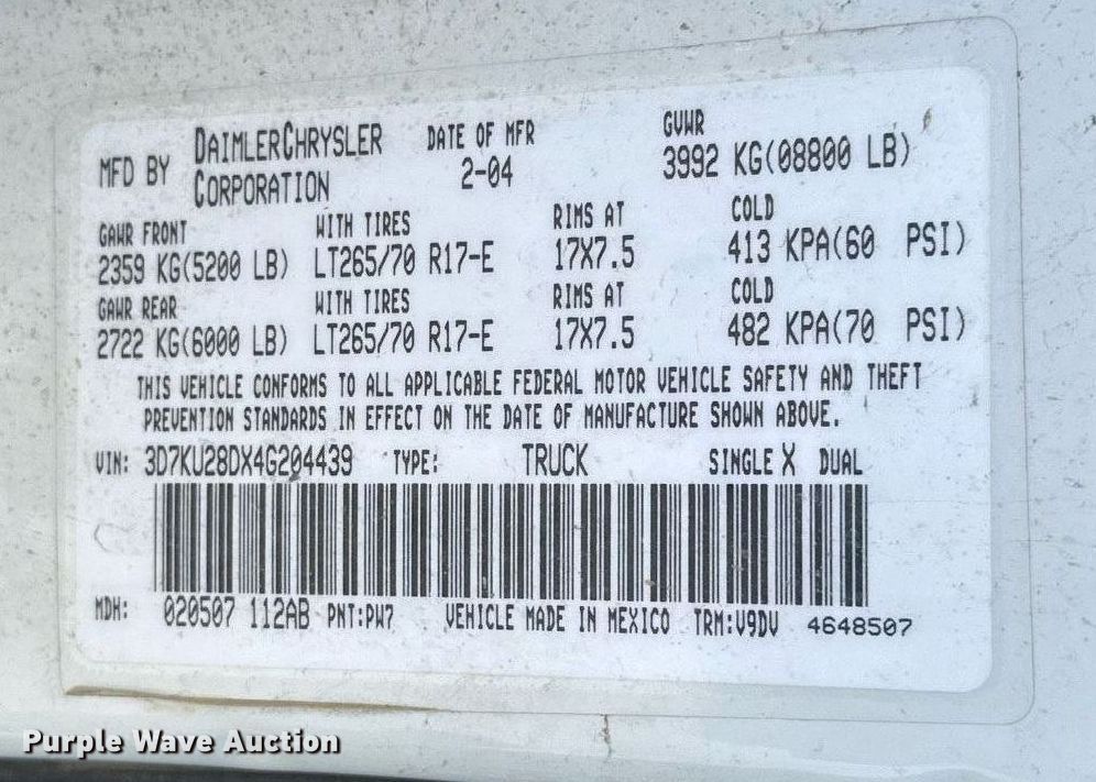 • VIN: 3D7KU28DX4G204439