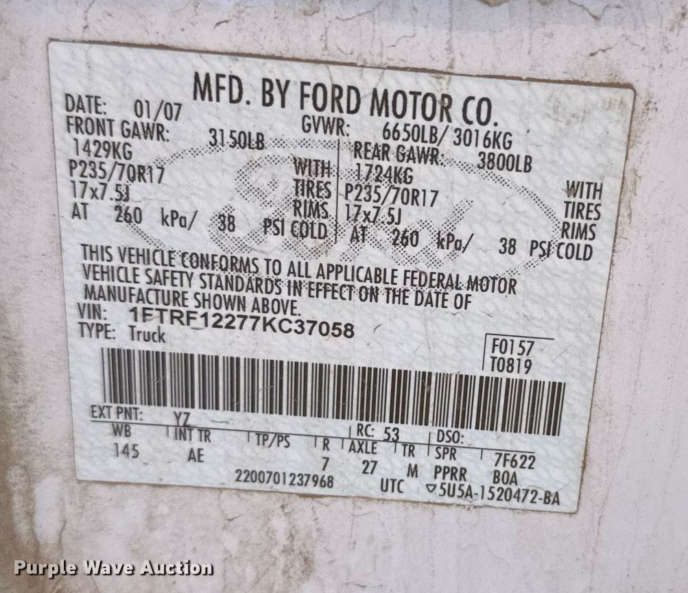 Purple Wave is selling a used 1/2 Ton Pickup or Van in Kansas. This item is a 2007 Ford F150 XL pickup truck with the following: Miles: 110,037 on odometer, VIN: 1FTRF12277KC37058
