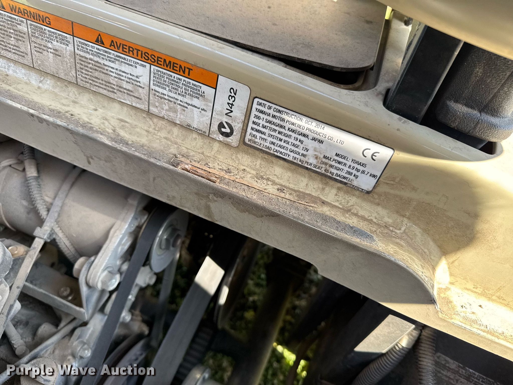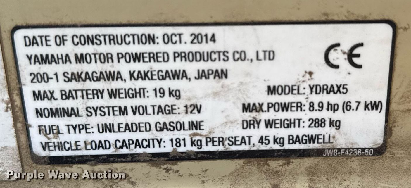 2014 Yamaha YDRAX5 golf cart. Hours: 1,834 on meter. Engine Yamaha, Displacement: 357 cc, Cylinders: 1, Fuel type: Gas, Electric start. Transmission Hydrostatic. Operators station Canopy. Features Receiver hitch, Bed 30" L x 42" W. Tires Size: 18x8.5-8. Salina, KS 67401