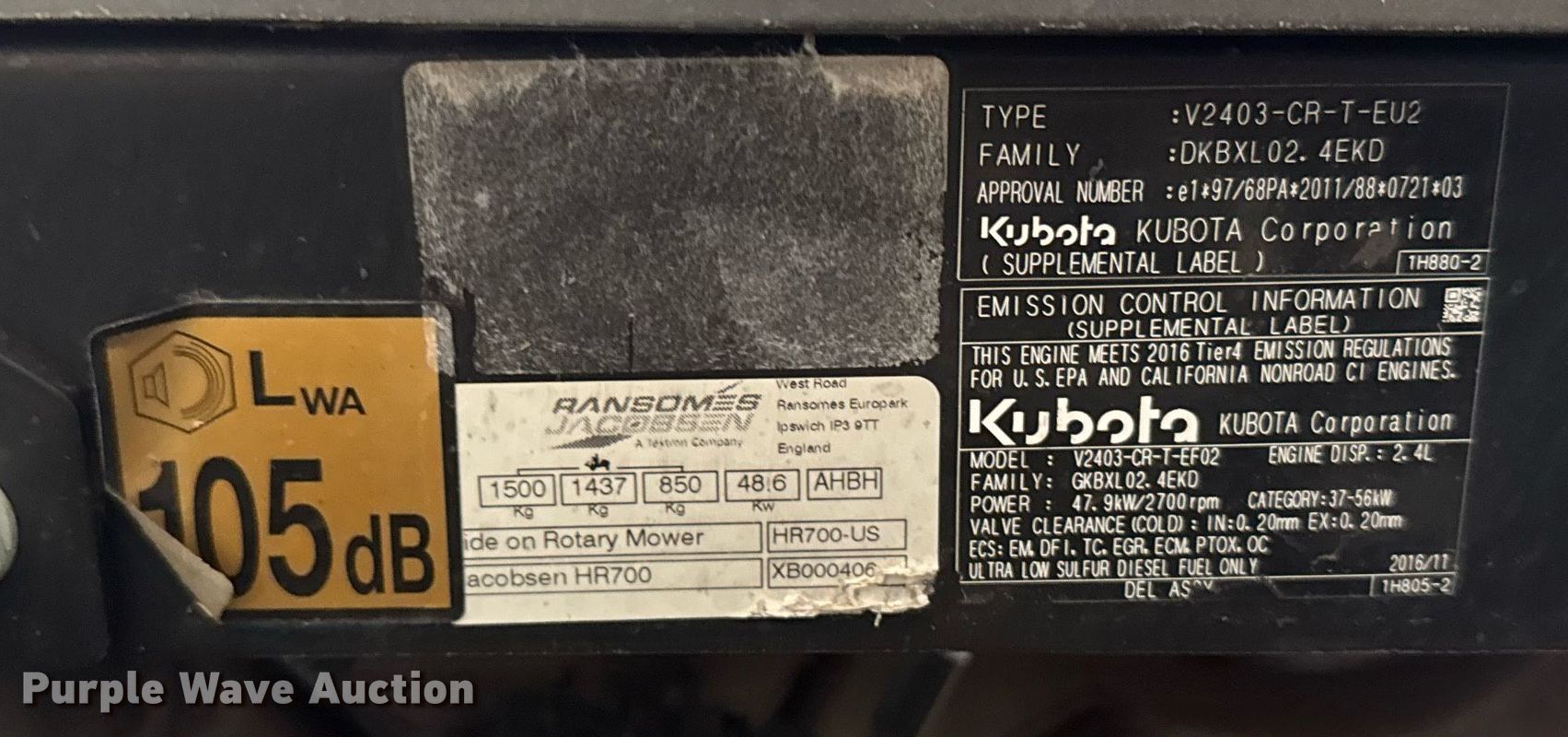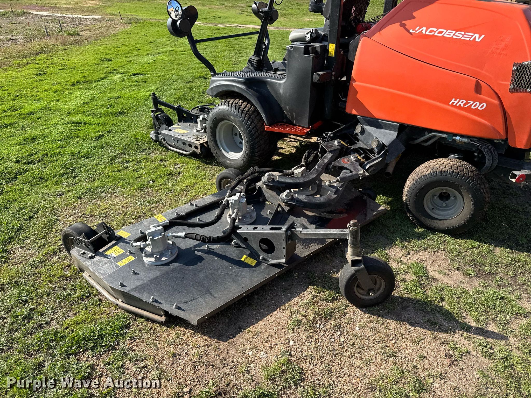 Jacobson HR700 ZTR lawn mower. Hours: 2,620 on meter, Cutting width: 168", Serial: XB000406. Engine Kubota V2403-CR-T-EF02, Displacement: 2.4L, Cylinders: 3, Fuel type: Diesel. Transmission Hydrostatic. Features Hydraulic fold decks, Hydraulic front deck lift, Flip up front deck, Hydraulic conversion kit. Tires Front: 26x12.00-12, Rear: 20x10.00-8. Notes Dead battery. Salina, KS 67401