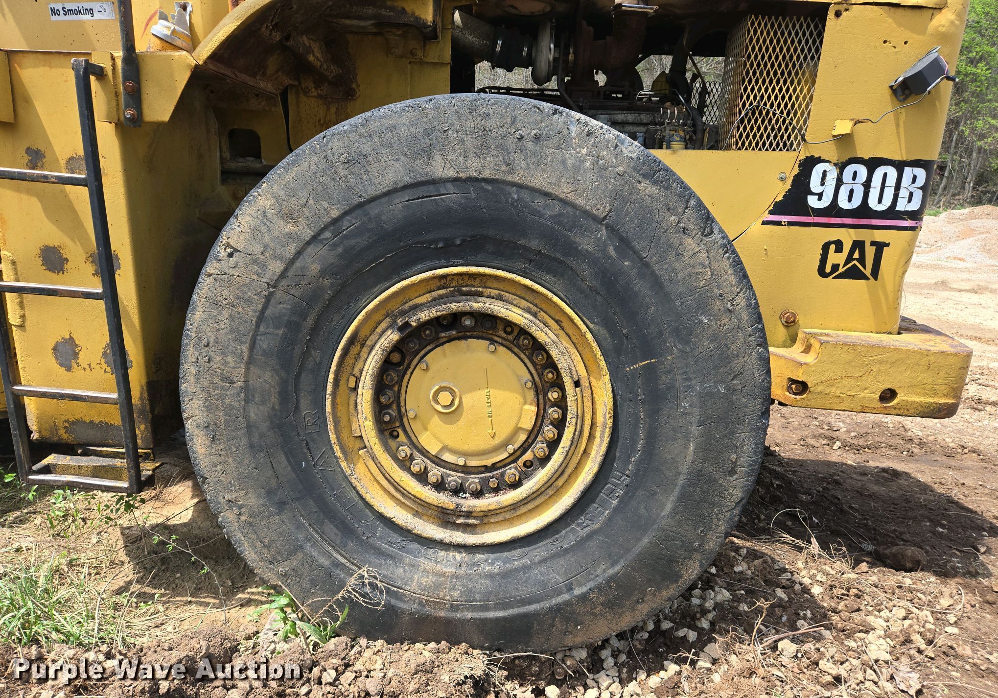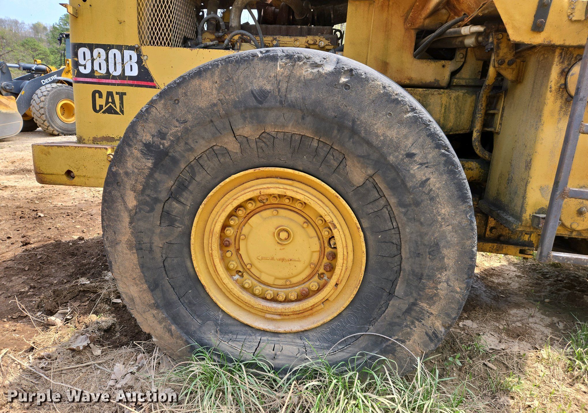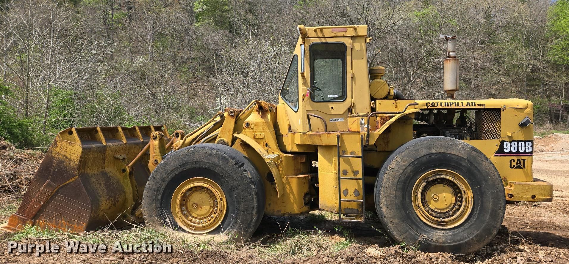 1976 Caterpillar 980B wheel loader. Hours: 4,441 on meter, Serial: 89P5318. Engine Caterpillar 3206, Cylinders: 6, Fuel type: Diesel. Transmission Powershift, 4F - 4R. Operators station Enclosed cab, Bucket controls: Two-lever. Features Counter weights, Bucket Width: 127", Cutting edge: Bolt-on. Tires Size: 26.5-25. Notes Glass cracked, Dead battery, Drivers side front tire flat, Non-operational unit. Shannon County, MO. Black Pond Township, MO 65438