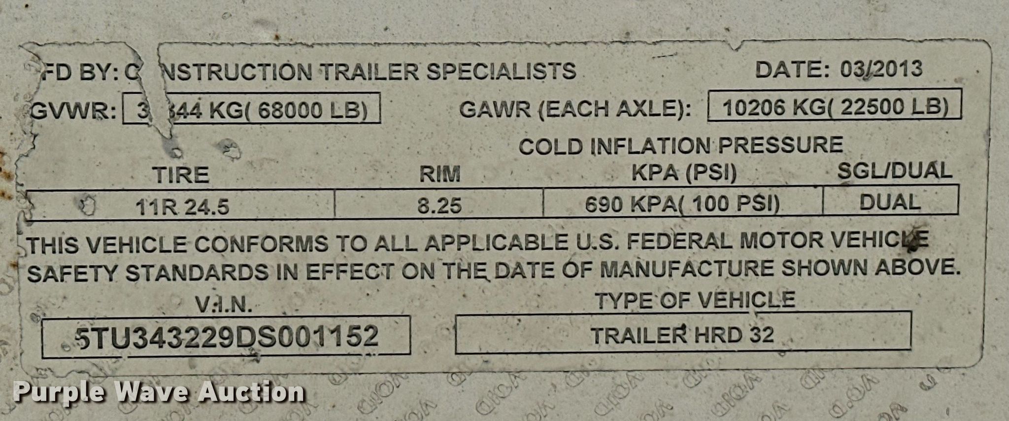 2013 Construction Specialists Trailers HRD 32 end dump trailer. VIN: 5TU343229DS001152. Dimensions Overall: 34' L x 102" W, Body: 32' L x 96" W, Side height: 42". Features Body type: Steel, Ram: Single, End gate: Air operated, Roll tarp. Chassis Landing gear: Dual, Suspension: Spring, Brakes: Air, Axles: Tandem, GVWR: 68,000 lbs, GAWR: 22,500 lbs. Tires Steel wheels, Size: 11R24.5. Notes Flat tire. Oklahoma title. Title distribution may be delayed up to 14 days from verification of funds. Lincoln County District 3. 10408 Veterans Dr. Meeker, OK 74855