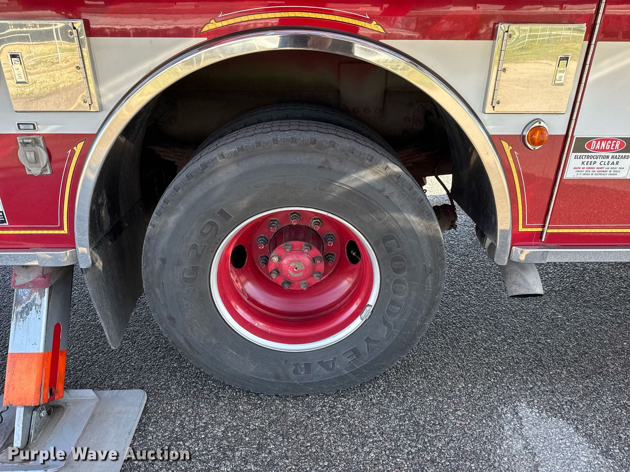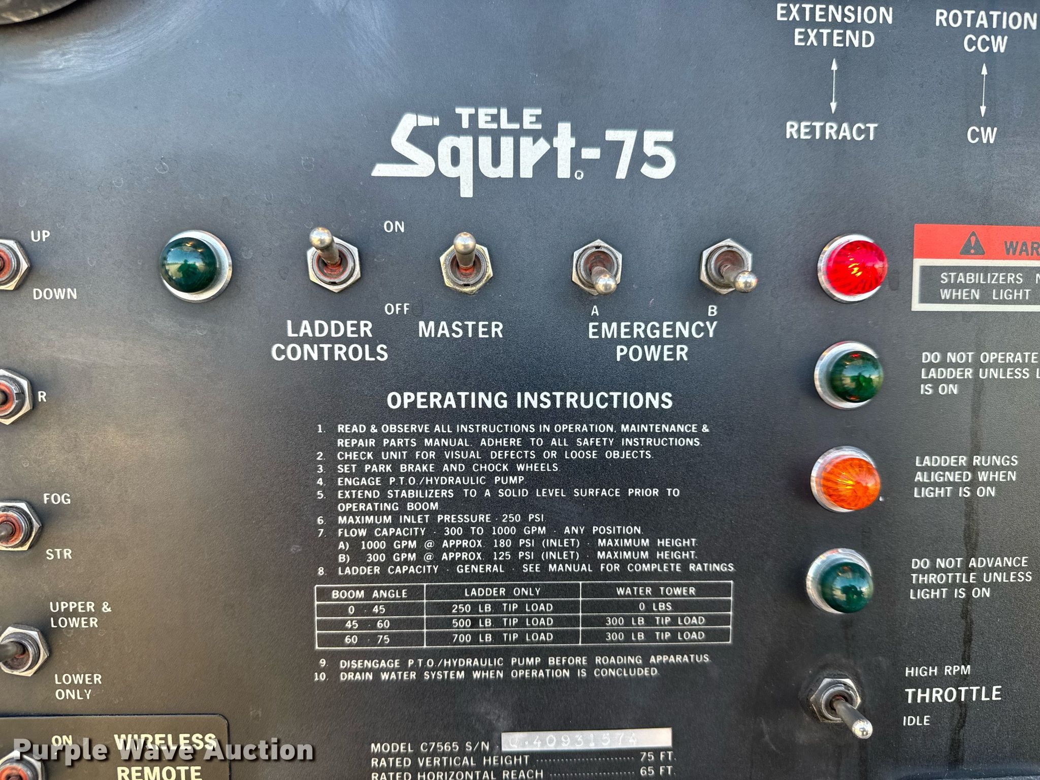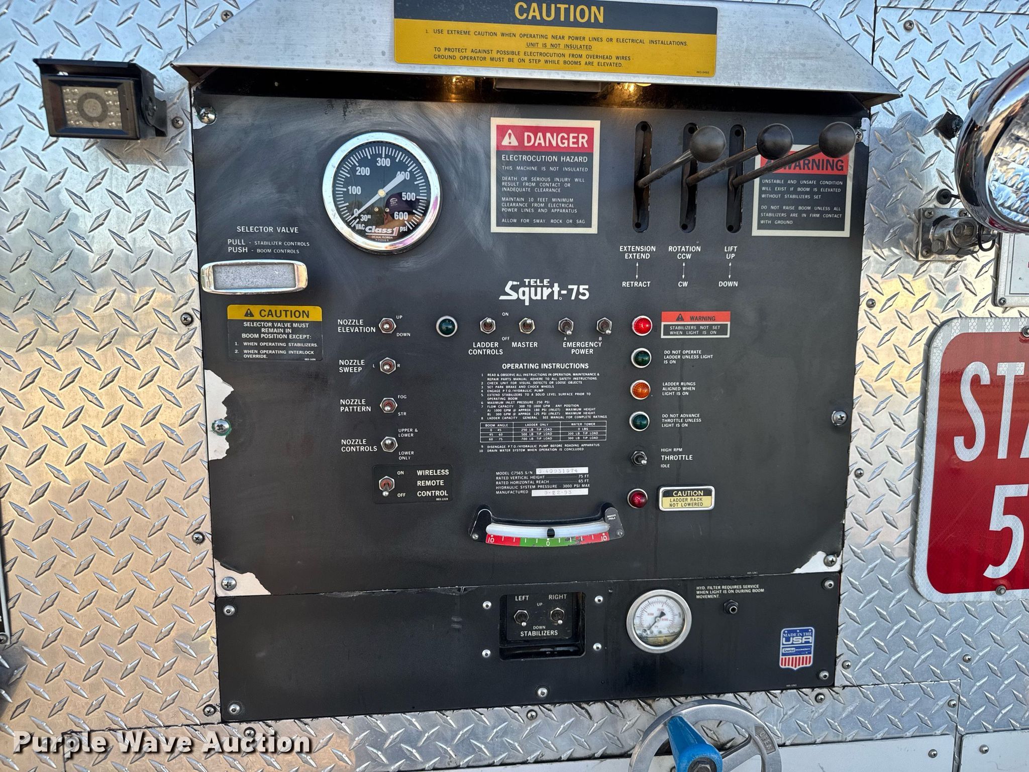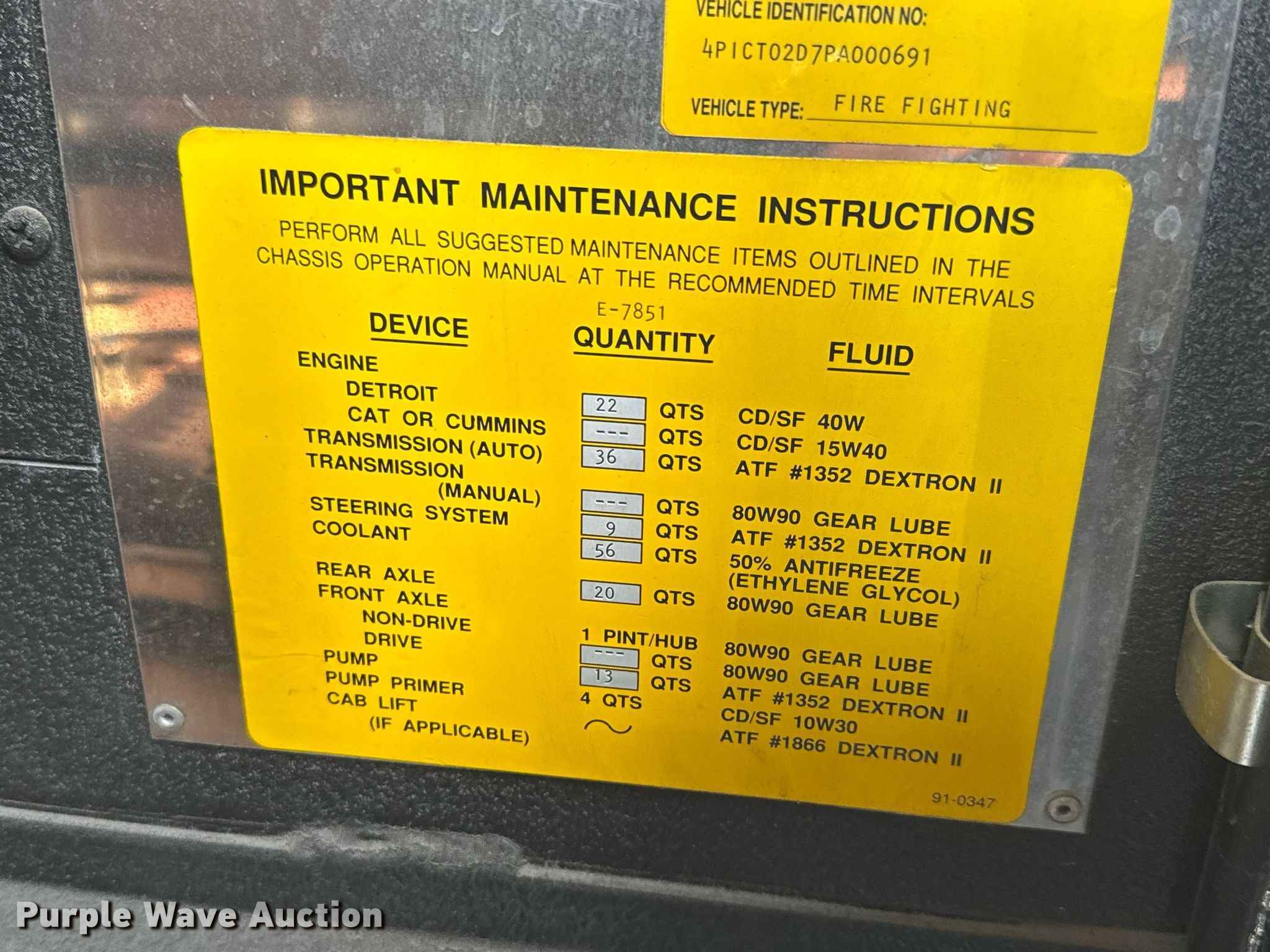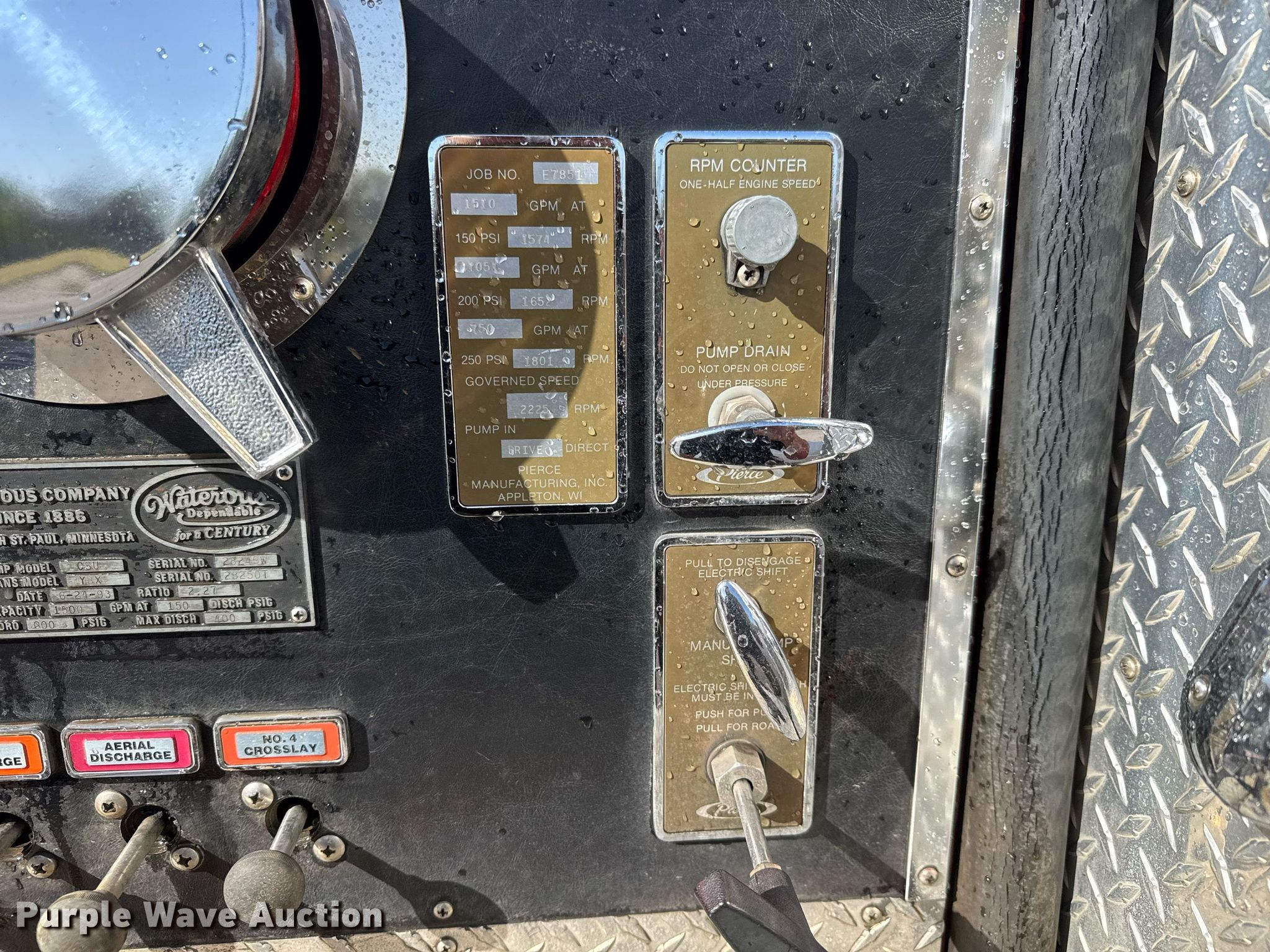 1993 Pierce Lance quint fire truck. Miles: 34,331 on odometer, Hours: 4,715 on meter, VIN: 4P1CT02D7PA000691. Engine Detroit Diesel 6V 92TA DDEC, Displacement: 552 C.I.D., Cylinders: 6, Fuel type: Diesel, HP: 350. Transmission Automatic. Chassis Axles: Single, Suspension: Spring, Brakes: Air, GVWR: 52,000 lbs. Interior AC, Heat, Backup camera. Features Fire truck body Aerial Model: Tele Squrt-75 C7565, Maximum height: 75', Maximum lift capacity: 700 lbs, Stabilizers Quantity: 4, Elevated deck gun 75 gpm, Tank Capacity: 500 gallons, Pump 1,500 gpm, Hours: 489 on meter, Ground ladder, Generator Honda EM5000S, Fuel type: Gas, PA/ siren controls. Tires Size: 425/65R22.5. Notes Possible chip or crack in aerial ladder turntable, Aerial ladder rotation issues, slow clockwise rotation, Hydraulic leak, Unknown operating condition of AC. Kansas title. Title distribution may be delayed up to 14 days from verification of funds. El Dorado, KS 67042