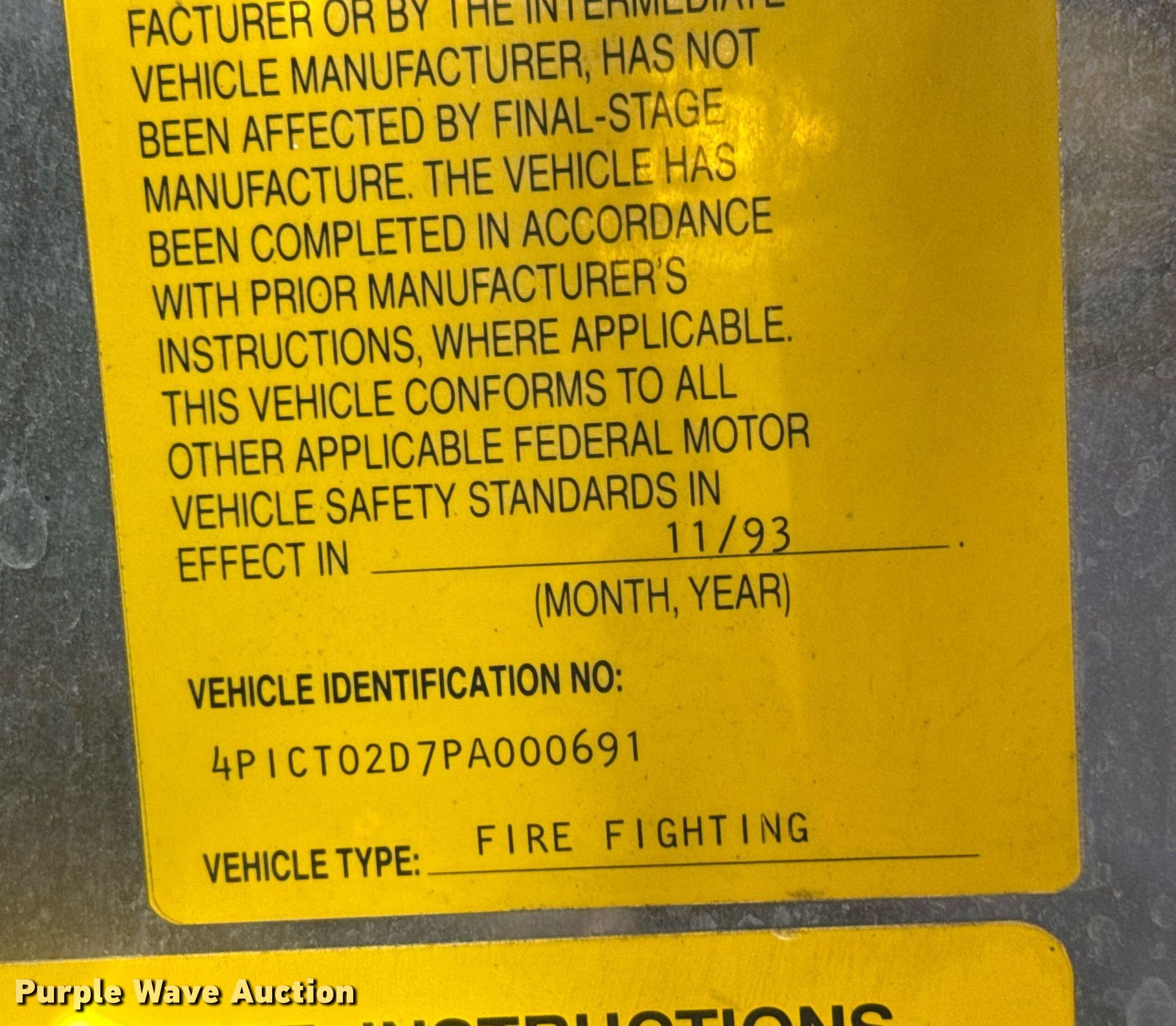 Purple Wave is selling a used Fire Truck or Emergency Vehicle in Kansas. This item is a 1993 Pierce Lance quint fire truck with the following: Miles: 34,331 on odometer, Hours: 4,715 on meter, VIN: 4P1CT02D7PA000691