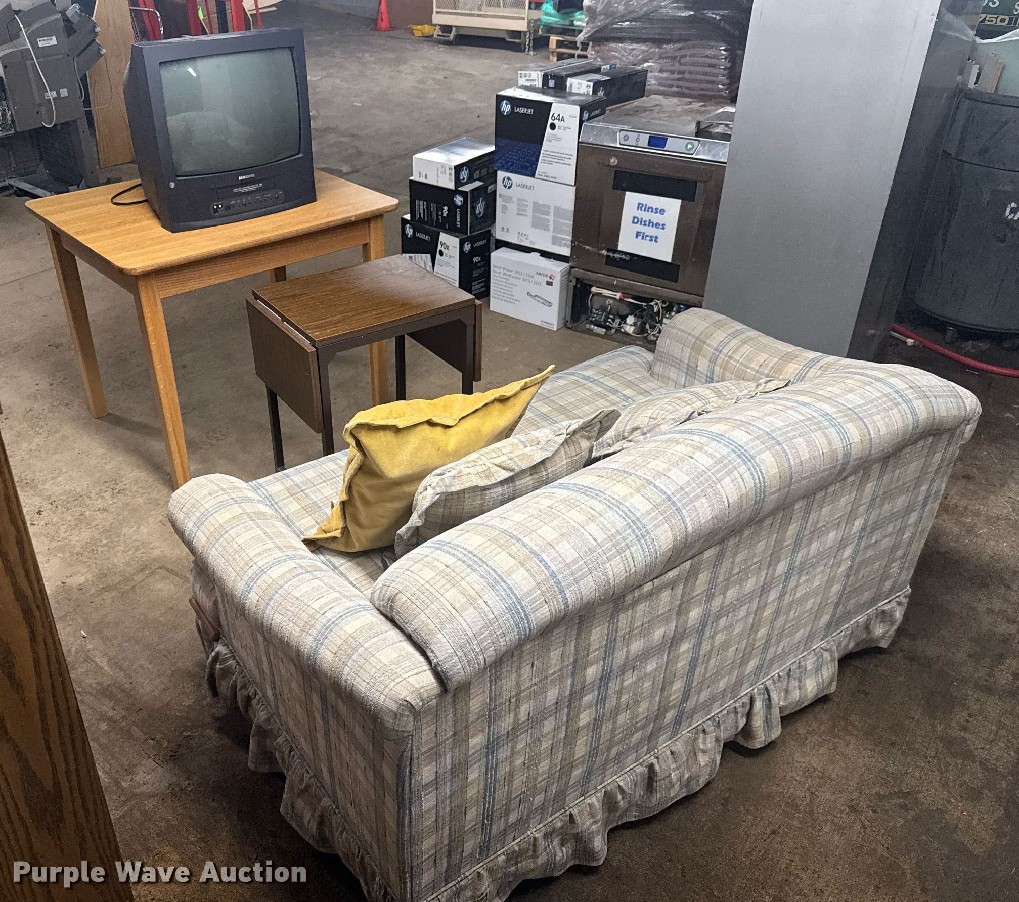 Purple Wave is selling a used Appliances in Kansas. This item is a Appliances with the following: (2) tables, Couch, Samsung television, Maytag dishwasher, U-Line mini refrigerator