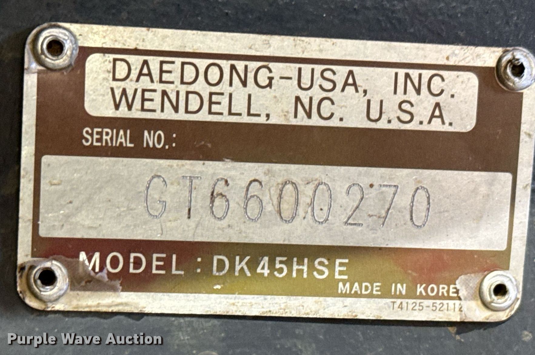 2007 Kioti DK45HSE MFWD tractor. Hours: 1,005 on meter, Serial: GT6600270. Engine Daedong 4A220LXH, Displacement: 2.197L, Cylinders: 4, Fuel type: Diesel. Transmission Hydrostatic, 3F - 3R, Differential lock. Features PTO: 540, Three point Top link, Rear: 1, Loader Kioti KL401, Quick attach, Bucket Width: 73".. Tires Front: 10-16.5, Rear: 14.9-24. Notes Engine issues, possible cracked head. Trinity Academy. Wichita, KS 67206