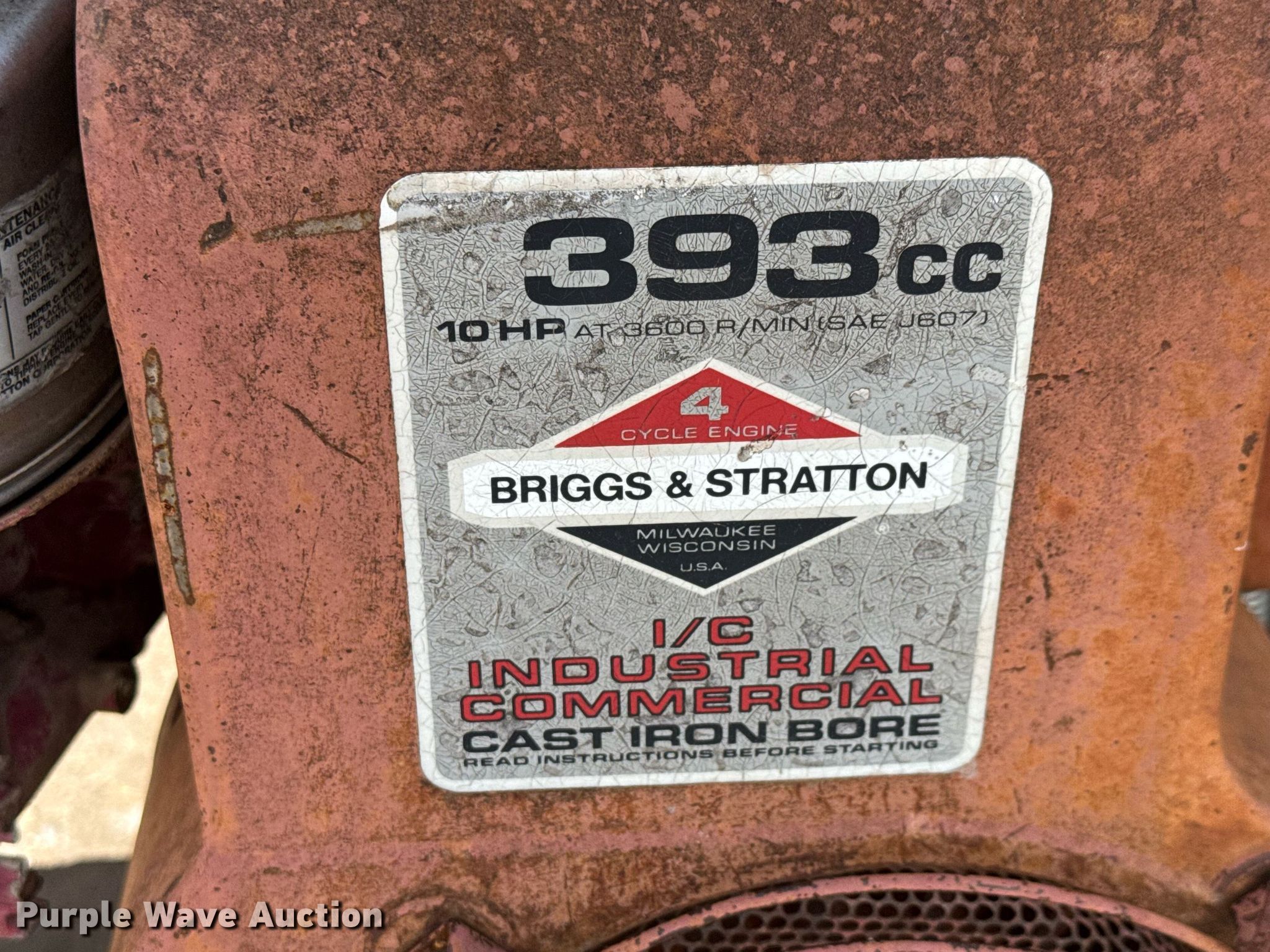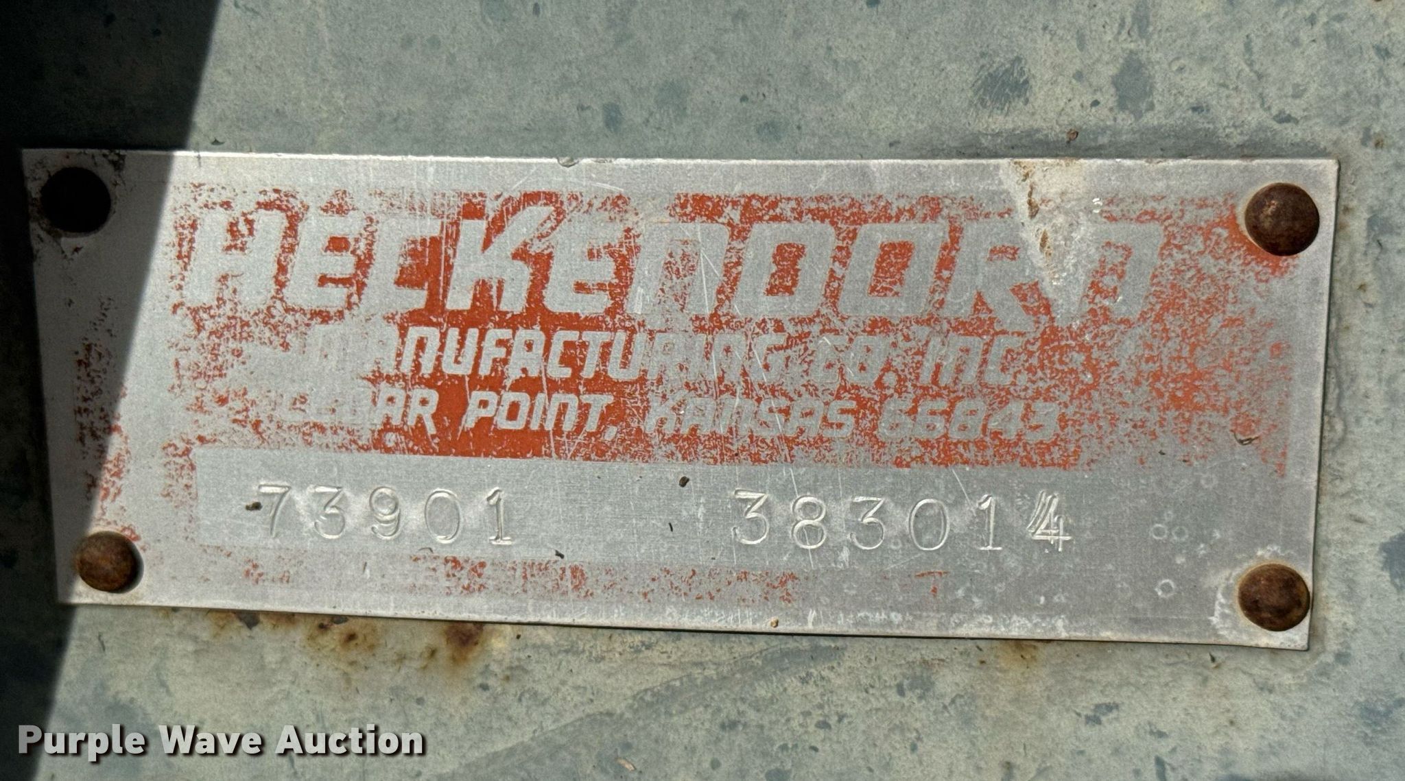 Heckendorn 73901 lawn mower. Cutting width: 36", Serial: 383014. Engine Briggs & Stratton, Displacement: 393 cc, Cylinders: 1, Fuel type: Gas, HP: 10. Transmission Manual, Speed: 3. Tires Front: 4.80-8, Rear: 16x6.50-8. Notes Unknown operating condition. City of Pratt, KS. Pratt, KS 67124