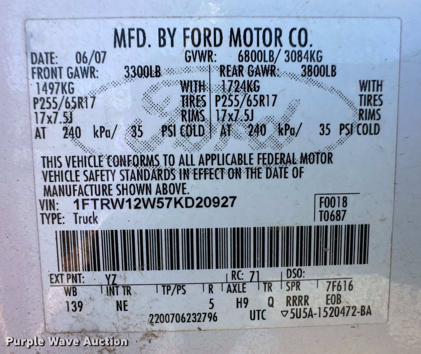 Purple Wave is selling a used 1/2 Ton Pickup or Van in Texas. This item is a 2007 Ford F150 SuperCrew pickup truck with the following: Miles: 119,550 on odometer, VIN: 1FTRW12W57KD20927