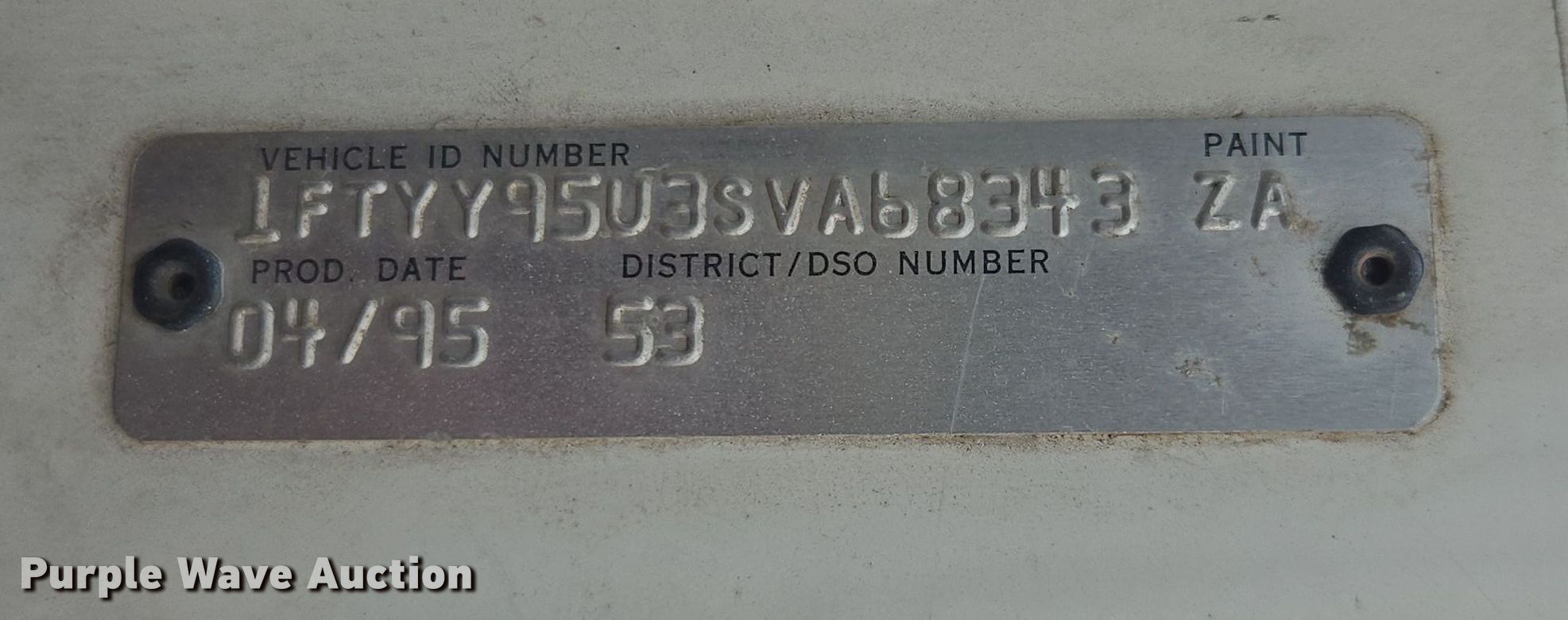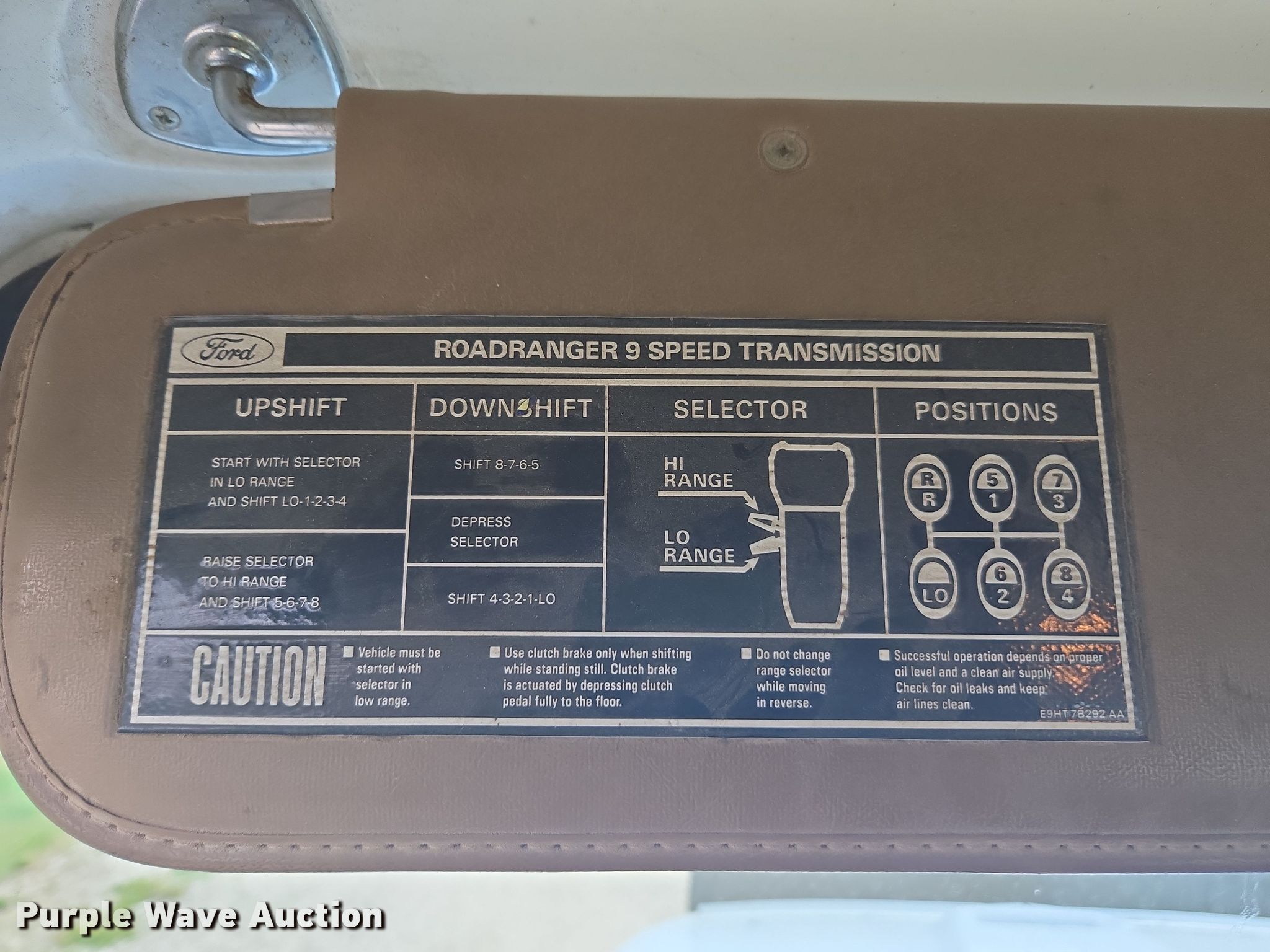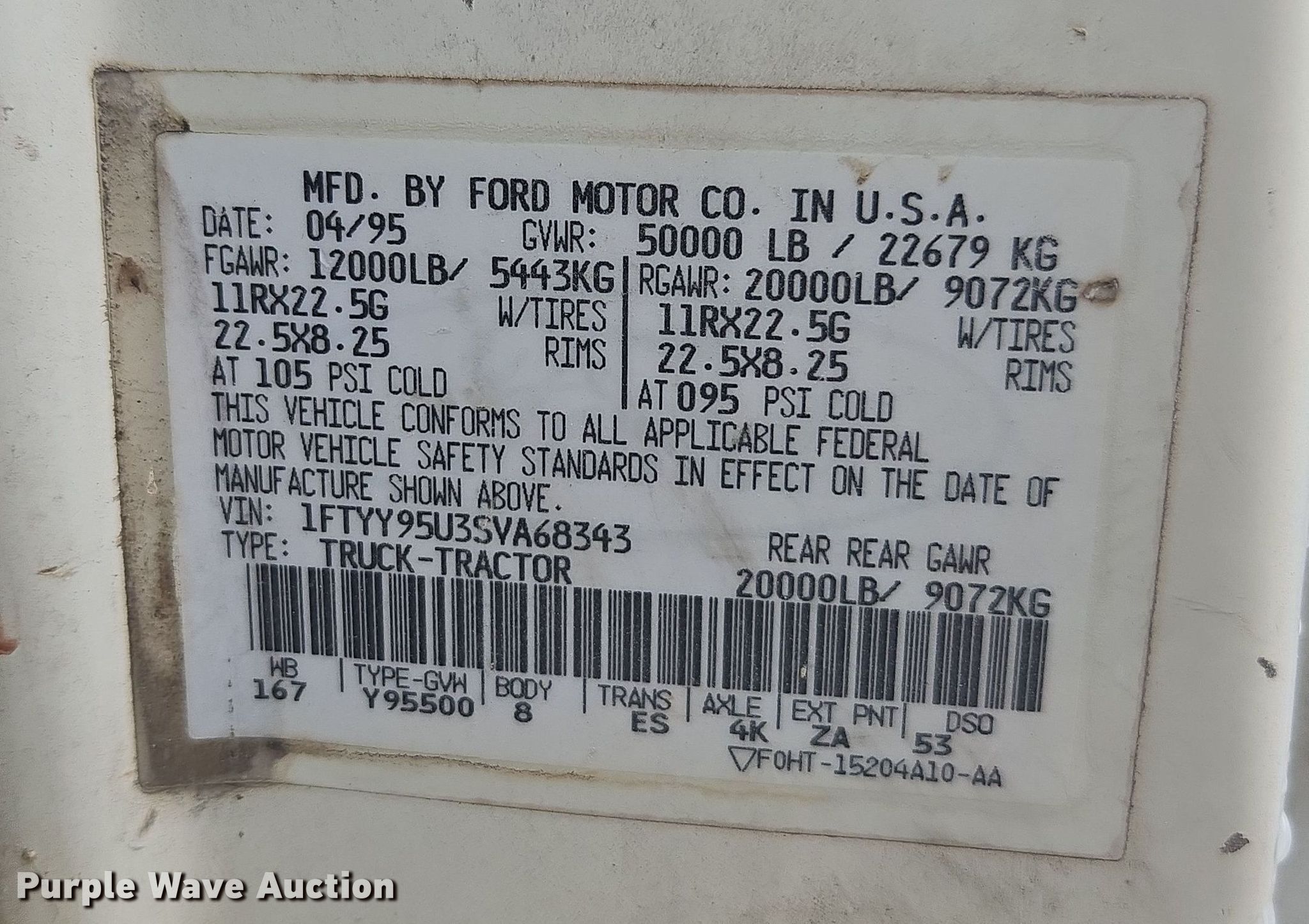 1995 Ford L9000 semi truck. Miles: 561,095 on odometer, VIN: 1FTYY95U3SVA68343. Engine Cummins N14-350E, Displacement: 14.0L, Cylinders: 6, Fuel type: Diesel. Transmission Manual, Speed: 9. Chassis Axles: Tandem, Differential lock: Inter-axle, Suspension: Air, Brakes: Air, PTO, Wet kit, GVWR: 50,000 lbs FAWR: 12,000 lbs, IAWR: 20,000 lbs, RAWR: 20,000 lbs. Interior AC, Heat. Features Deck plate: Aluminum, Fifth wheel type: Air operated, Sliding, Fuel tank: Dual. Tires Size: 11R22.5. Notes Dead battery. Pursuant to Missouri law, Purple Wave will not be collecting sales taxes on any of the purchases made in this business liquidation auction.. Missouri title. Title distribution may be delayed up to 14 days from verification of funds. M3 Hilltop Ranch Retirement - Open Inspection May 13th. 3939 Missouri 125. Rogersville, MO 65742