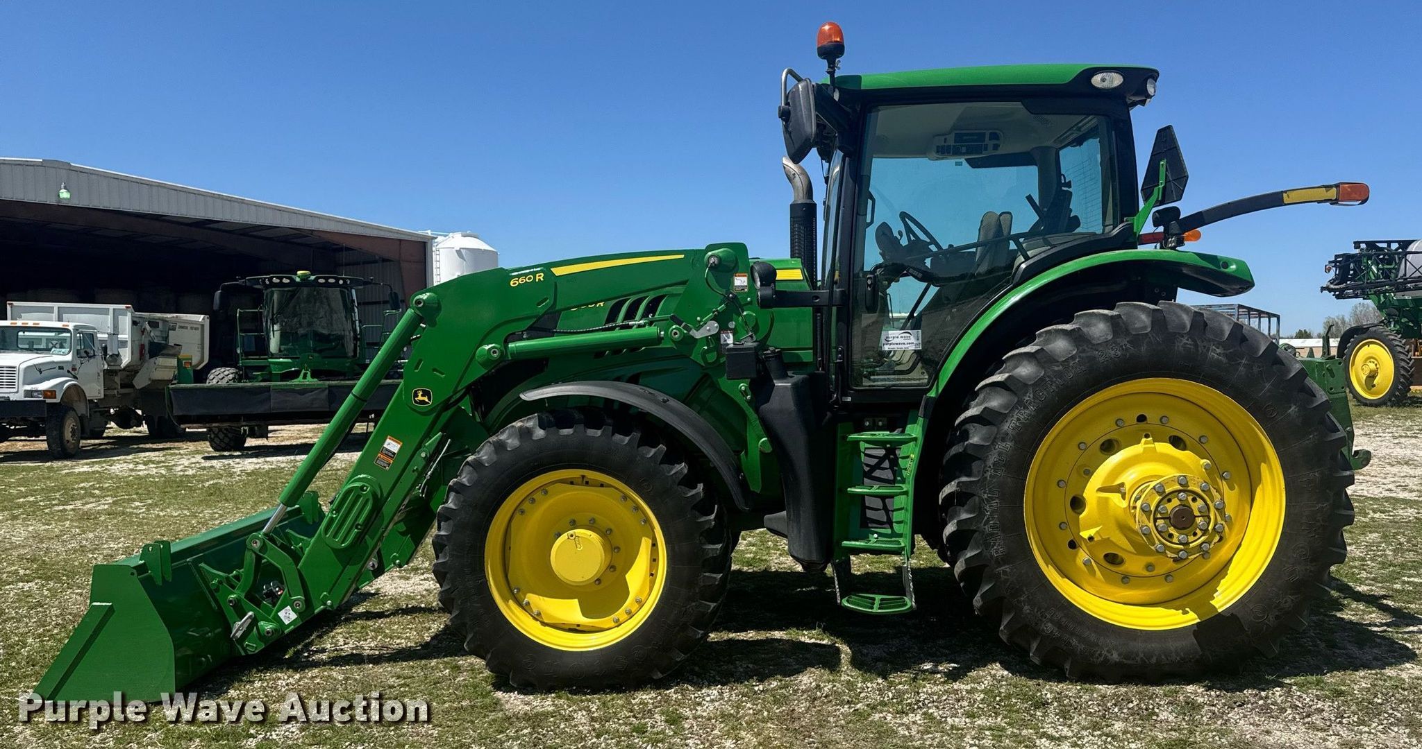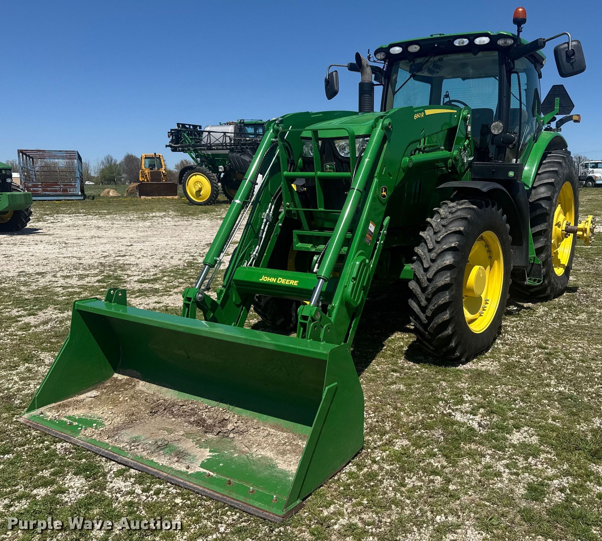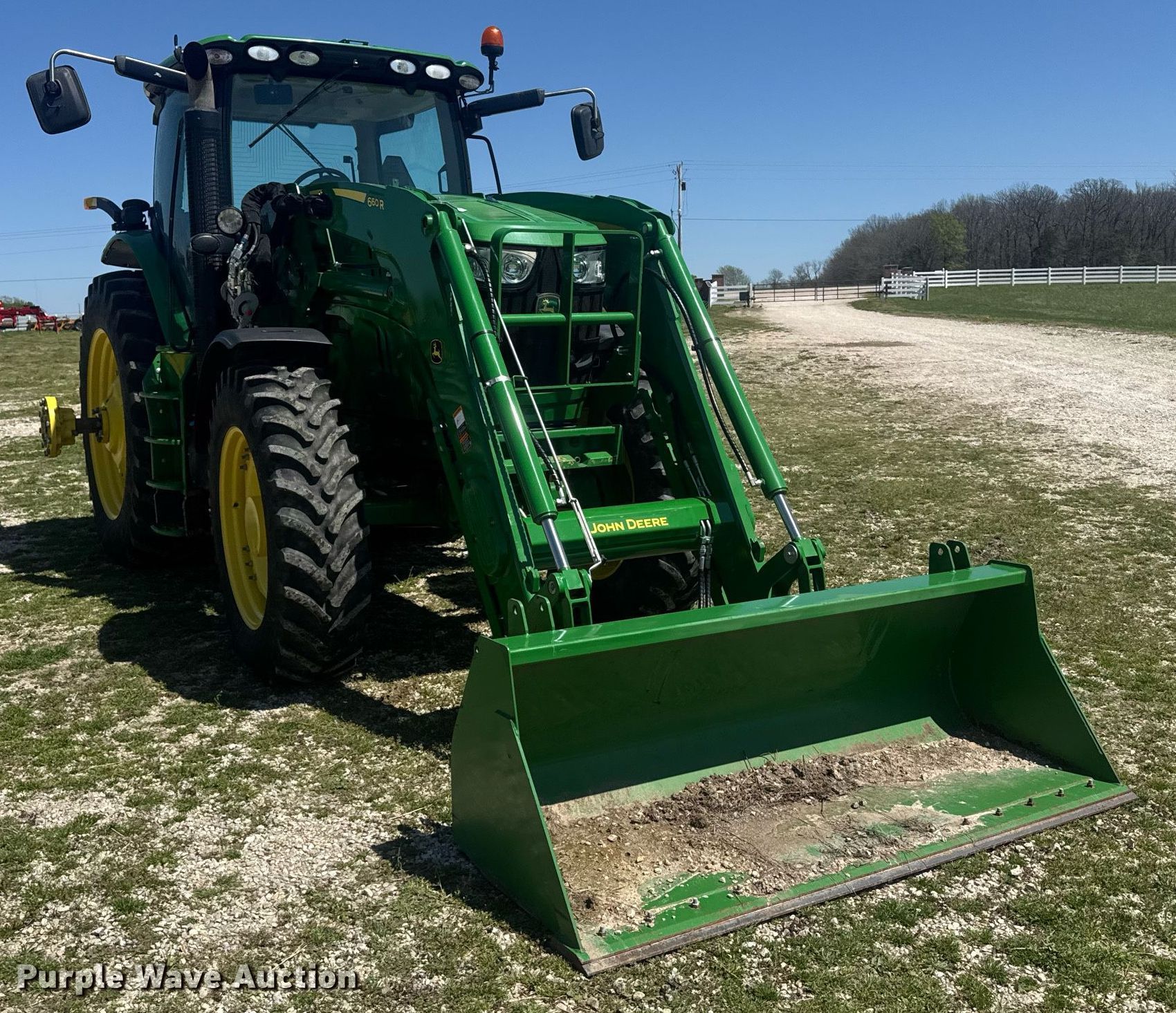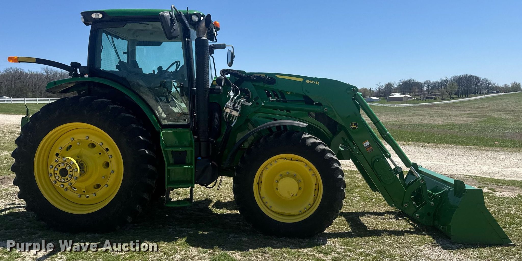 2014 John Deere 6190R MFWD tractor. Hours: 1,513 on meter, Serial: 1RW6190RTED012565. Engine John Deere, Cylinders: 6, Fuel type: Diesel. Transmission IVT, Left-hand reverser, Differential lock. Operators station AC, Heat. Features PTO: 1 3/4" 1000, Three point Top link, Quick attach, Seven pin outlet, ISOBUS outlet, Hydraulic remote sets Rear: 4, Power beyond (hydraulics), Loader ready, Loader John Deere 660R, Quick attach, Controls: Joystick, Bucket Width: 85".. Tires Front: 380/85R34, Rear: 480/80R46, Wheel weights: 2, Duals. Notes Duals removed, but included. Pursuant to Missouri law, Purple Wave will not be collecting sales taxes on any of the purchases made in this business liquidation auction.. M3 Hilltop Ranch Retirement - Open Inspection May 13th. 3939 Missouri 125. Rogersville, MO 65742