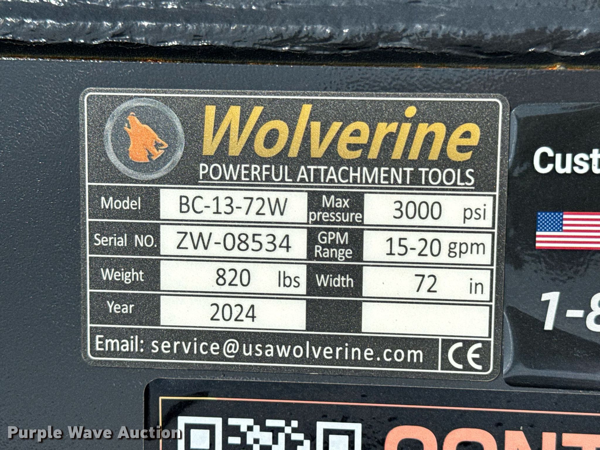 Purple Wave is selling a used Skid Steer Attach. in Kansas. This item is a 2024 Wolverine BC-13-72W skid steer rotary mower with the following: Serial: ZW-08534, Width: 72"