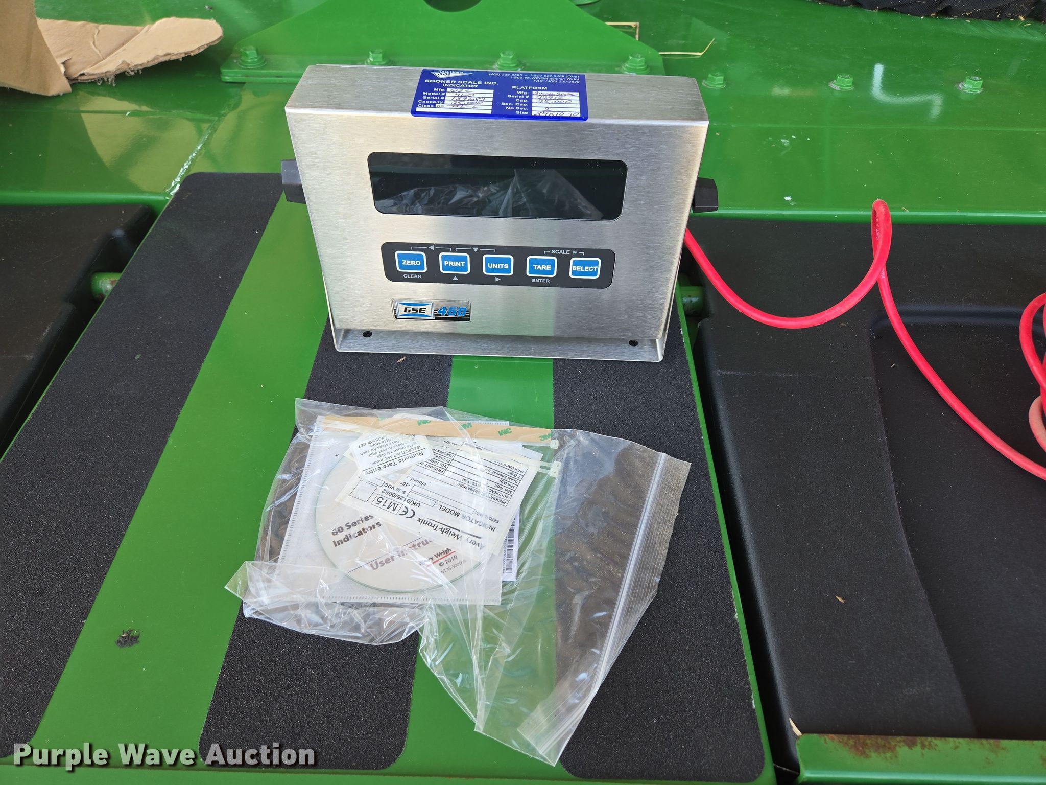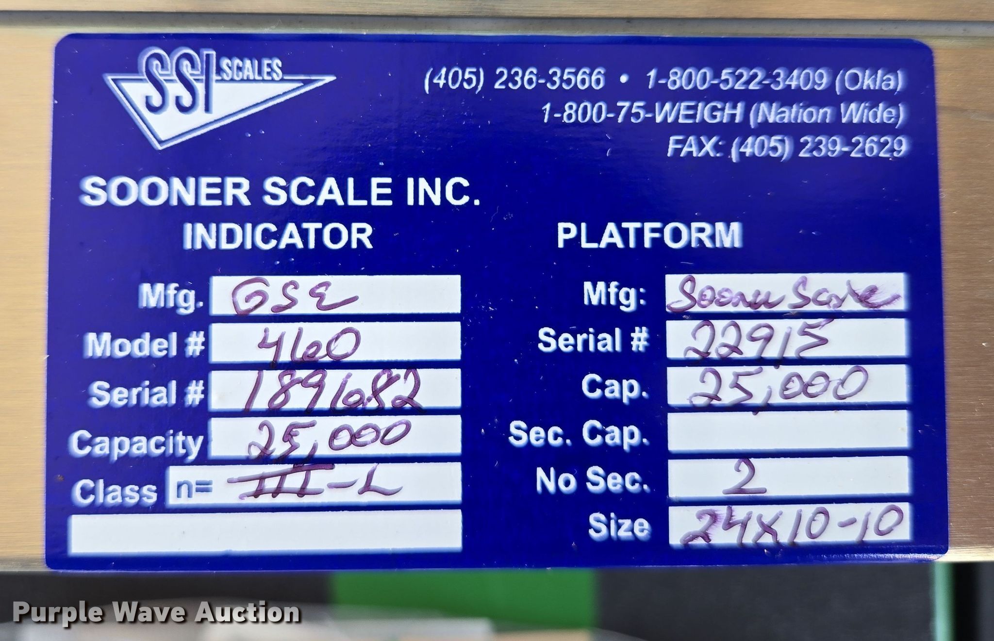 SSI Sooner Scale 2510-10 scale. Serial: 22915. Features Capacity: 25,000 lbs, Floor Length: 23' 10", Floor Width: 110.5", Scale monitor GSE 460, Serial: 189682. Notes Unknown operating condition. Pursuant to Missouri law, Purple Wave will not be collecting sales taxes on any of the purchases made in this business liquidation auction.. M3 Hilltop Ranch Retirement - Open Inspection May 13th. 3939 Missouri 125. Rogersville, MO 65742