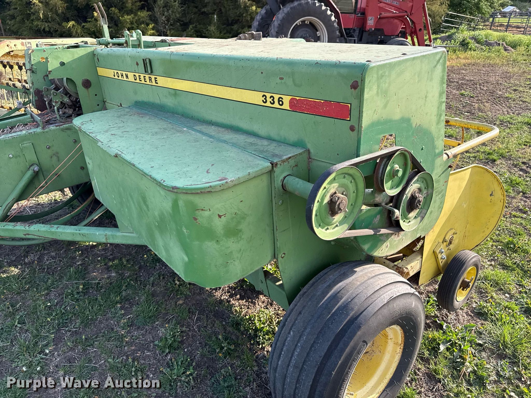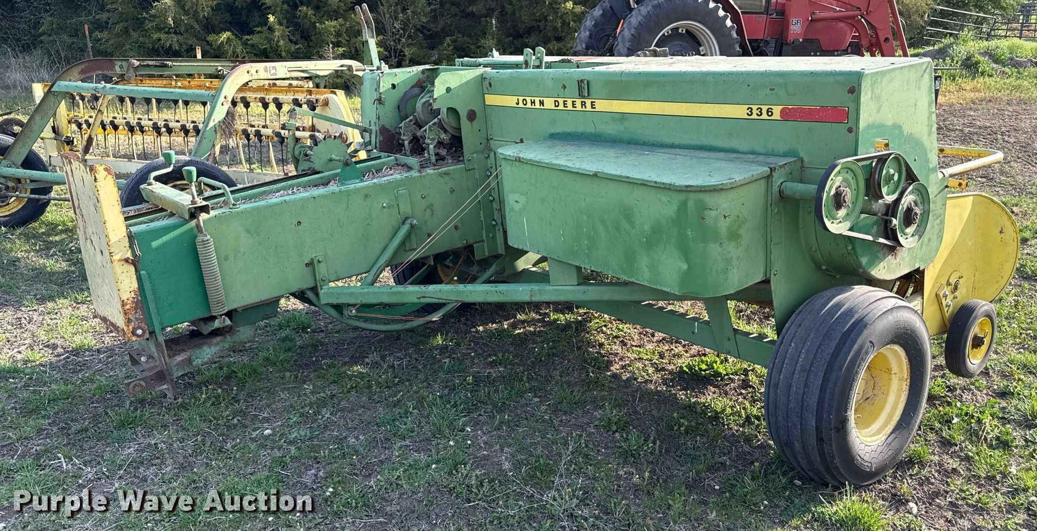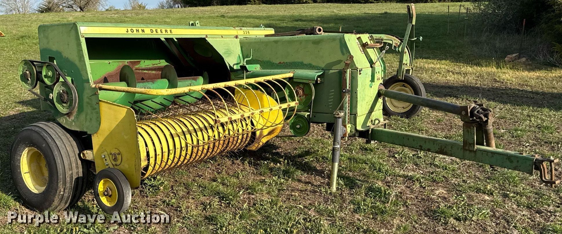 Purple Wave is selling a used Square Baler in Kansas. This item is a John Deere 336 small square baler with the following: PTO: 540, Gauge wheels, Pickup width: 55", Small square bale size: 14"x18", Knotters, Twine tie, Bale chute