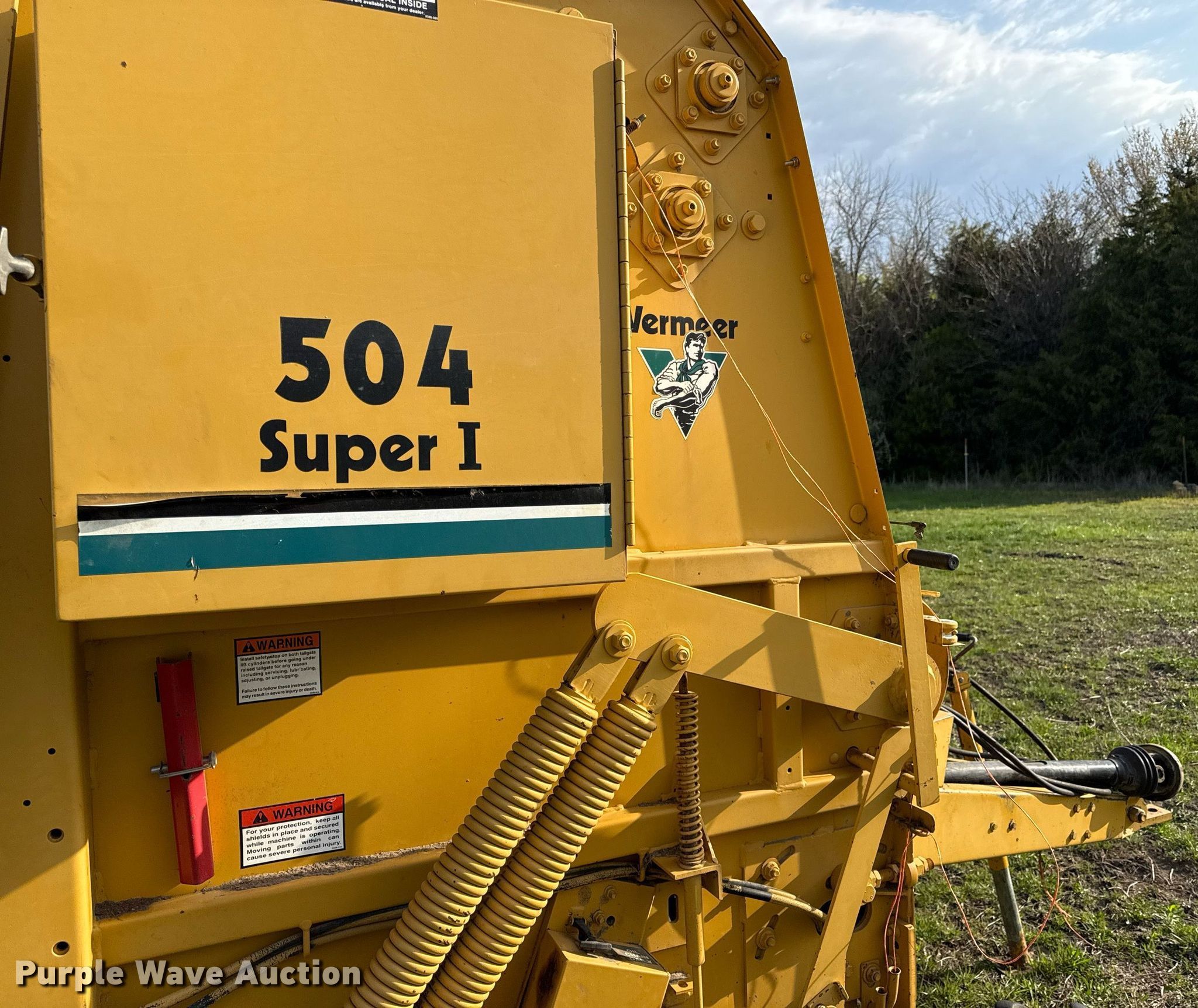 1995 Vermeer 504I round baler. Serial: 1VRA111S8S1003877. Features PTO: 540, Gathering wheels, Pickup width: 48", Bale size: 4'x5', Twine tie, Bale ramp. Tires Size: 11L-15. Cronister Farms. Auburn, KS 66402