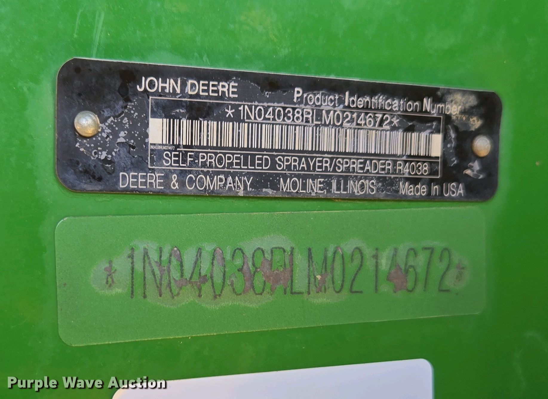 Take a look at this used 2021 John Deere R4038 sprayer being sold on May 14th, 2025 in the SOLD! May 14 Ag Equipment Auction made by John Deere. Take a look at all of the item information below or take a look at similar auctions for Applicators.
