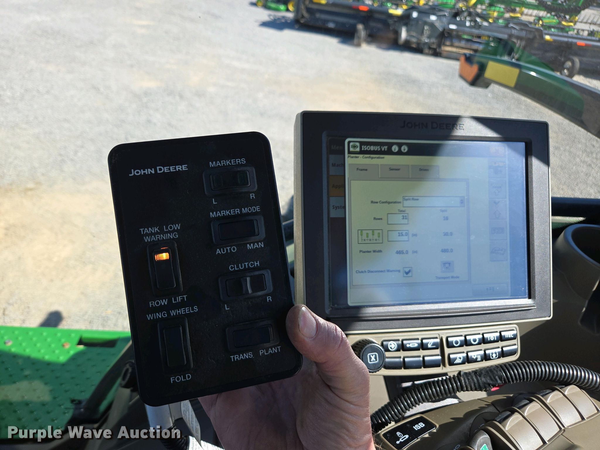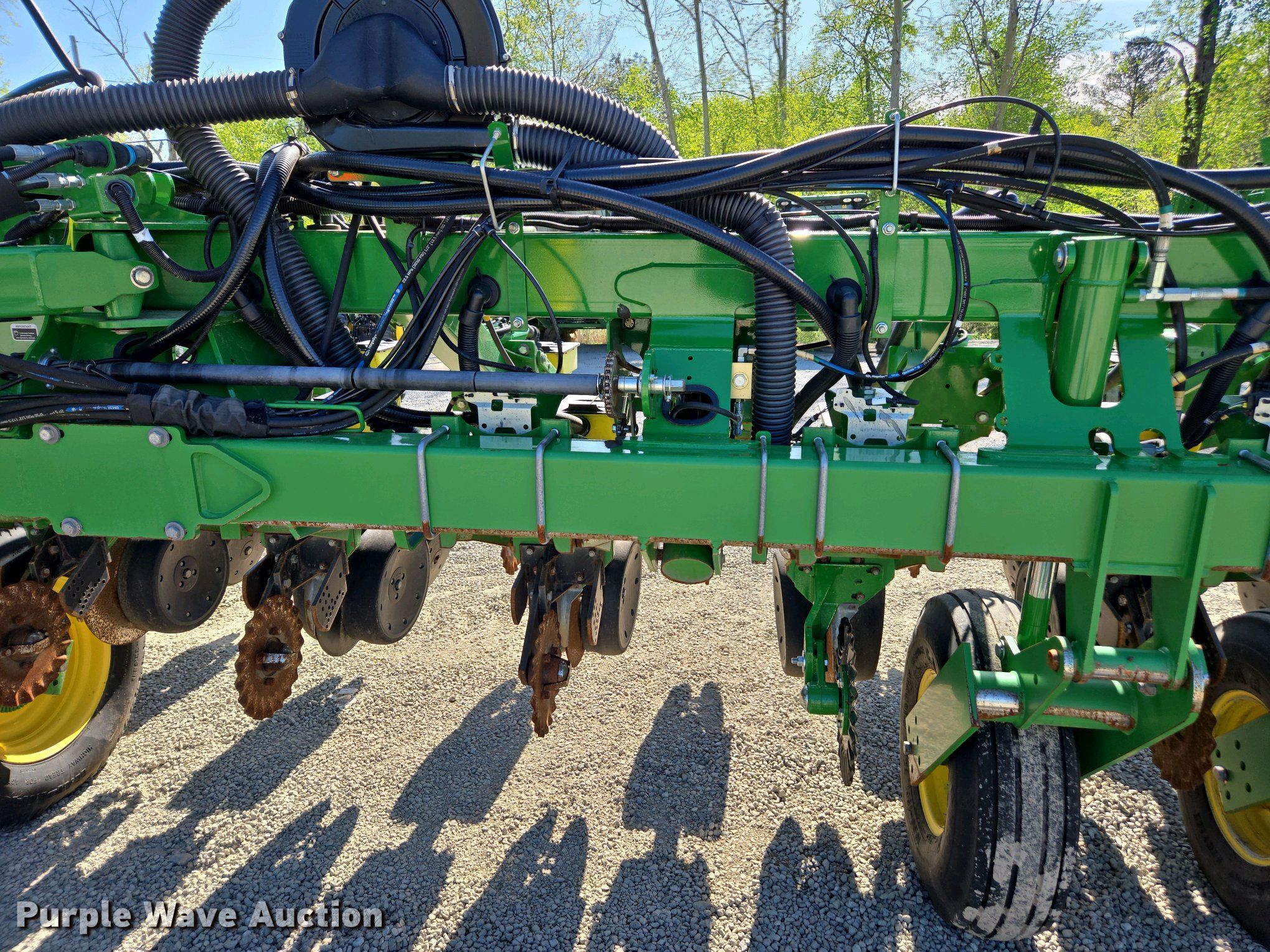 2016 John Deere 1795 split row no-till planter. Row units: 16, Row spacing: 30", Serial: 1A01795CEFA765173. Features Frame Hitch: Two point, Split row units: 31, Split row spacing: 15", Marker arm, Fold type: Front, Seed delivery Bulk fill system, Row units Vacuum metering, Meter drive: Hydraulic, Seed meters: Soybeans, Down pressure: Pneumatic, No-till coulters, Disk openers: Double, Gauge wheels: Double, Closing system: Double Type: Rubber.. Tires Transport tire size: 11-22.5 Quantity: 4, Drive/ outside tire size: 10.00-15 Quantity: 4. Notes Monitor not included. TriGreen Equipment. Athens, AL 35613